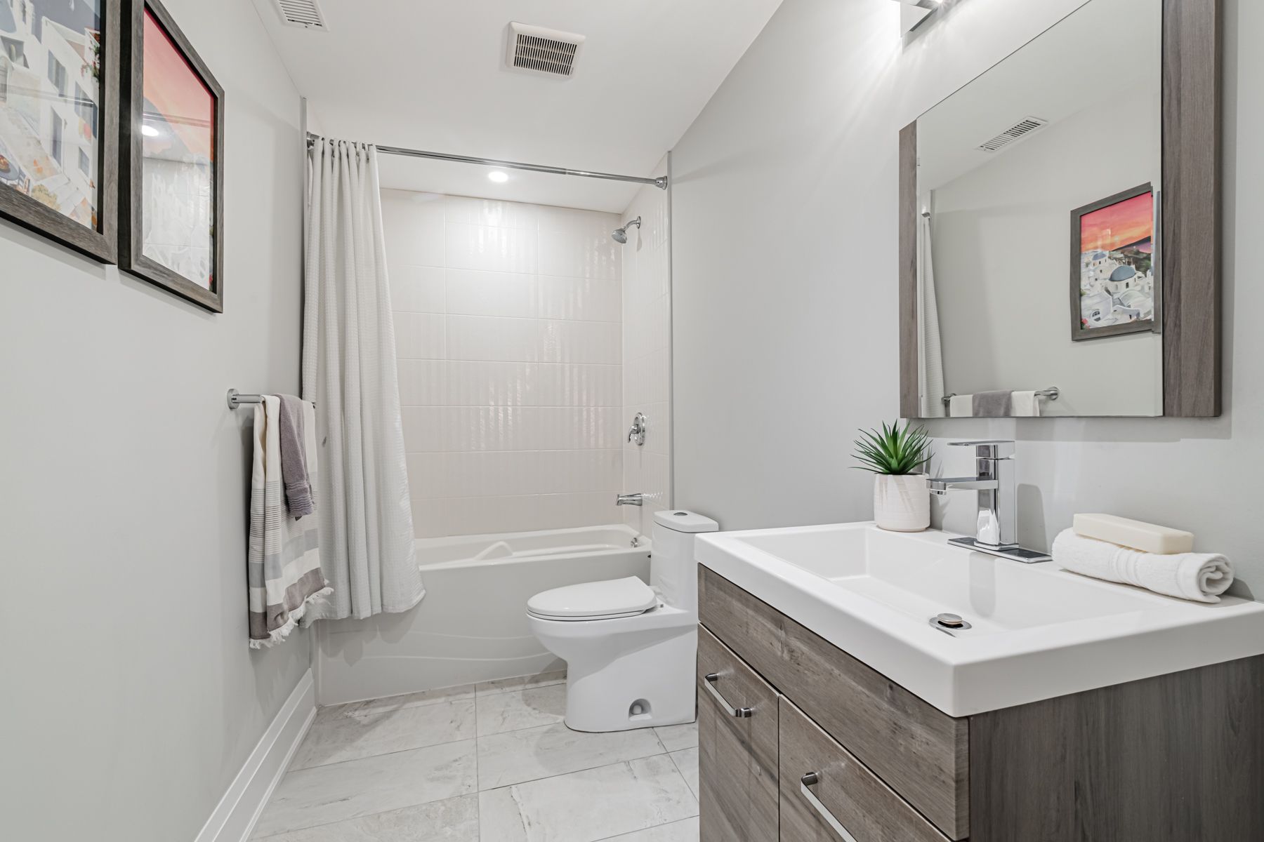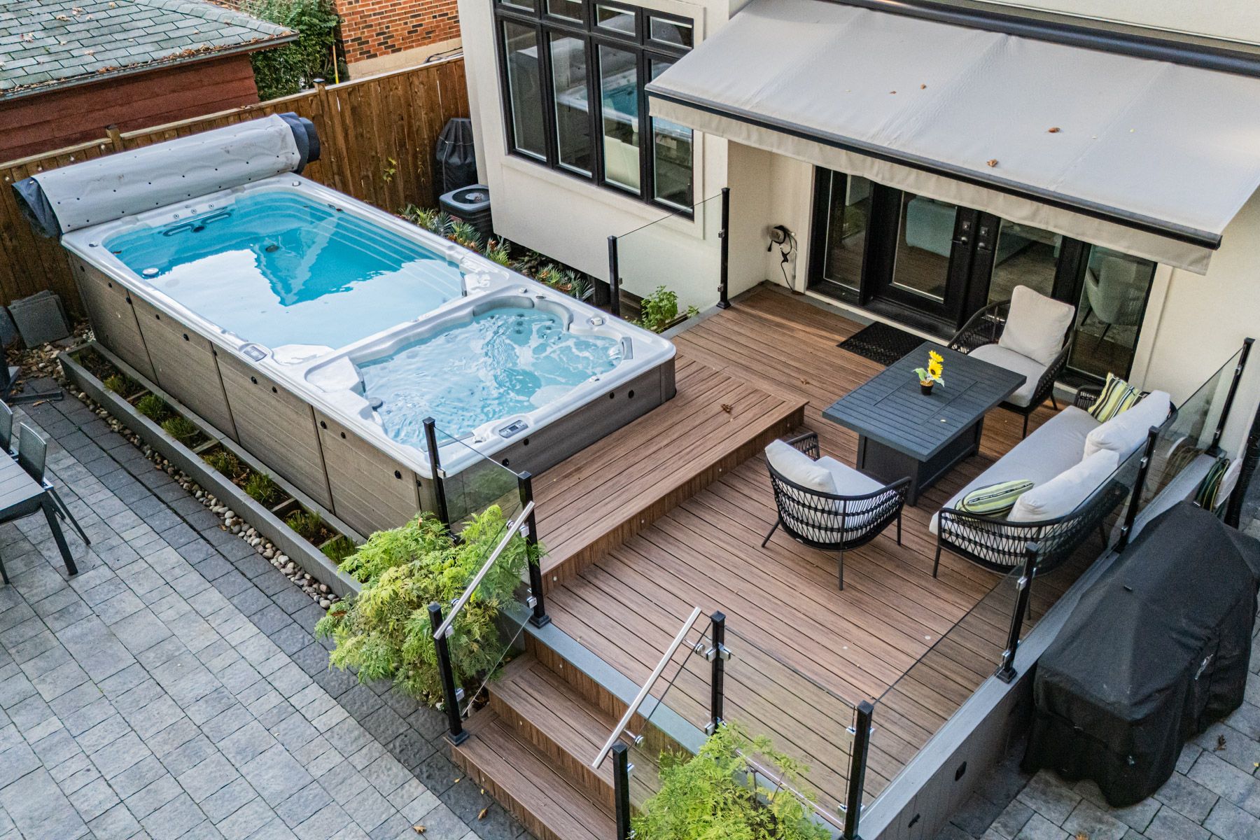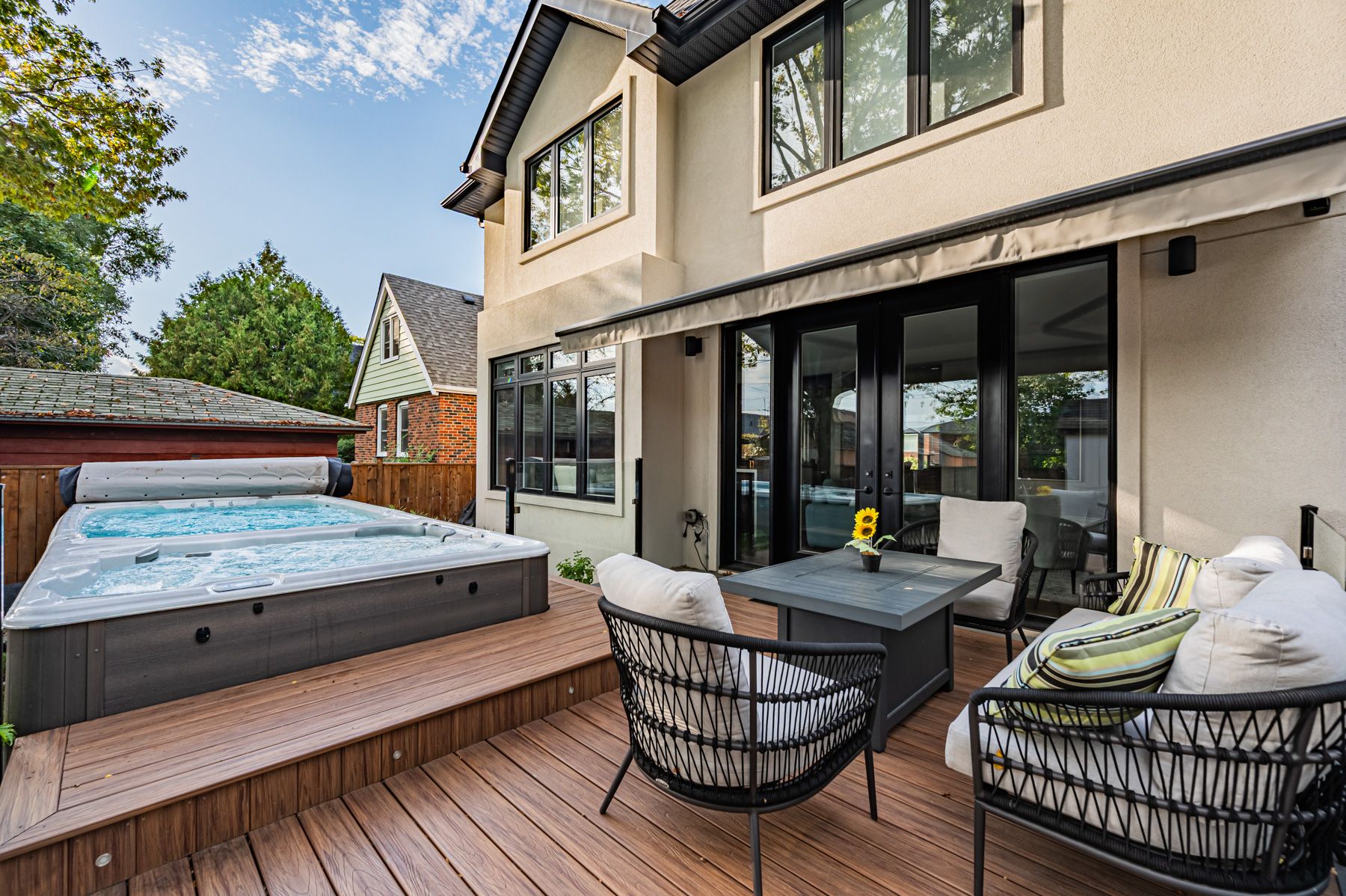 Set on a wide 40-foot lot in sought-after topham park, this custom-built home offers exceptional scale, privacy, and modern comfort plus an extraordinary backyard sanctuary. High ceilings and expansive rooms fill the home with light, creating an inviting sense of space throughout. The main floor is designed for daily routines and effortless entertaining, with elegant living and dining areas & a powder room. The show-stopping kitchen features a walk-through pantry/dry bar, sunny breakfast area, oversized quartz waterfall island, and premium dacor appliances including a gas stove. Relax fireside in the handsome family room and step out to a backyard that defines luxury living, complete with year-round heated swim spa & hot tub, upgraded composite deck with glass railings and motorized awning, plus a lower garden retreat with mini putting green, outdoor tv lounge, and dining area. Upstairs, every bedroom has an ensuite. The king-sized primary boasts a custom walk-in closet and dreamy spa-like bath with dual vanity, freestanding tub, and oversized shower. A large skylight illuminates the upper level, and convenient second-floor laundry adds everyday ease. The fully finished lower level, accessible via a side entrance, is ready for movie nights and includes space for a home gym & office, plus a fifth bedroom, full bath, and abundant storage. A rough-in for a second laundry room, high-efficiency mechanicals, and dual sump pumps provide added flexibility and peace of mind. Smart upgrades include automated blinds, usb ports, and a tesla/electric vehicle charger in the built-in garage. Beautiful landscaping and interlock paving enhance curb appeal. Move-in ready and close to the dvp, transit incl ttc crosstown, schools, shopping, dining, parks and nature trails. This is more than a house; it's a place where lifelong memories are made.