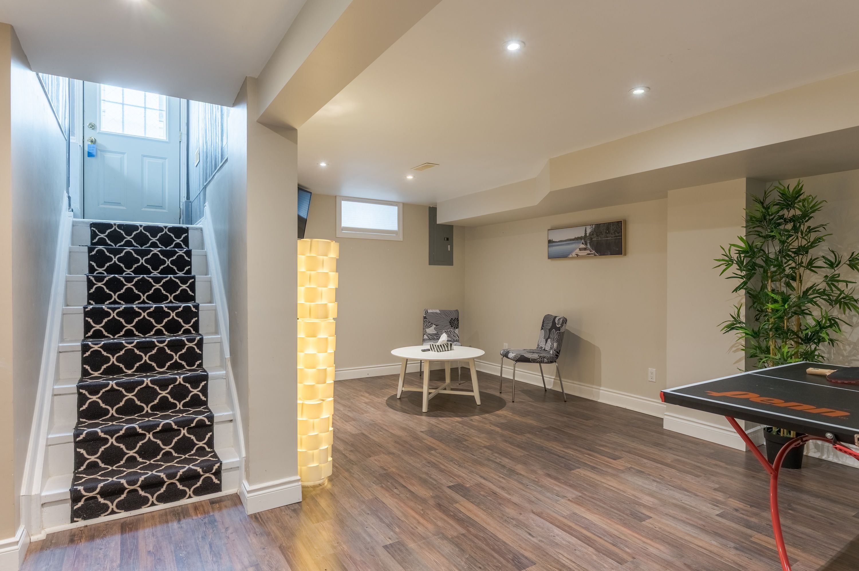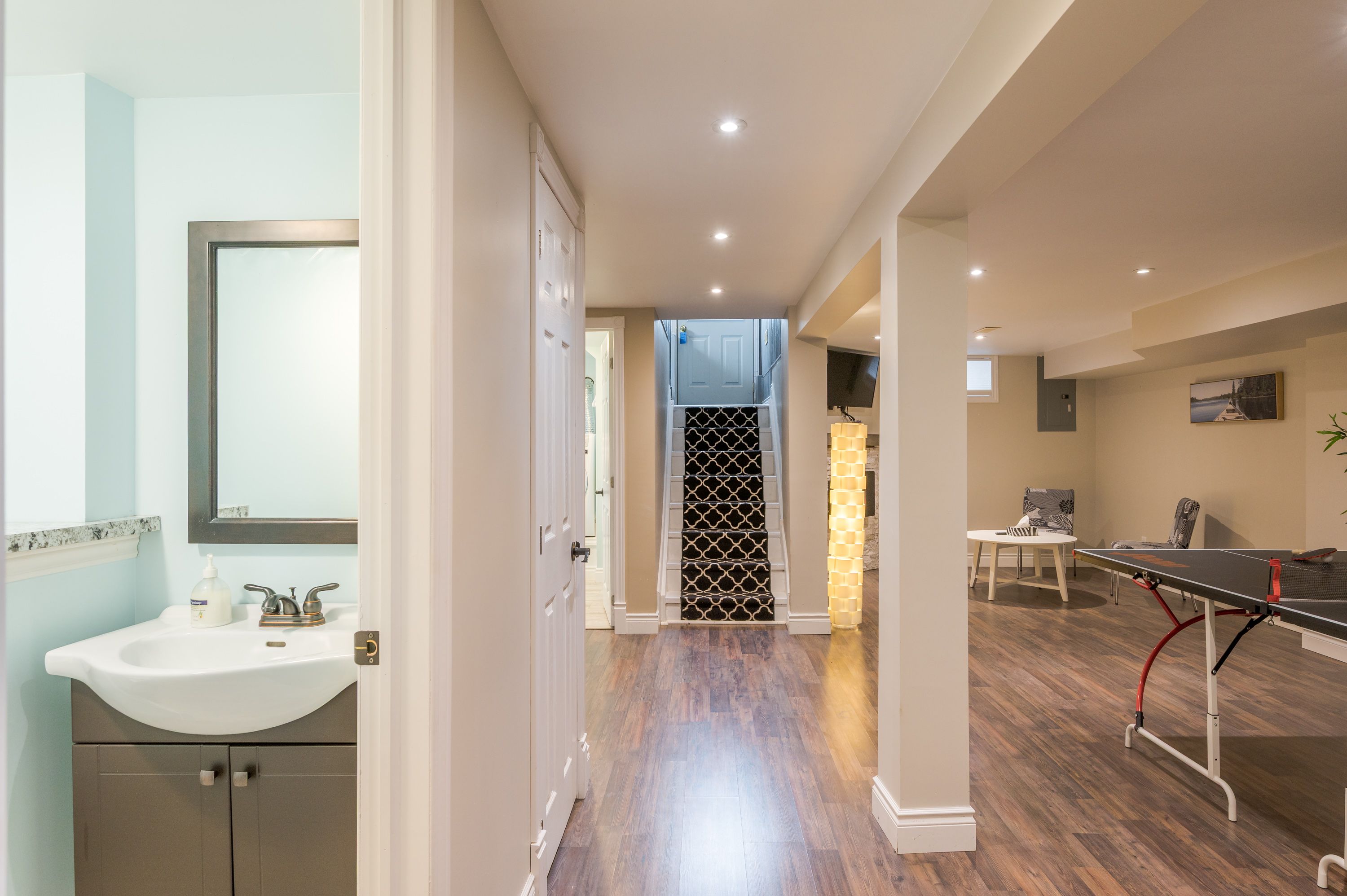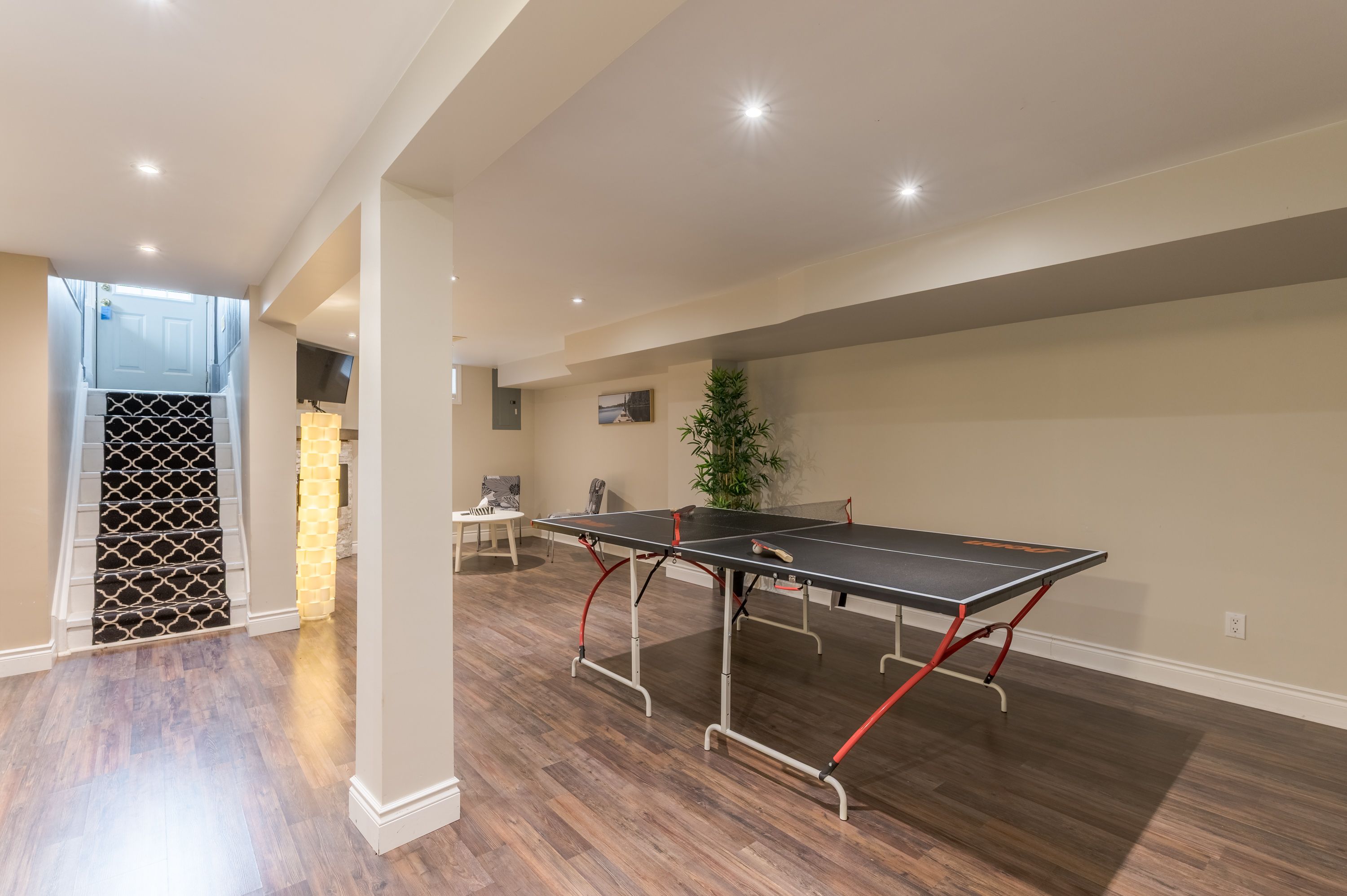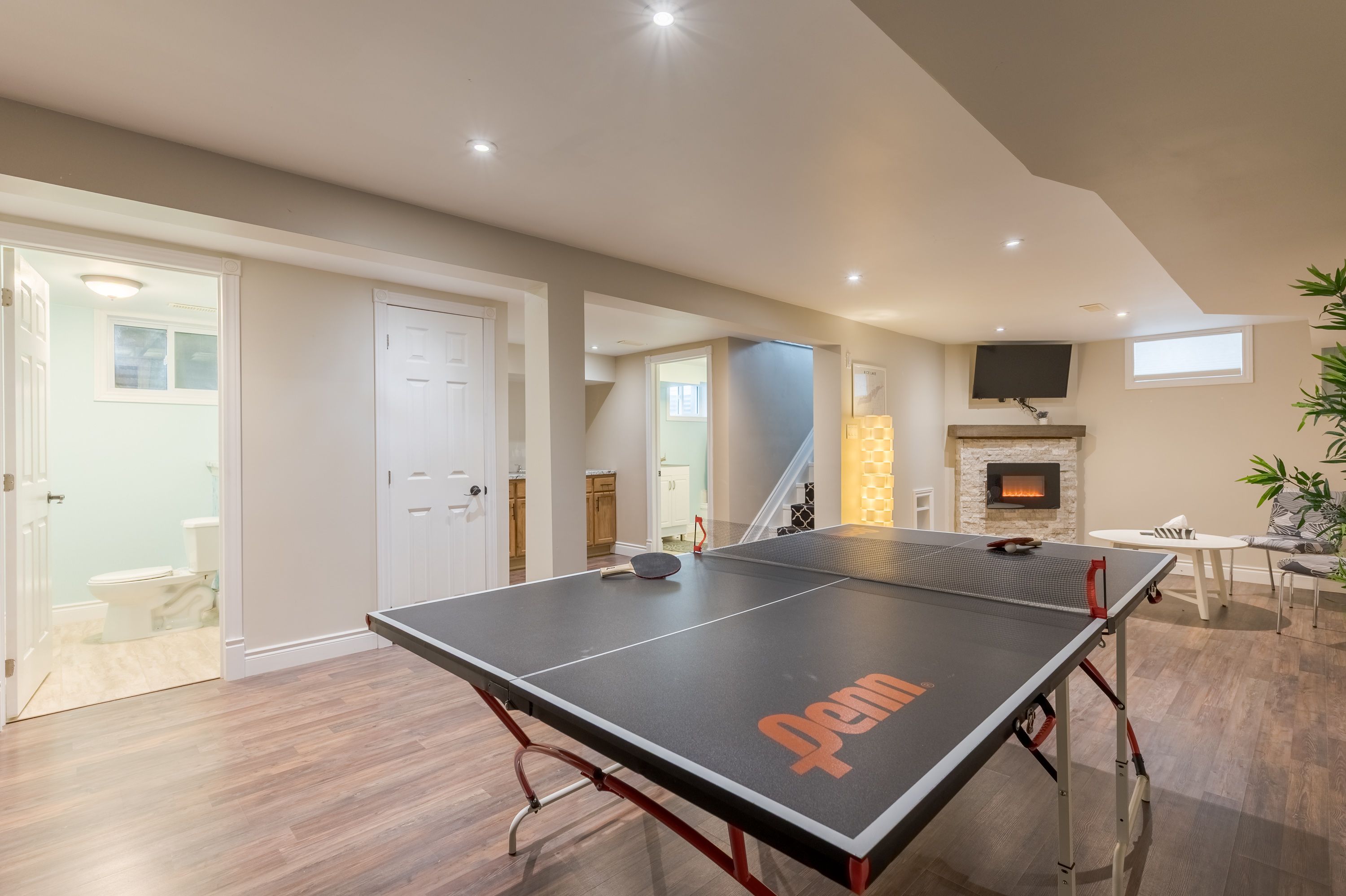 • Finished basement includes family room, wet bar, and additional bedroom.