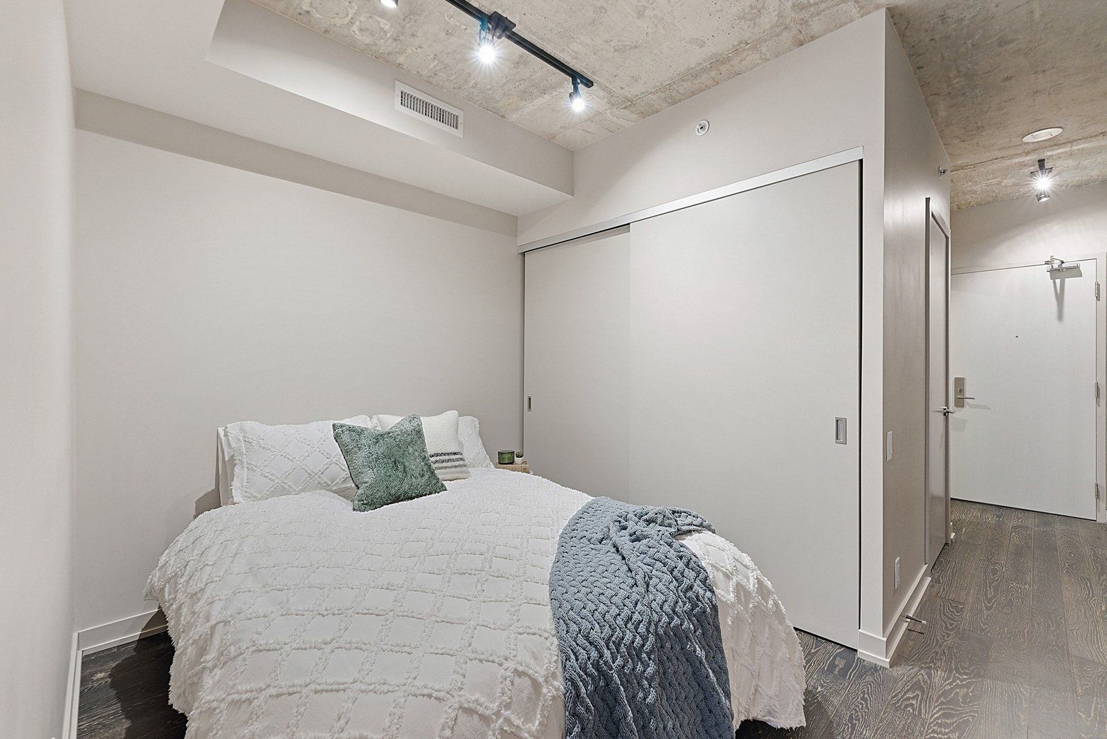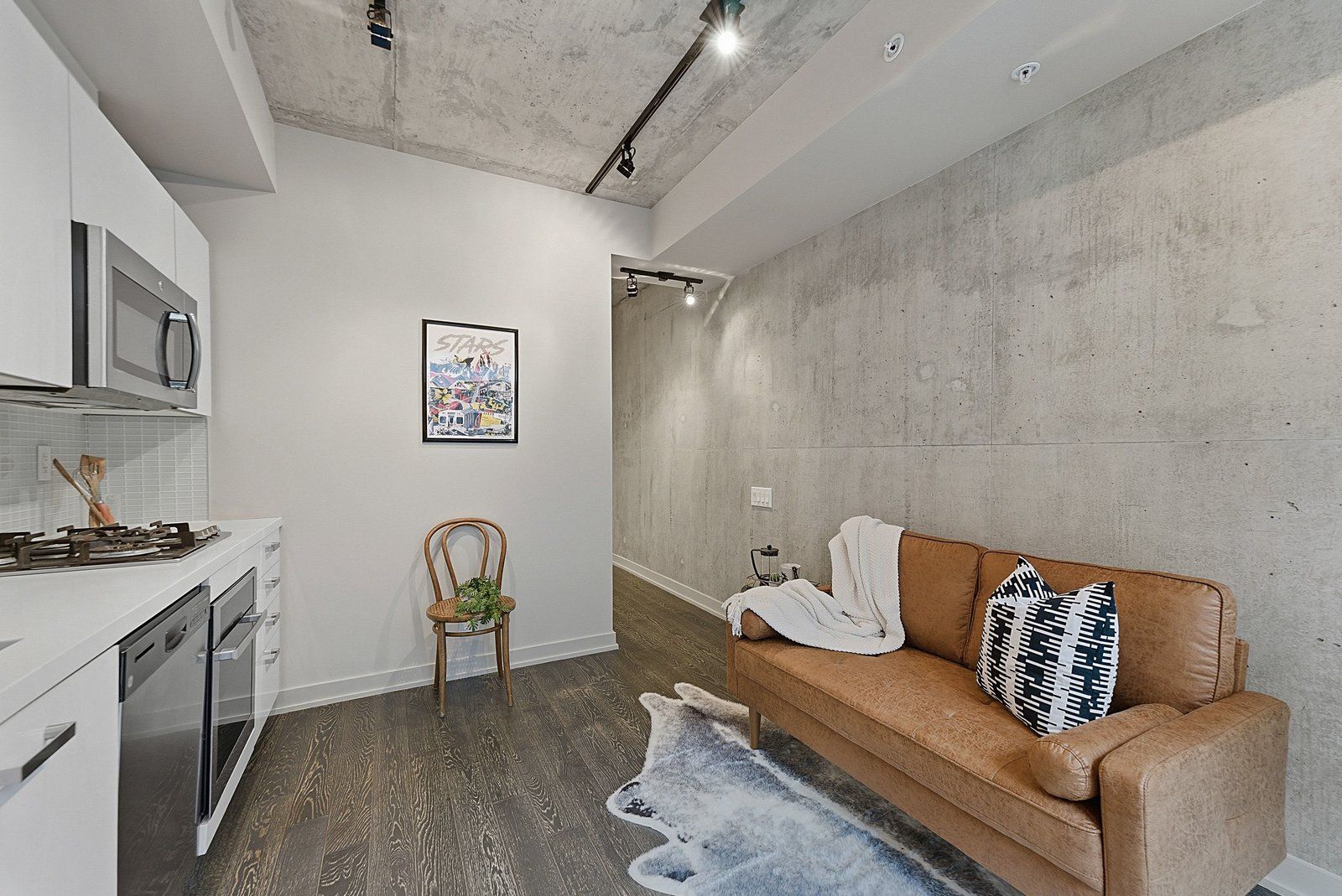 Welcome to suite 416 at 39 brant street, a boutique loft-style condo in the heart of toronto's fashion district. This stylish sanctuary features authentic exposed concrete walls, soaring nine-foot ceilings, and floor-to-ceiling south-facing windows that flood the space with natural light. The meticulously planned layout features zero wasted space, including two closets and a tranquil sleeping area. The sleek modern kitchen is anchored by white quartz counters and a rare gas stove, perfect for cooking enthusiasts. Enjoy a lifestyle supported by world-class anchors: grab coffee from impact kitchen downstairs, explore the greenery of st. Andrew's playground park across the street, or visit waterworks food hall and othership, all just steps away. Equipped with ensuite laundry and benefiting from low maintenance fees, this turnkey suite is an ideal opportunity for first-time buyers, investors, or professionals. This is the gold standard of modern loft living in king west.
