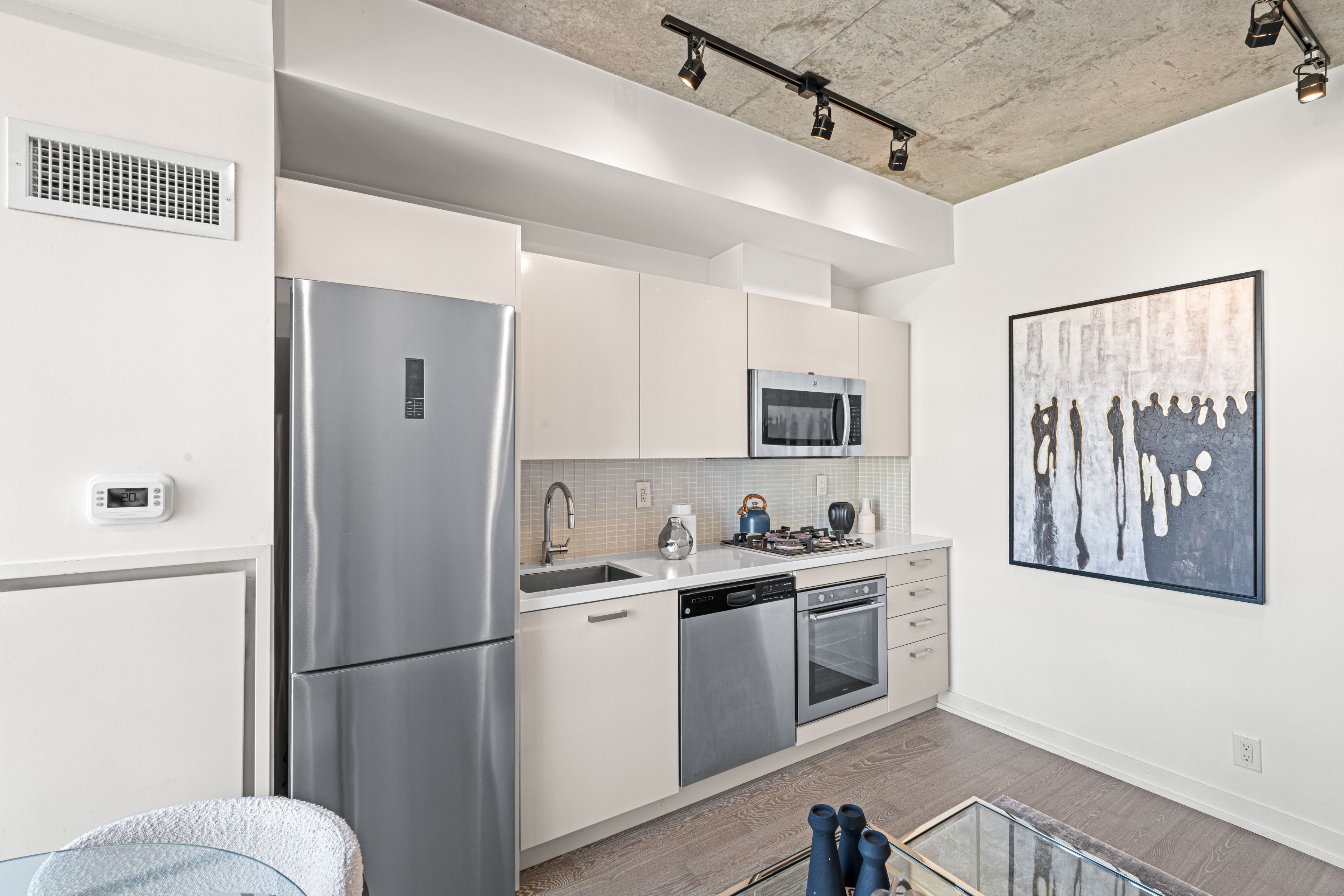 Perfectly located between king west and queen west, 39 brant street offers one of downtown toronto's most vibrant and convenient lifestyles. St. Andrews playground park sits directly across the street, while the iconic ace hotel toronto next door features a renowned rooftop with skyline views. Just steps to the well, grocery stores, neighbourhood clinics, restaurants, cafes, and bars along king street west, with easy access to the 510 and 504 streetcars and a short walk to osgoode station and st. Andrew station. This boutique loft-style suite in the fashion district features exposed concrete walls, 9ft ceilings, and floor-to-ceiling north-facing windows that fill the space with natural light. The smart, open layout offers a tranquil sleeping area with two closest and a modern kitchen with quartz counters and a rare gas stove. Ensuite laundry and low maintenance fees complete this turnkey opportunity for first-time buyers, investors, or professionals seeking stylish king west living.