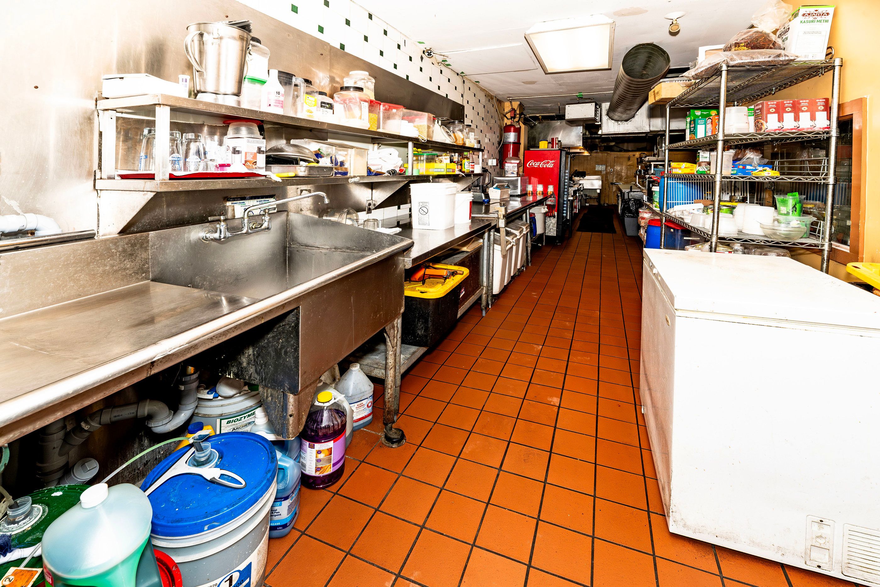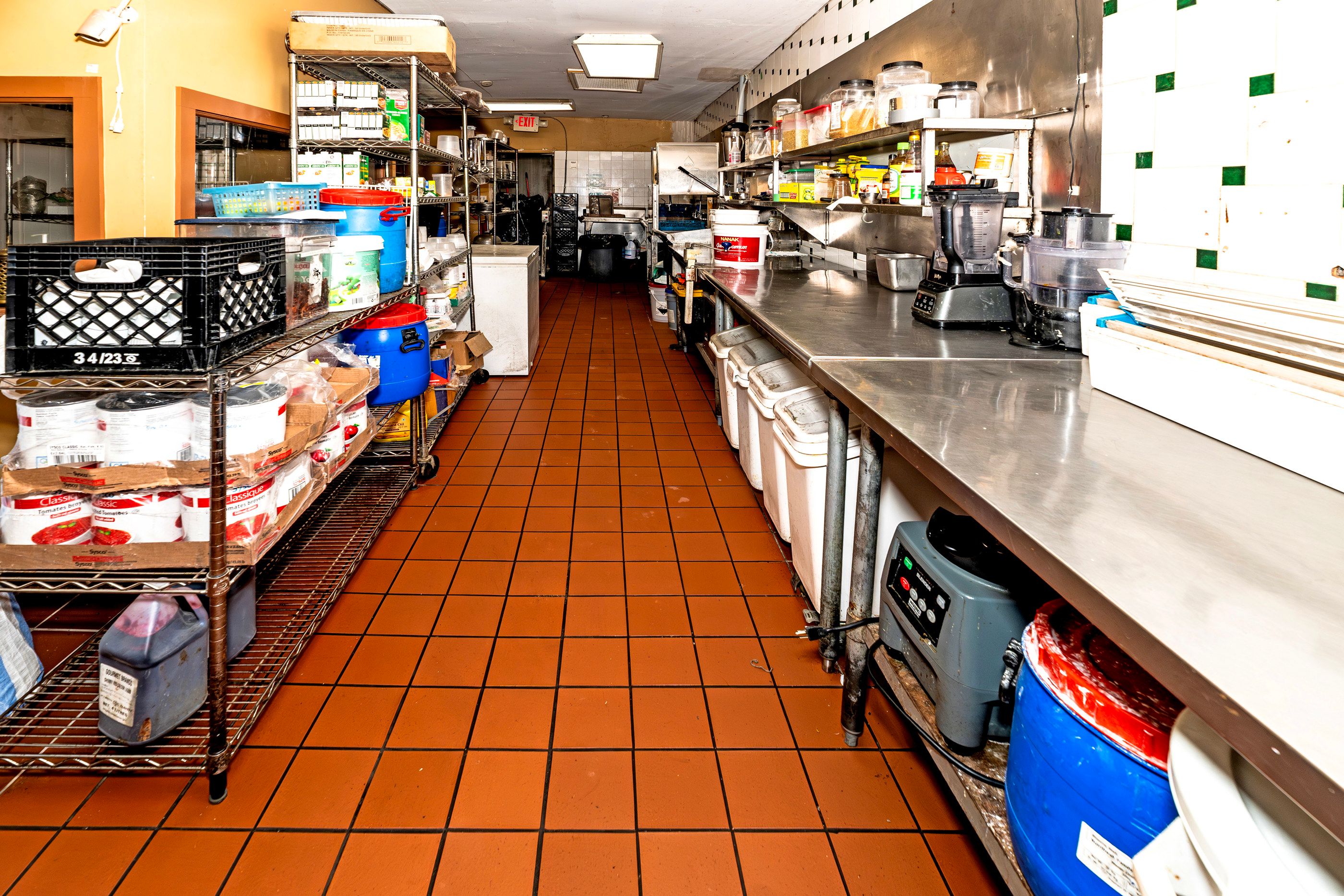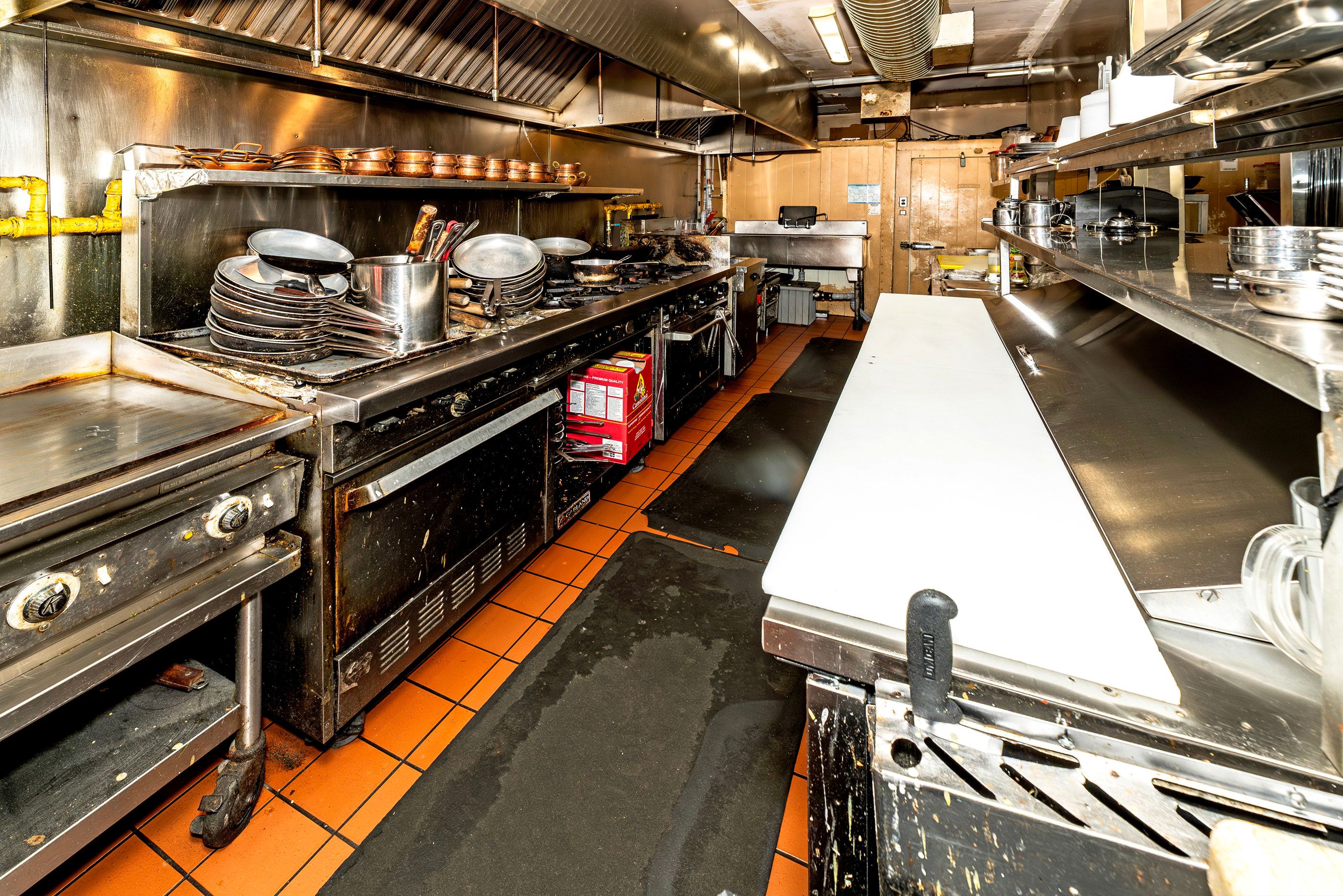 • Well-equipped commercial kitchen featuring an impressive 18-foot ceiling.