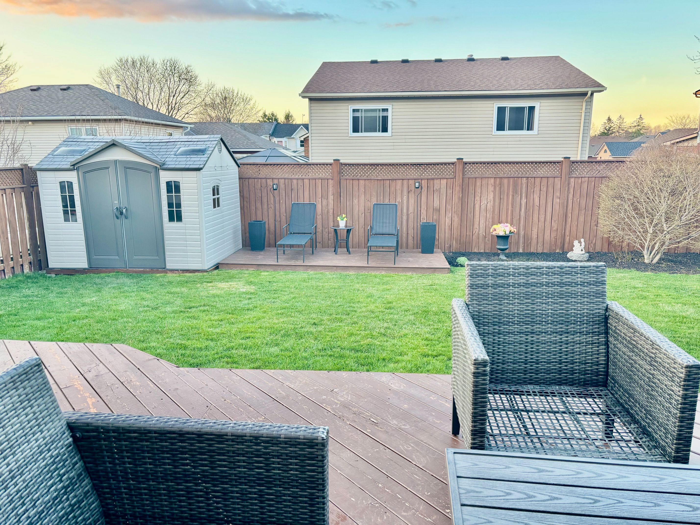 • Landscaped backyard features a two-tiered deck in a fully fenced yard.