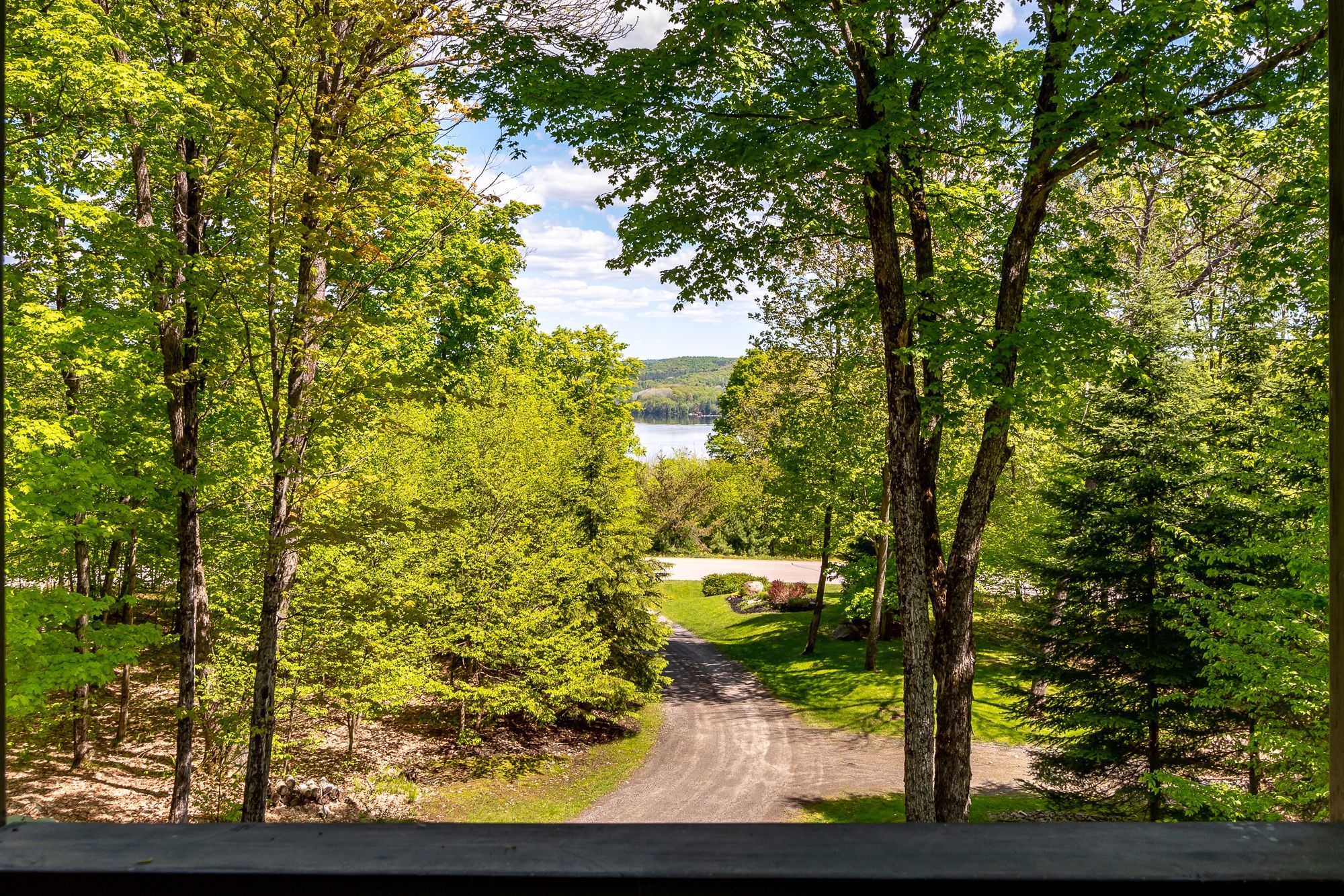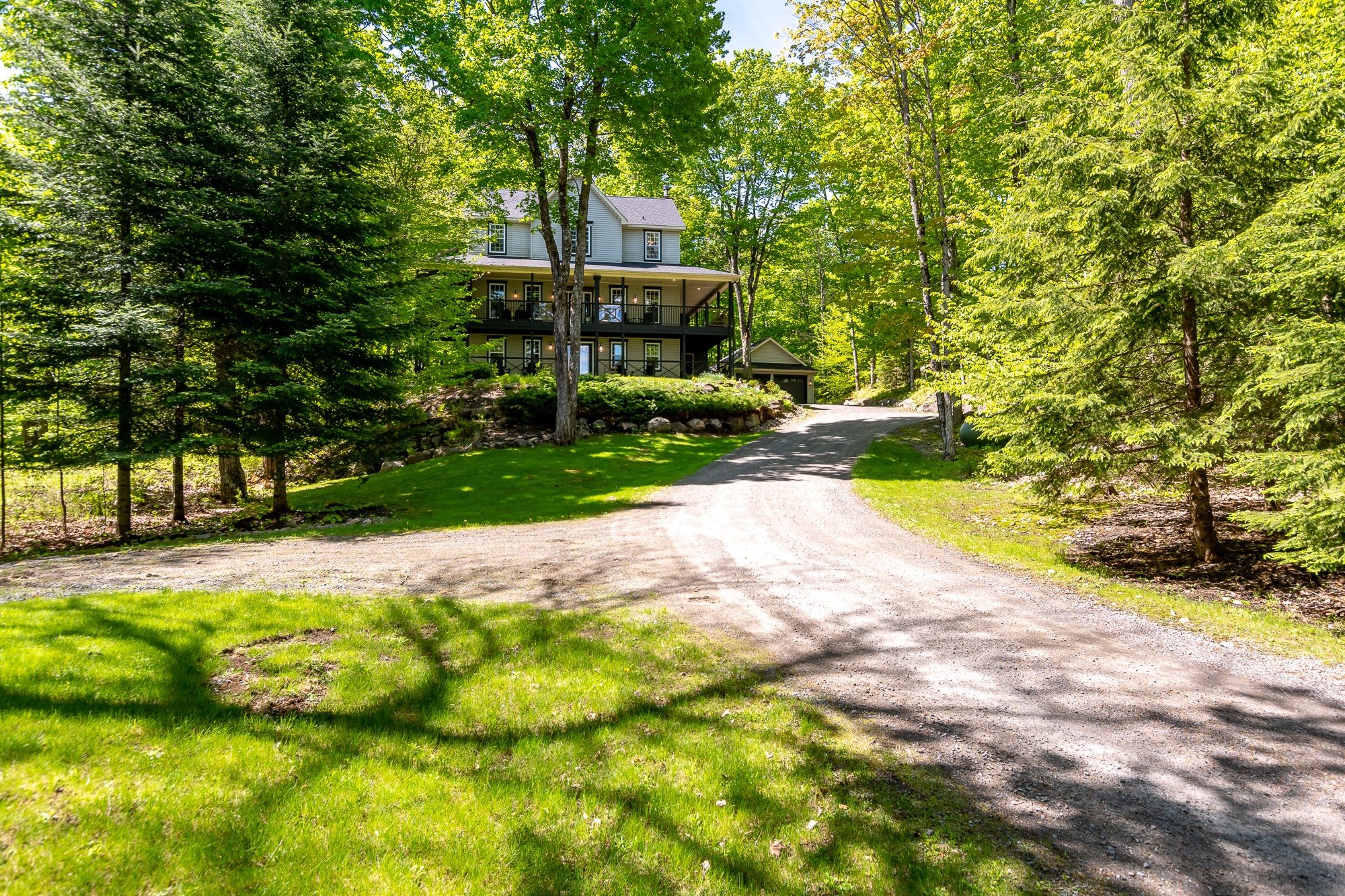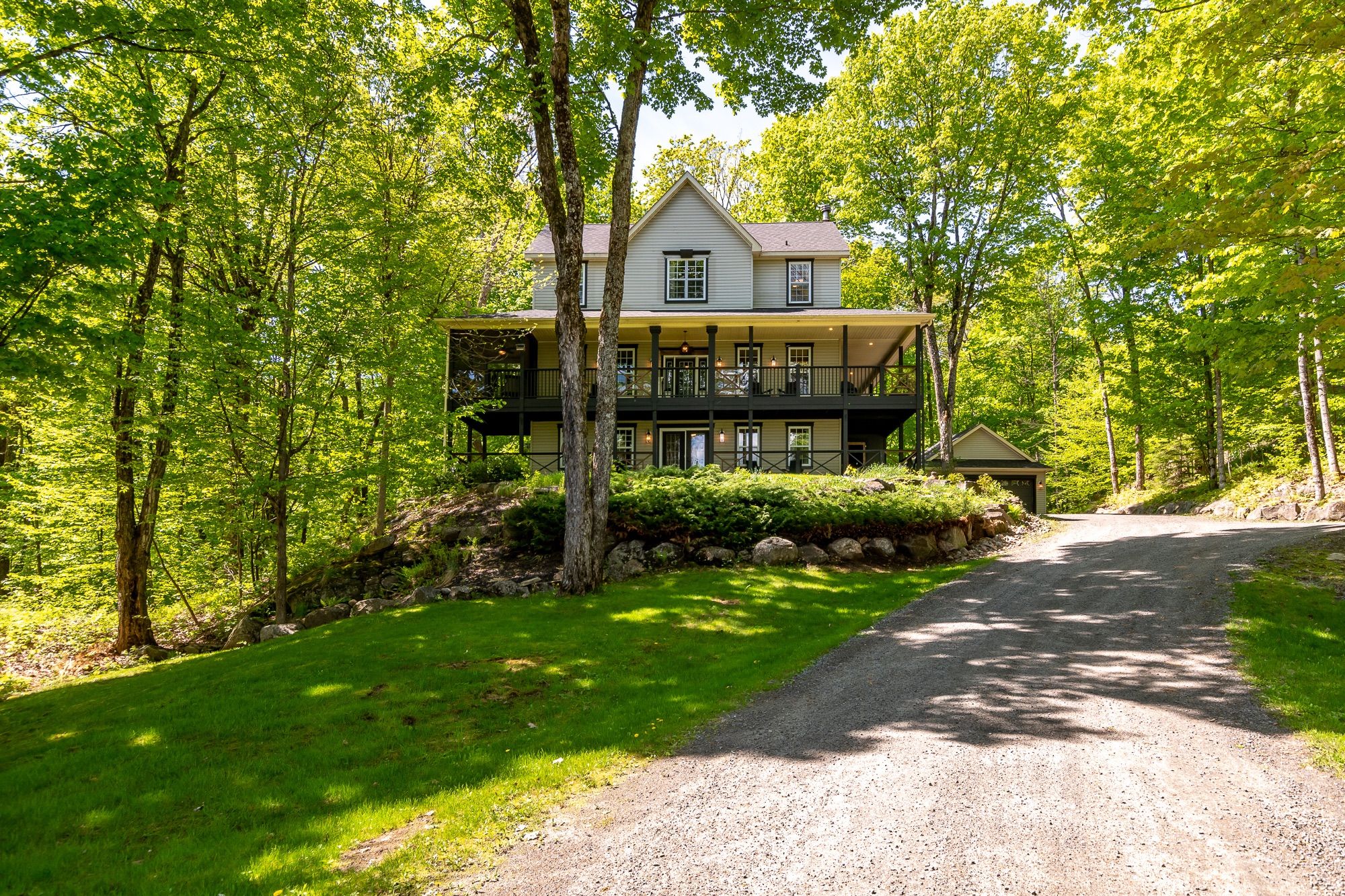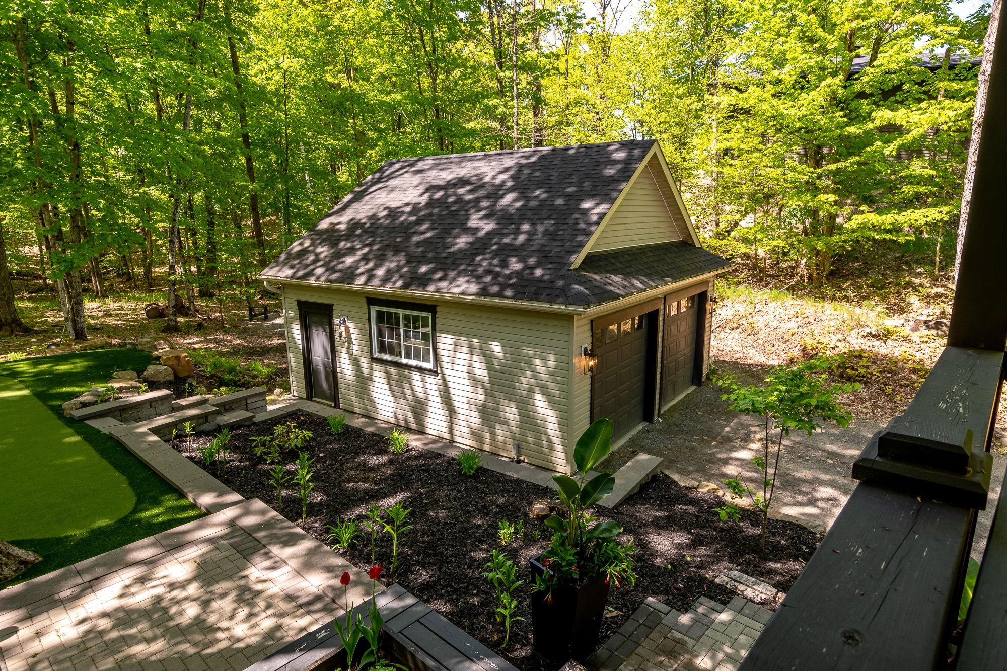 Tucked into the peaceful woodland heights community, this striking executive home offers the perfect blend of privacy, space, & refined living. A meandering driveway winds past lush, irrigated gardens, arriving at a home that immediately impresses with its stately wraparound porch, abundant parking, & detached double garage. Surrounded by tall trees, this property is ideal for those seeking a quiet retreat just minutes from town conveniences. Inside, the home spans 3 thoughtfully designed levels. The main floor is bright & inviting, with large windows drawing the surrounding woods in from every angle. The living room, anchored by a classic wood-burning fireplace, opens to generous dining & office spaces, all flowing effortlessly into a showpiece kitchen. Perfect for the passionate cook or the frequent host, it features an oversized island with a prep sink & teppanyaki grill, a stove with propane cooktop, pot filler tap, granite countertops, & tons of room for gathering with friends & family. A screened-in porch offers a peaceful transition between indoors & out, while the expansive wraparound porch invites you to linger & take in the captivating view of peninsula lake, beautifully framed by mature trees. A convenient 2pc powder room completes the main floor. Upstairs, 2 bright guest bedrooms, currently merged, share a 4pc bath. The spacious primary suite offers a private retreat with a 5pc ensuite & a large dressing room that could easily convert to a 4th bedroom. The finished walkout basement adds even more versatility, with a large recreation room, home gym (or 5th bedroom), laundry, a 2pc washroom, & ample storage. Step outside & practice your short game on the private putting green, enjoy evenings around the fire pit, or unwind beside the tranquil water feature. Just minutes from multiple golf courses, a ski resort, & the nearby 140 ac nature sanctuary with 4 km of trails. This property offers the perfect backdrop for a life well-lived, indoors & out.