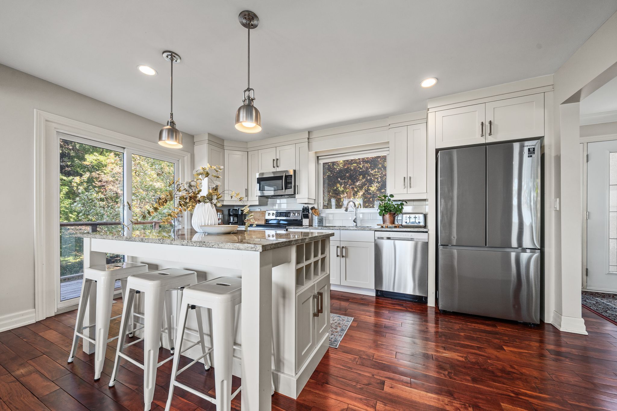 • Large kitchen with island, direct BBQ access, and ample storage.
