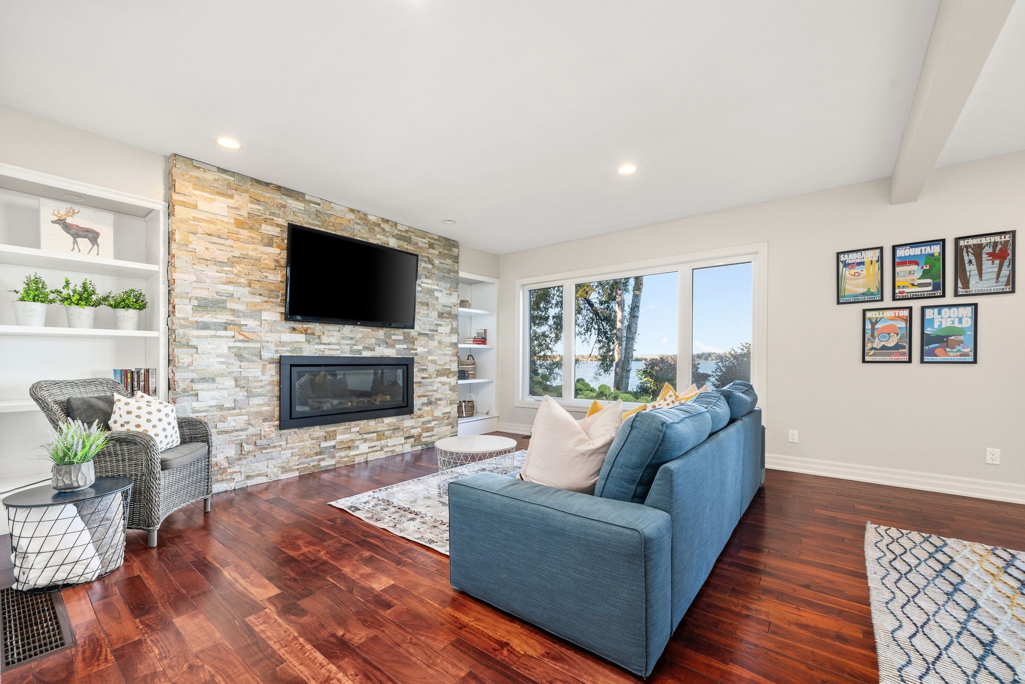 Nestled on the picturesque shores of the bay of quinte, this extraordinary residence presents an unparalleled opportunity to embrace waterfront living. With 3,000 square feet of well designed interior space, this hidden gem seamlessly marries both quiet luxury and casual comfort. Upon entering you are immediately struck by the beautiful light flooding in from every direction. The spacious living room is anchored by a stone fireplace and unmatched views. The dining area opens to the wrap around raised deck through patio doors and the bright and sunny kitchen with a sizeable island, ample cabinetry and direct access to the bbq. Tucked down the hall you will find 2 large guest rooms, main 4pc bath, a full guest suite with a walk in closet and 3pc ensuite. On the lower level, the spacious primary suite features direct access to the meticulously maintained lawns and gardens, a private 4pc ensuite with separate soaker tub and large shower. The bright, large games room with a stacked stone fireplace and matching bar area offer a seamless transition between indoor and outdoor living spaces making this the perfect location for entertaining large crowds or cuddling up for quiet movie nights. A 4th guest room, a 2pc bath, a large laundry room and a huge storage room under the garage fill out the lower level. The large bright windows and patio doors in the walkout lower level and direct access to the waterfront, allows natural light to flood the space. This versatile space adapts to the changing needs of modern families and could easily suite a multigenerational family. A stone shoreline that offers both step in shallow spaces and deep waters off the dock suitable for various water sports and activities. Tucked just off sought after rednersville road (cty rd 3) and located 6 mins to the bay bridge, 20 mins from highway 401, this extraordinary home allows you to be close to everything and still able enjoy the beaches and wineries that define the sought after 'county' lifestyle.