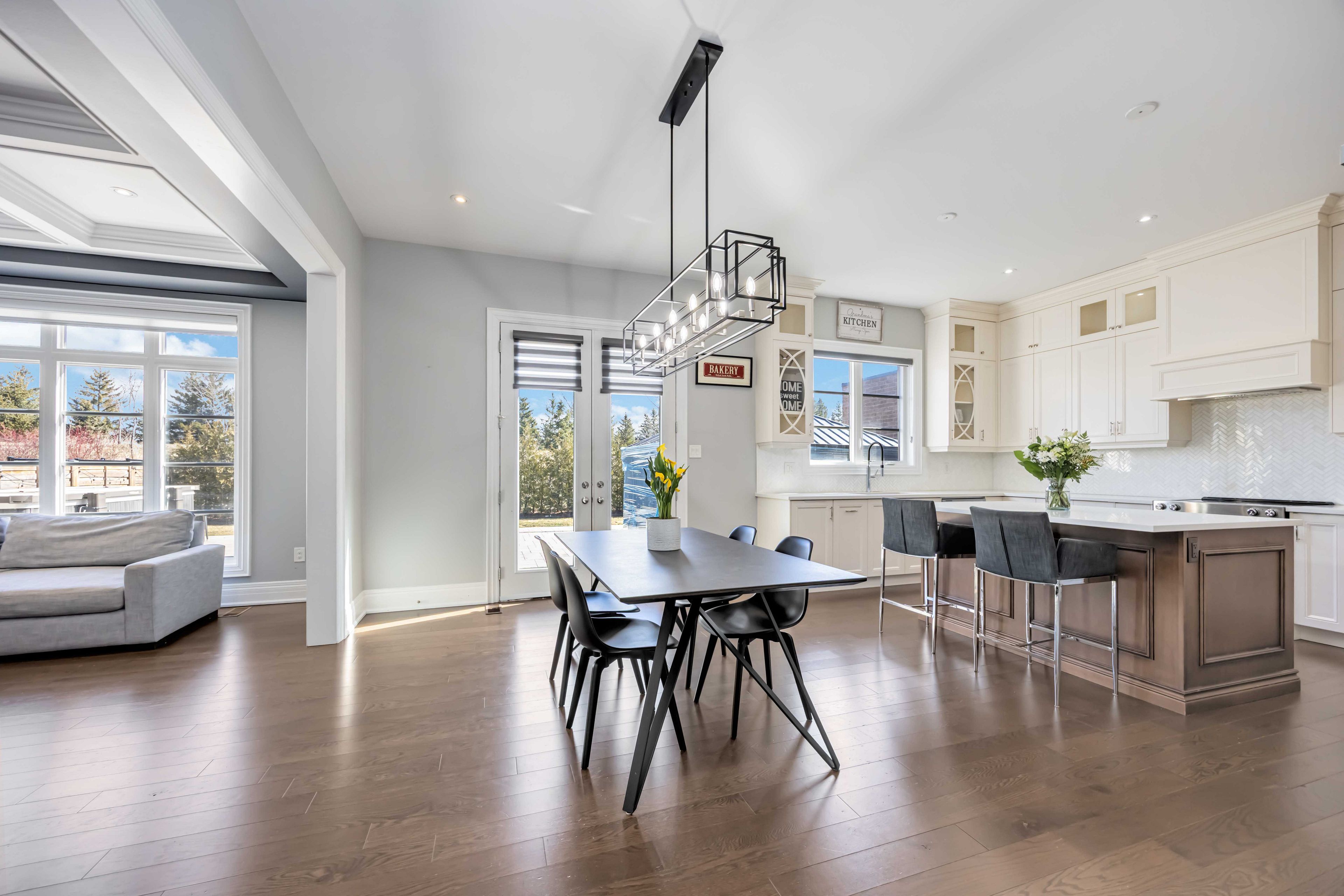 • Open concept design with high ceilings and large windows for natural light.