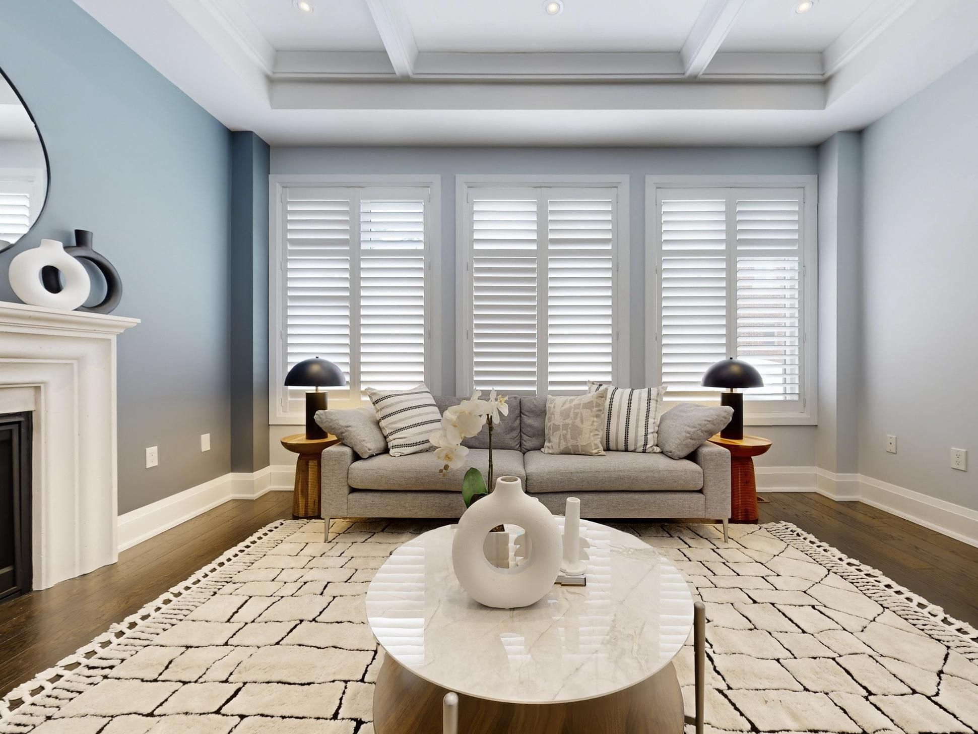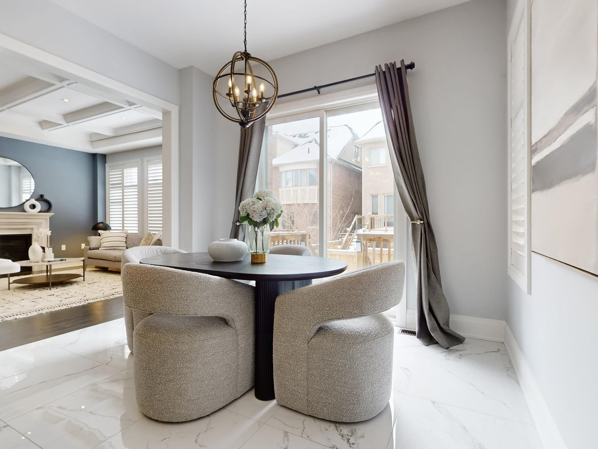 • Elegant main floor with high ceilings, hardwood floors, and a cozy fireplace.