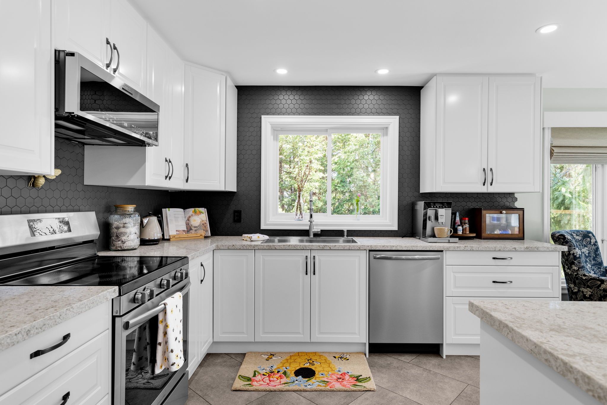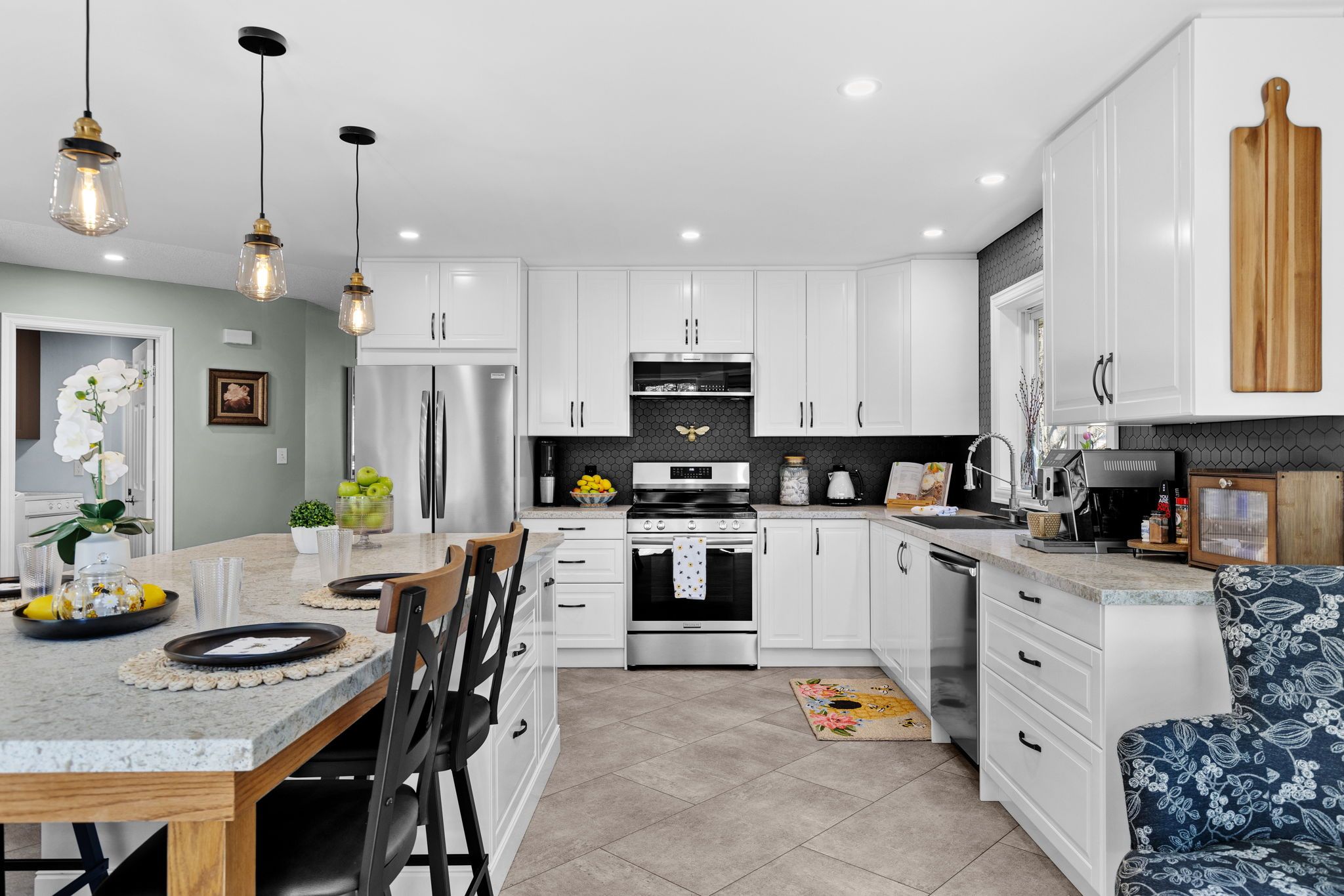 • Gourmet kitchen recently renovated with quartz countertops and large island.