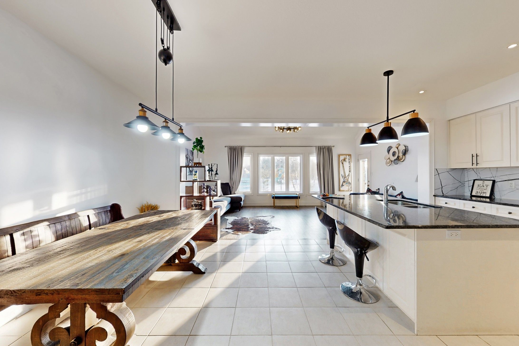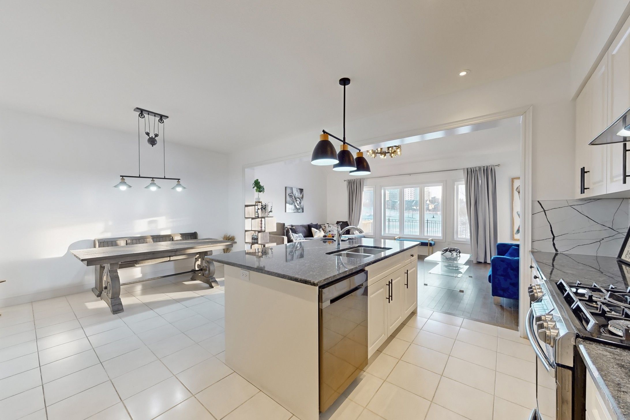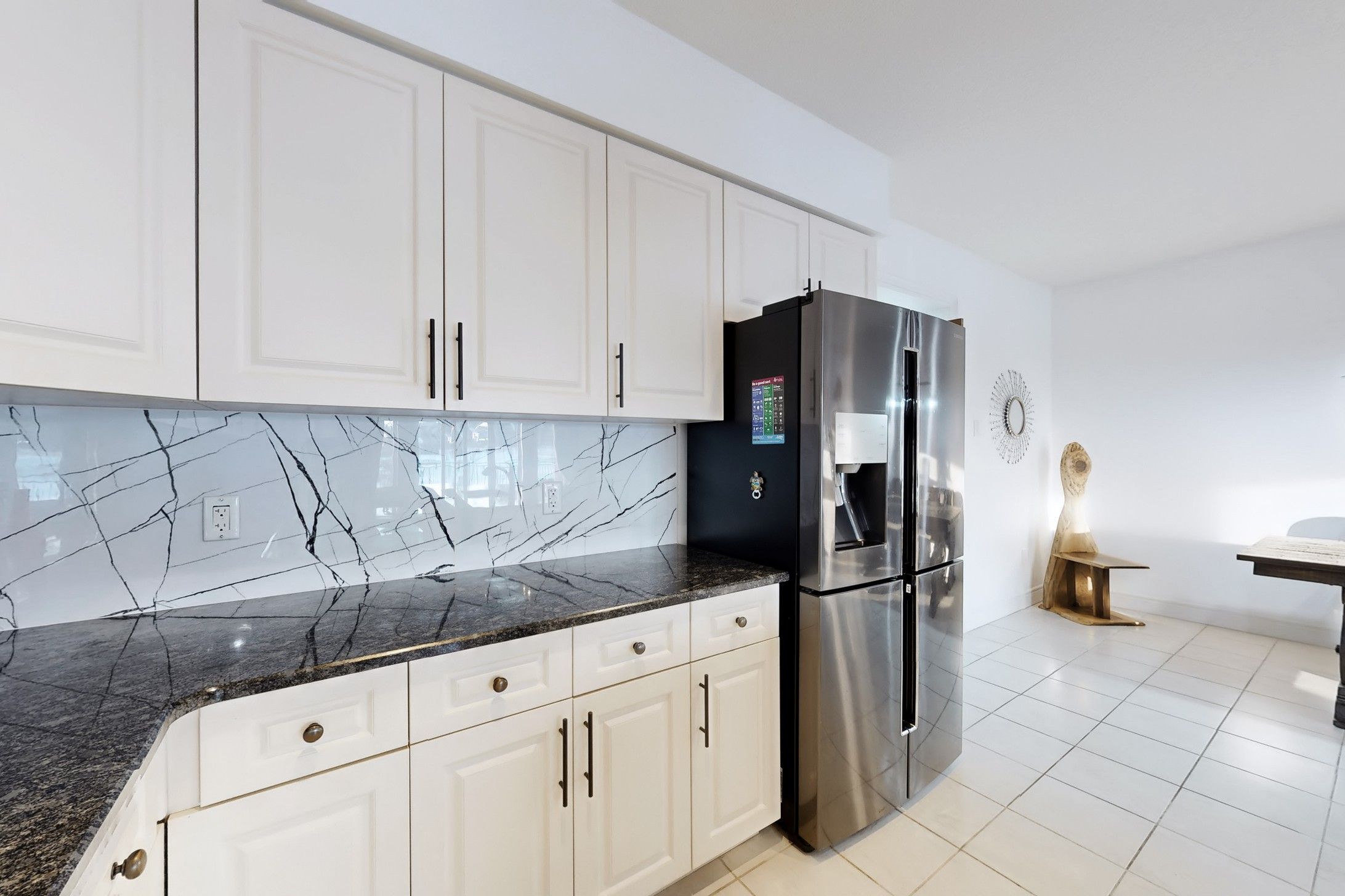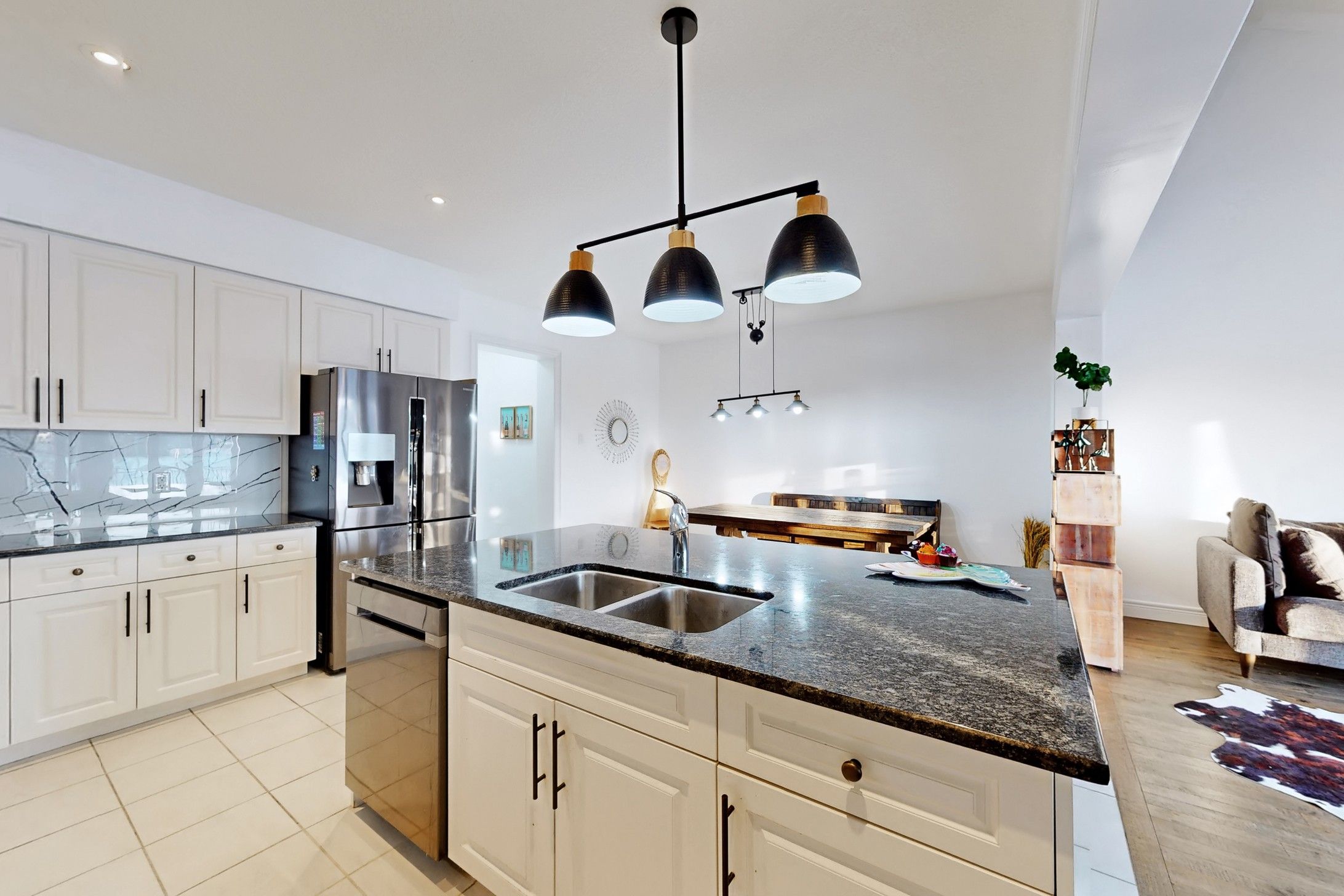 • Gourmet kitchen with white cabinetry, black granite island, and a pantry.