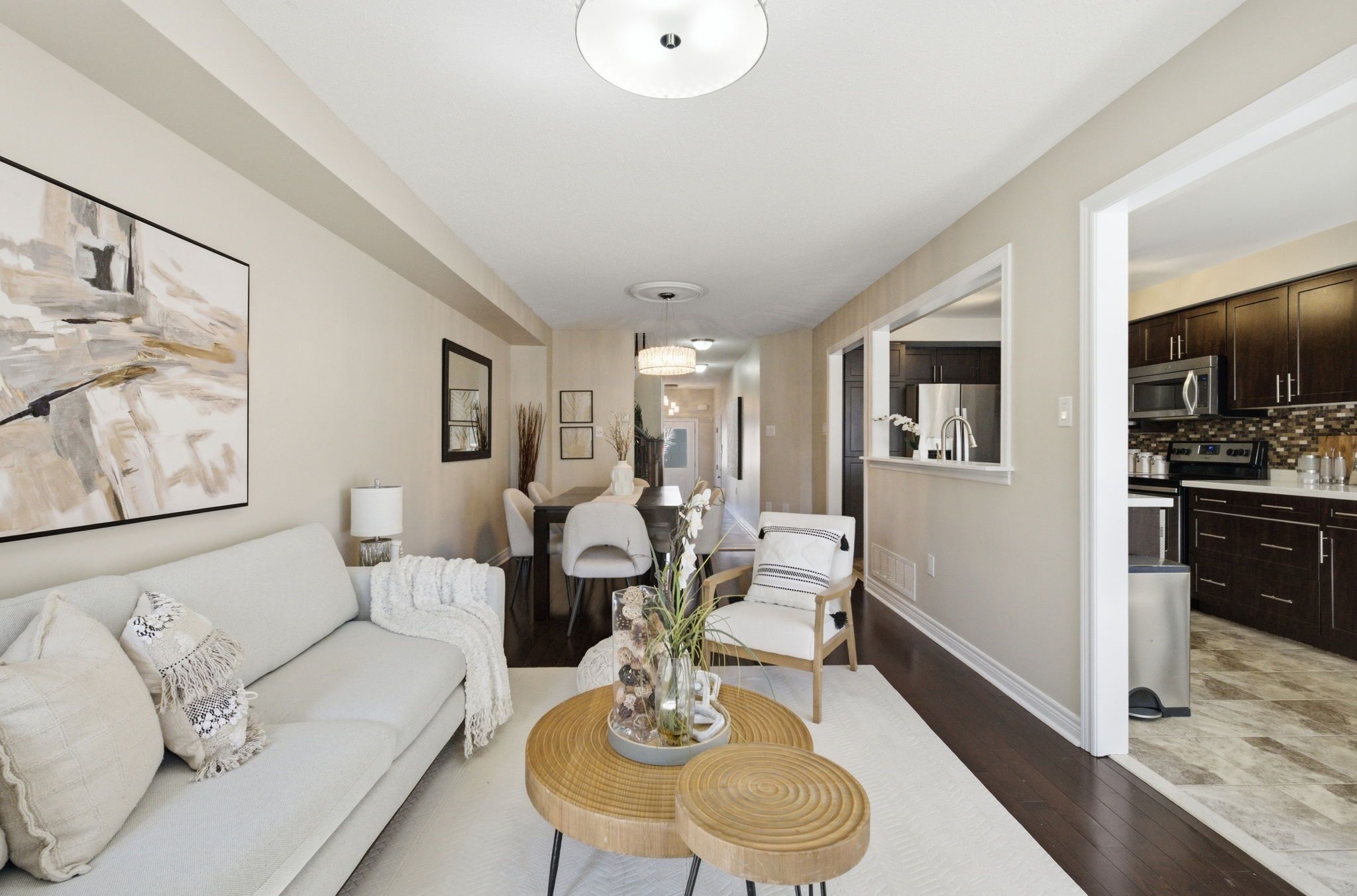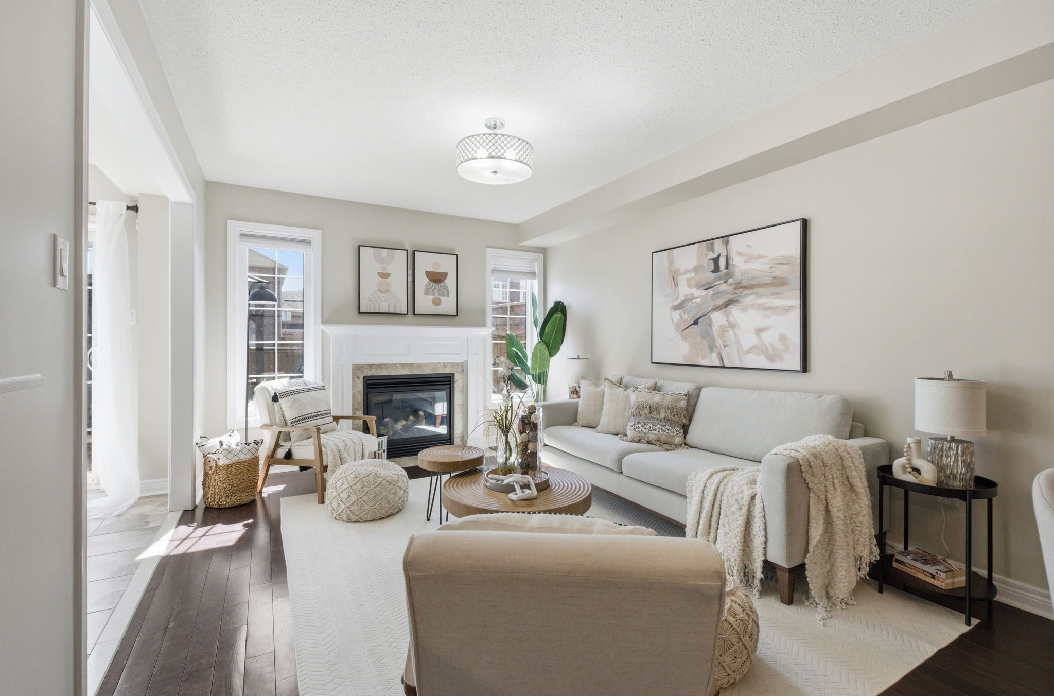 Set in a welcoming south east ajax neighbourhood just minutes from the waterfront, this freehold townhouse offers a bright, thoughtfully designed layout that balances everyday function with comfortable living-perfect for first-time buyers or those moving up from a condo or smaller townhouse. The main floor feels open yet purposeful, with a sun-filled living room anchored by a cozy fireplace and a dedicated dining area that's perfect for family dinners or hosting. The updated kitchen features rich cabinetry, stone counters, stainless steel appliances, and a breakfast area overlooking the backyard-an easy, natural gathering space throughout the day. Upstairs, the primary bedroom offers the space families look for, complete with a large walk-in closet and a well-appointed 5-piece ensuite featuring a soaker tub, double sinks, and a separate shower-giving you a true place to unwind. Two additional bedrooms provide flexibility for growing families, guests, or a home office. The finished basement adds real, usable space with pot lights, upgraded flooring, and a full bathroom-ideal for movie nights, a kids' play area, or even a home gym setup. Out back, the yard is set up for both relaxing and entertaining, with a deck and covered gazebo area for summer evenings, plus a grassy section for kids or pets to play. Close to schools, parks, trails, and just a short drive to lake ontario, this is a home that grows with you in a neighbourhood families love.