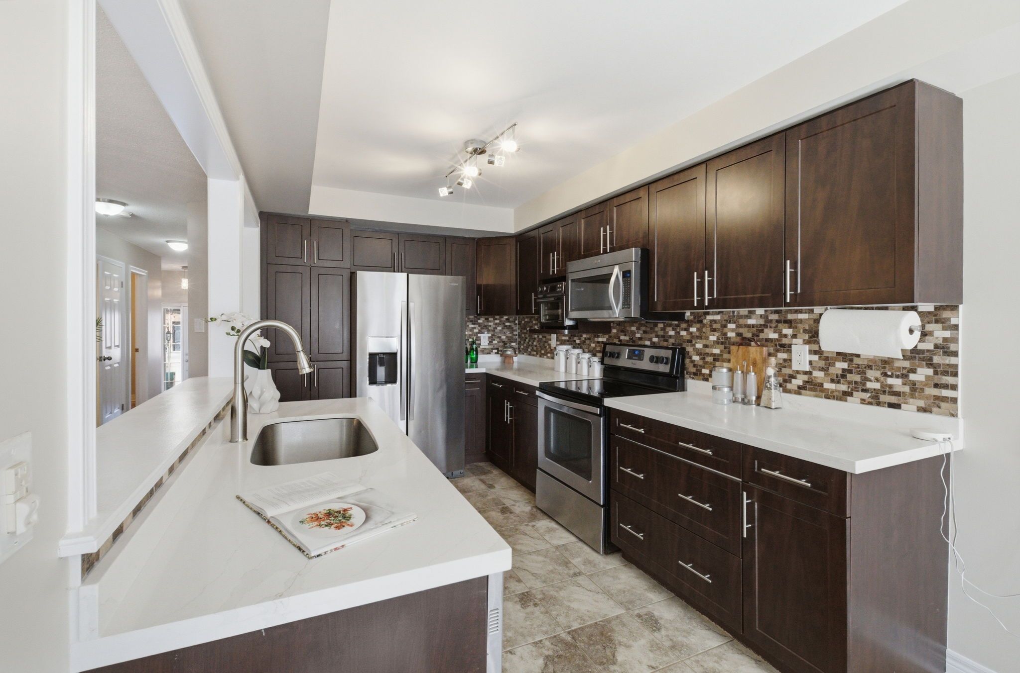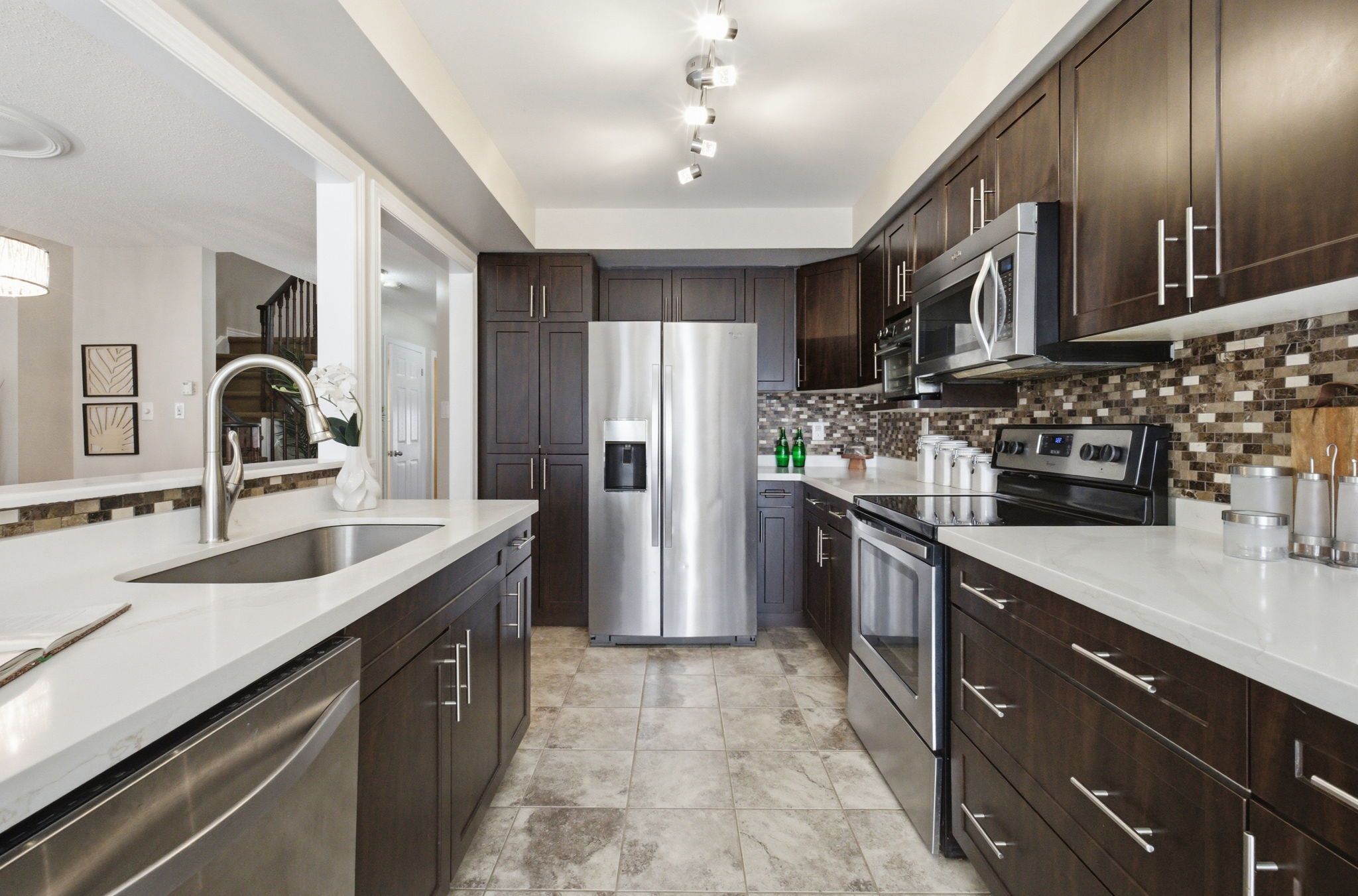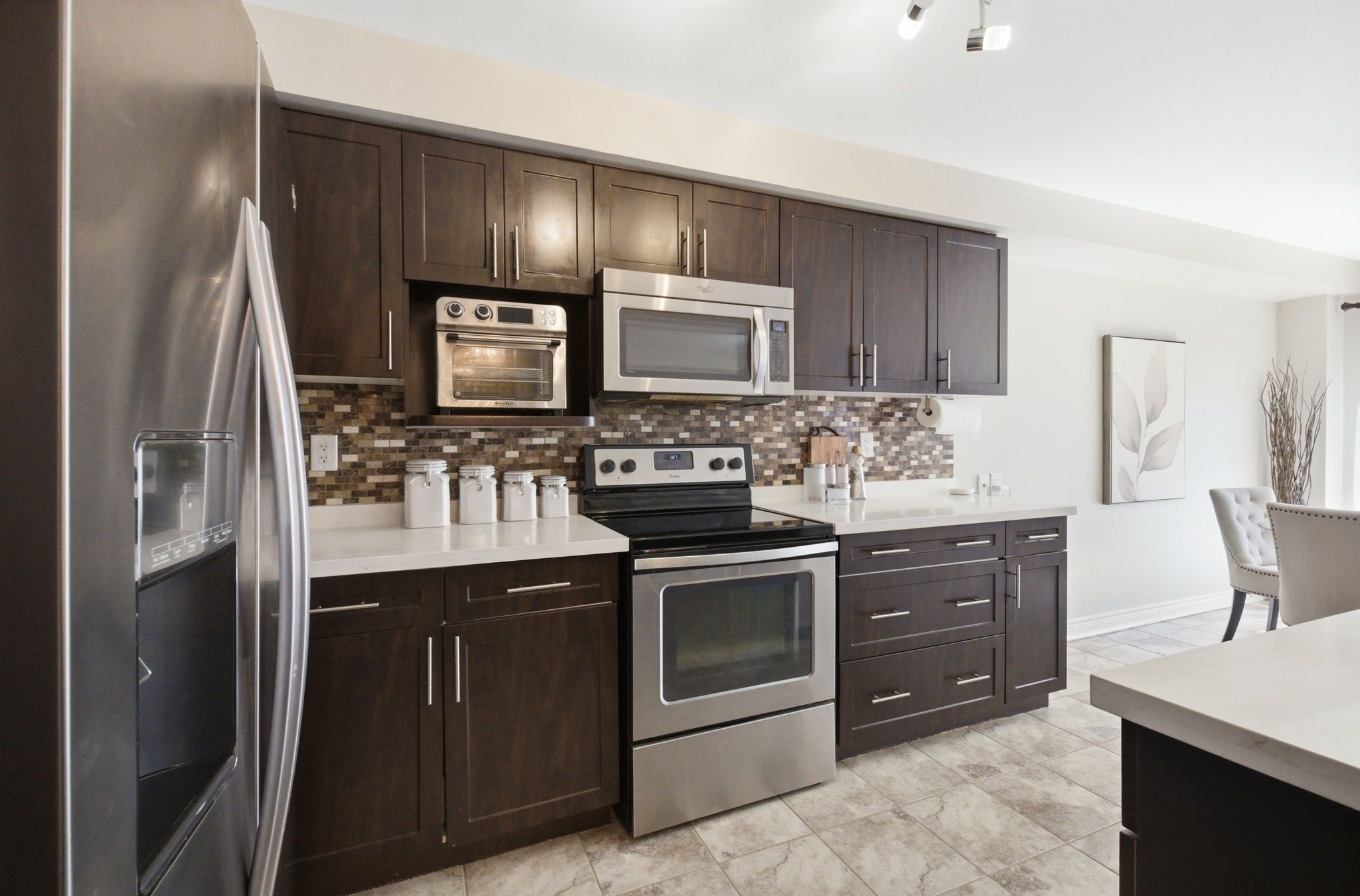 • Updated kitchen with stylish cabinetry, stone counters, and stainless steel appliances.
