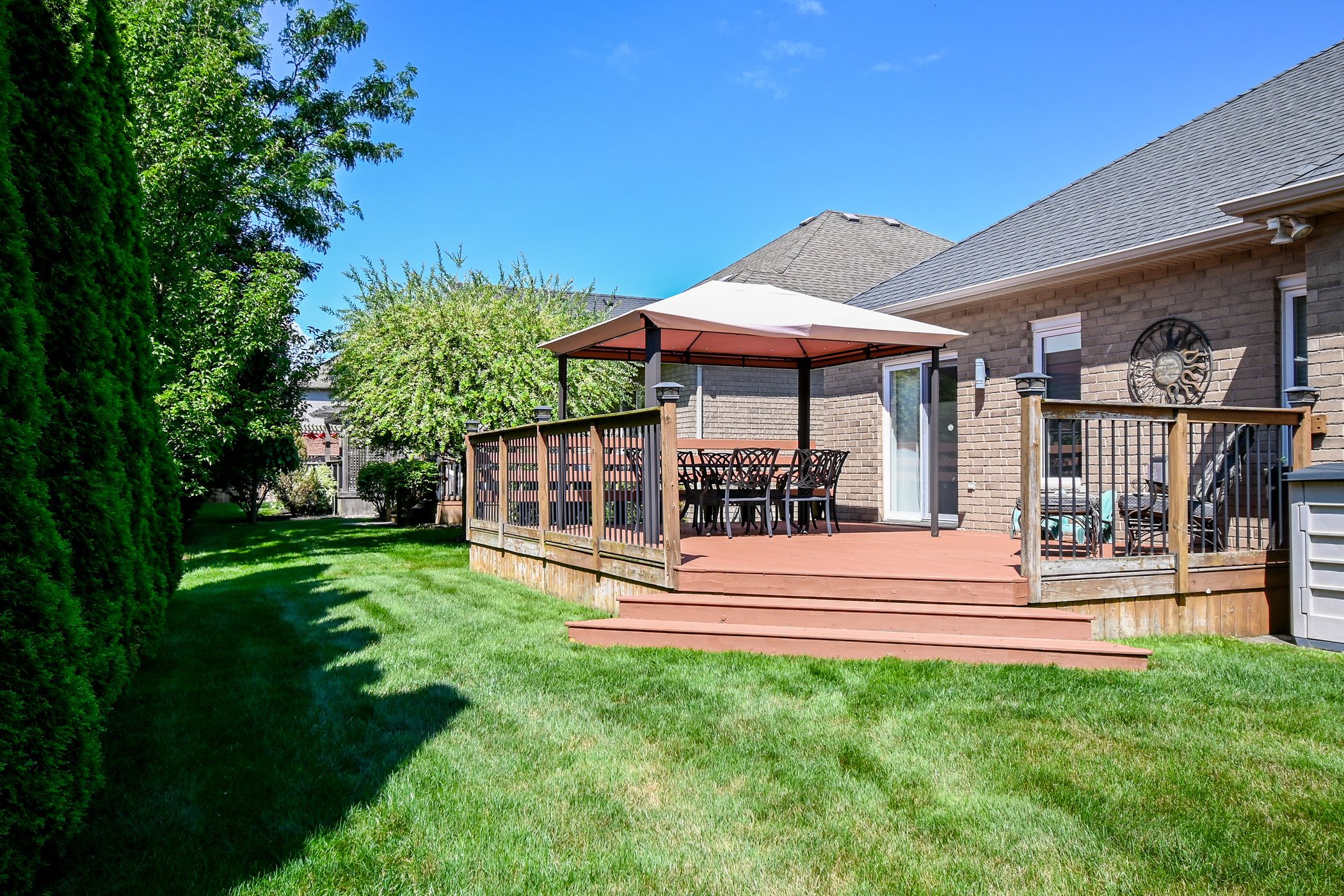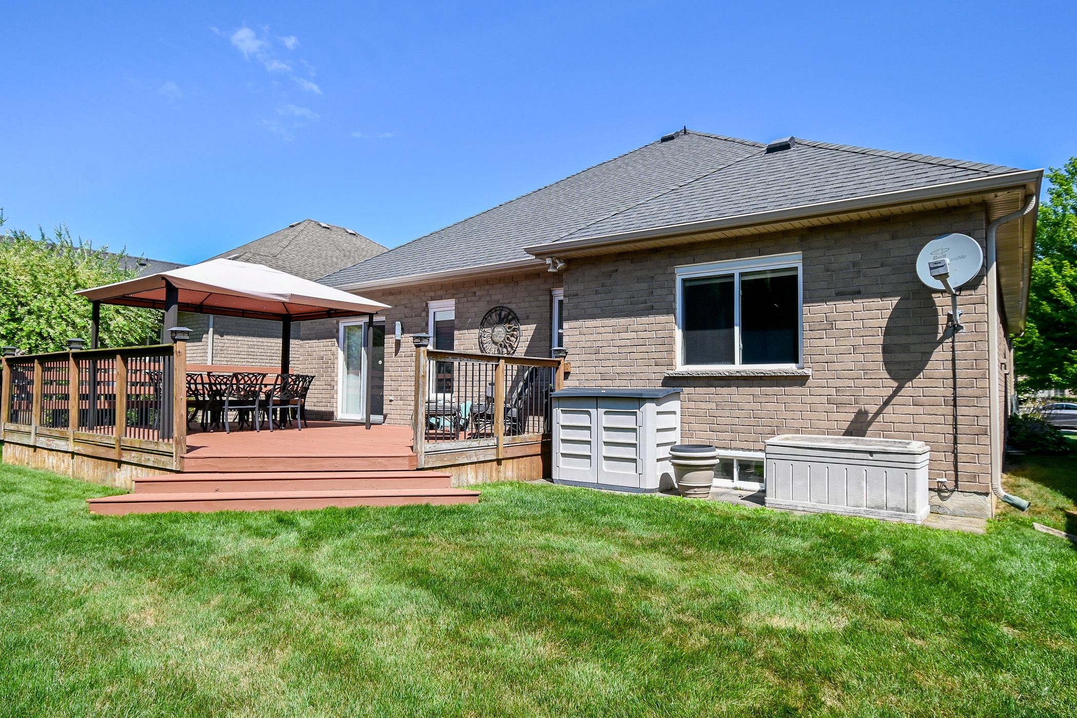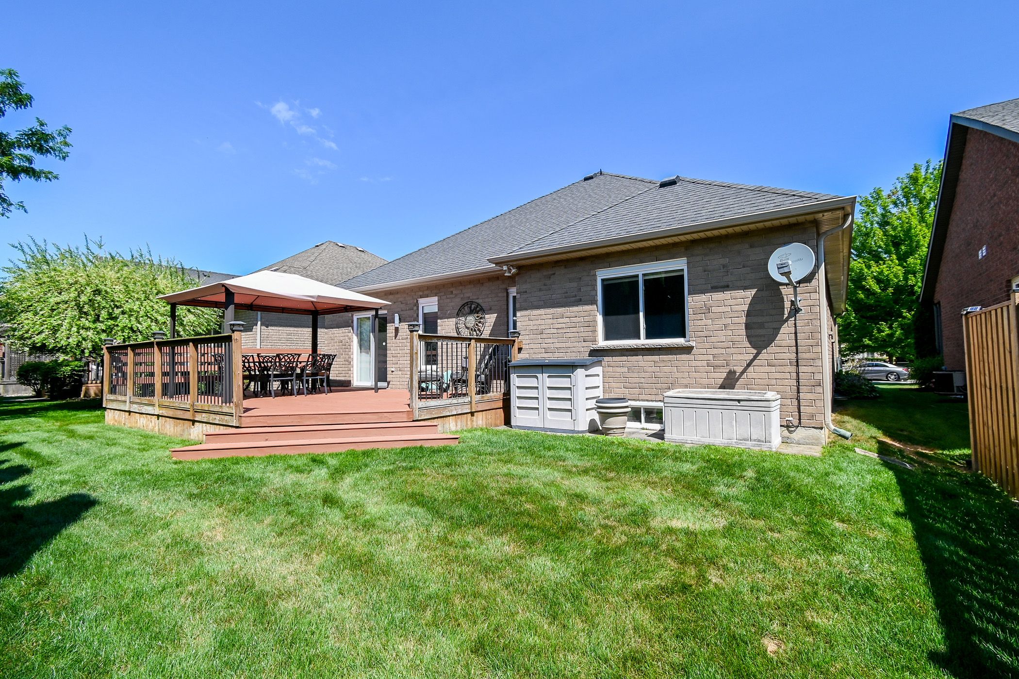 Stunning brick bungalow in coveted virgil, niagara-on-the-lake. Beautifully maintained 3-bedroom, 2-bathroom brick bungalow offering 1,464 sq. Ft. Of refined, low-maintenance living in the heart of virgil, one of niagara-on-the-lake's most desirable communities. Quiet, welcoming, and just minutes to wineries, golf, restaurants, and everyday amenities. Featuring 9-ft ceilings, wide hallways, and a bright open-concept layout, the home is thoughtfully designed for comfort and accessibility. The kitchen offers granite countertops, island seating, ceramic flooring, and a patio door leading to a private backyard with expansive deck and canopy. The primary bedroom includes a refreshed 3-piece ensuite (2018), while two additional bedrooms feature luxury vinyl flooring (2023). The family room is filled with natural light and is ideal for entertaining or relaxing, featuring hardwood flooring and a gas fireplace. The partially finished basement (2025) adds a very spacious recreation room with electric fireplace, pot lights, luxury vinyl flooring, bathroom rough-in, and excellent storage. Additional features include main floor laundry, central vacuum, double car garage with inside entry, underground sprinkler system, and landscaped gardens. This home is a rare opportunity to own a turnkey bungalow in a prime niagara location.