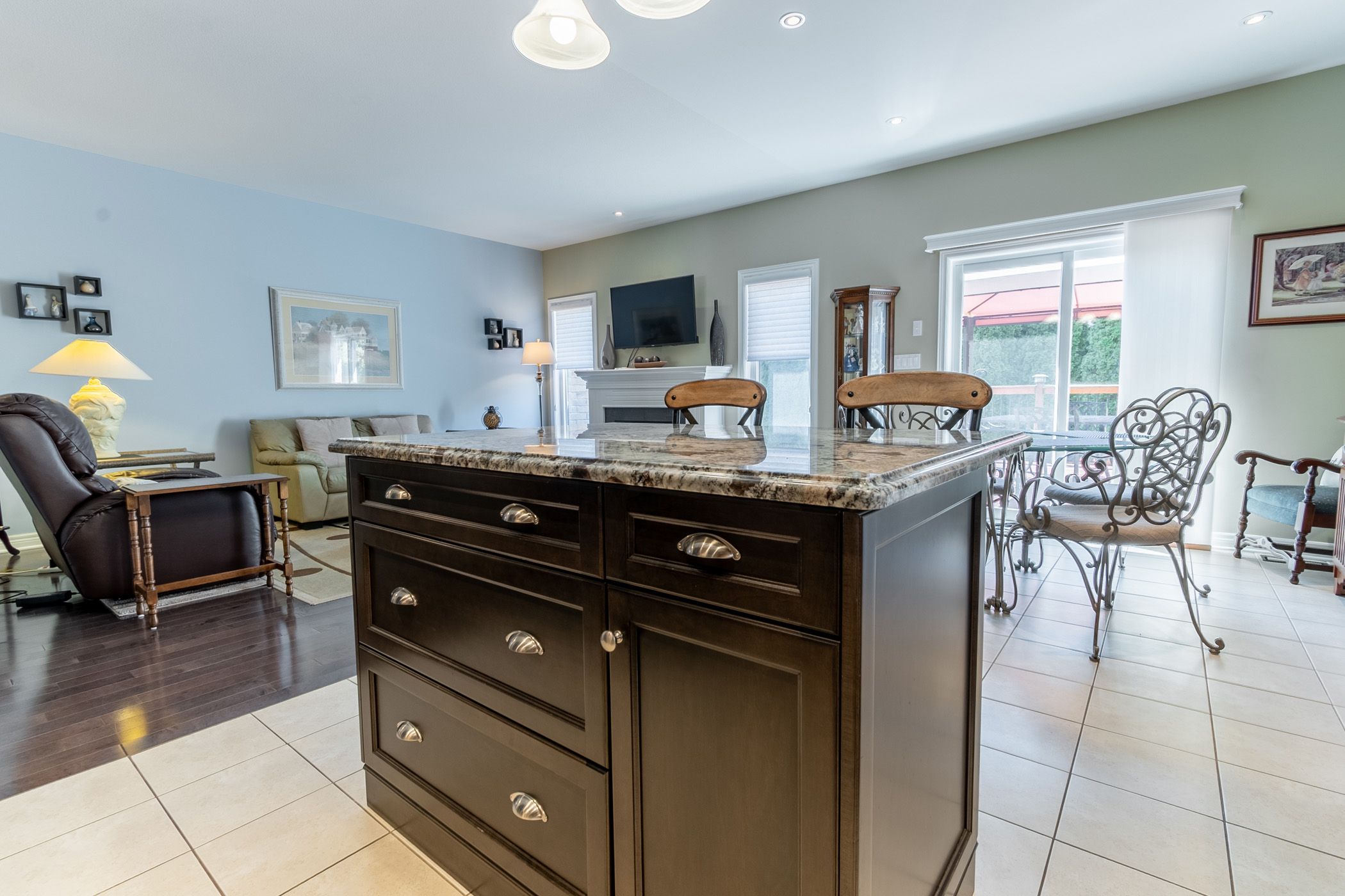 • Kitchen features granite countertops and patio door leading to a private deck.