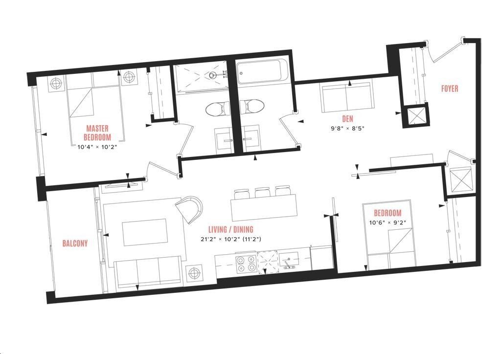 • Modern 2+1 bedroom unit with open-concept living and floor-to-ceiling windows.
