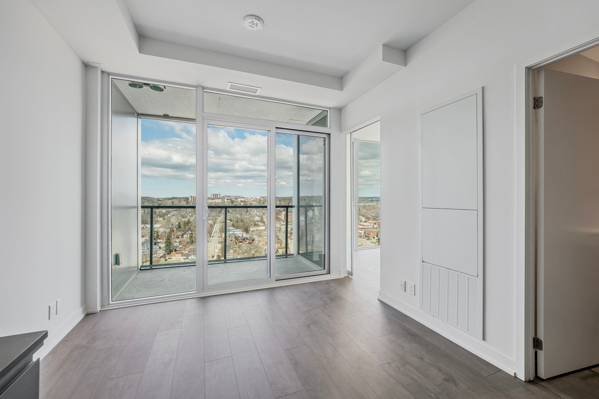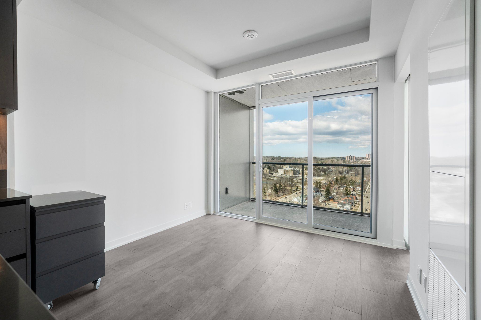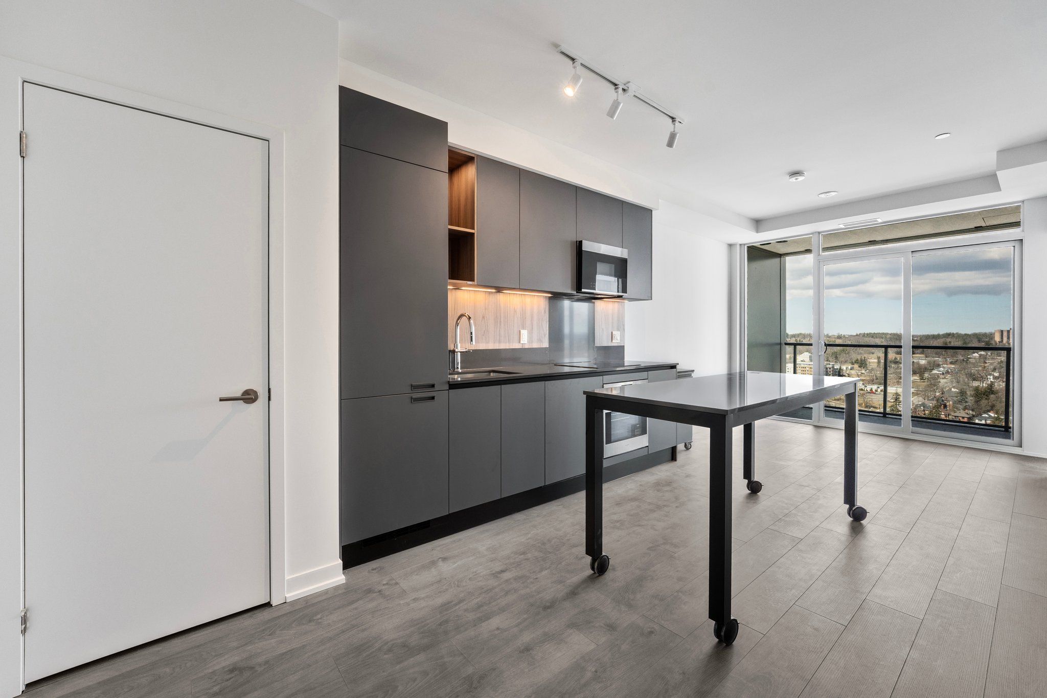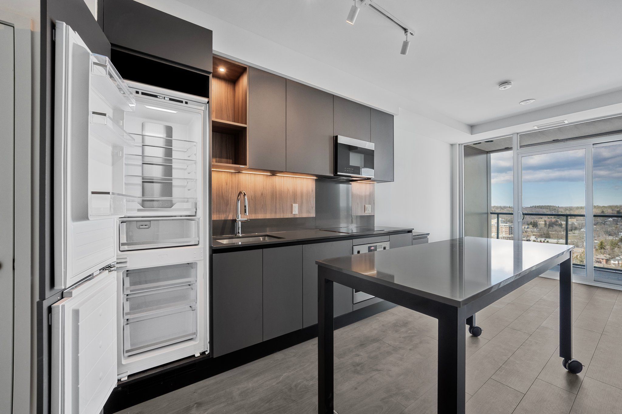 Welcome to debut condos downtown barrie's first luxury high-rise, setting a new standard for modern living in the area. This one bedroom plus den, two full bathroom suite features one of the best layouts in the building with a practical floorplan, unobstructed north views, and high-end finishes throughout. Enjoy a bright living space with floor-to-ceiling windows, premium dark kitchen finishes, brand new appliances, a moveable kitchen island, and ensuite laundry for everyday convenience. The den offers flexibility as a home office or guest room. Includes one parking spot. Debut condos offer an exceptional lifestyle with features like a sky lounge, infinity pool, full-sized gym, concierge service, and more. This development is the start of a destination for downtown living and stand as one of barrie's iconic future landmarks. Perfectly located just steps from lake simcoe's waterfront, barrie's go station, barrie transit, and a short drive to highway 400, this is a rare opportunity to live in one of barrie's most walkable and modern communities.
