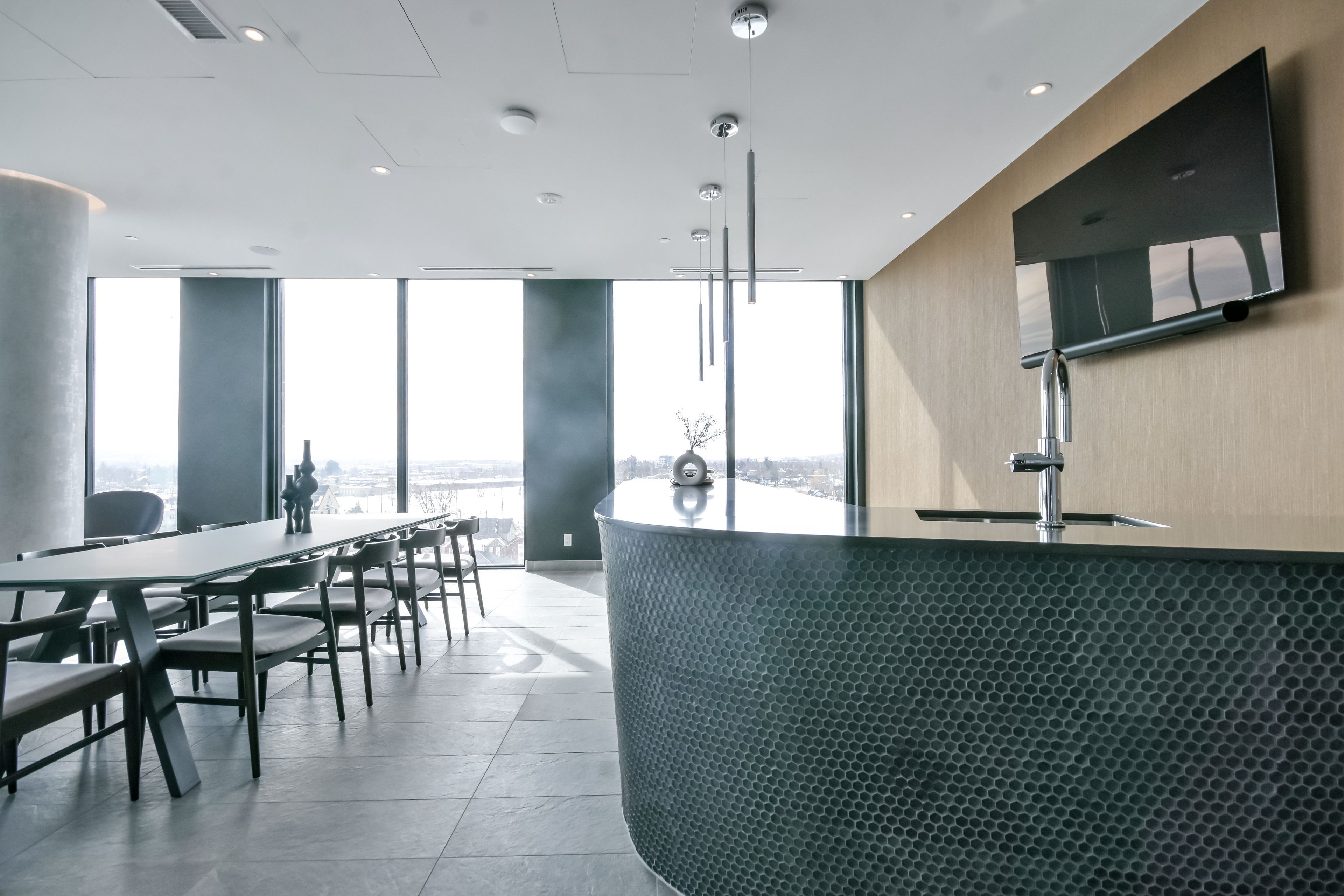 • High-rise suite with panoramic views of Kempenfelt Bay and city skyline.