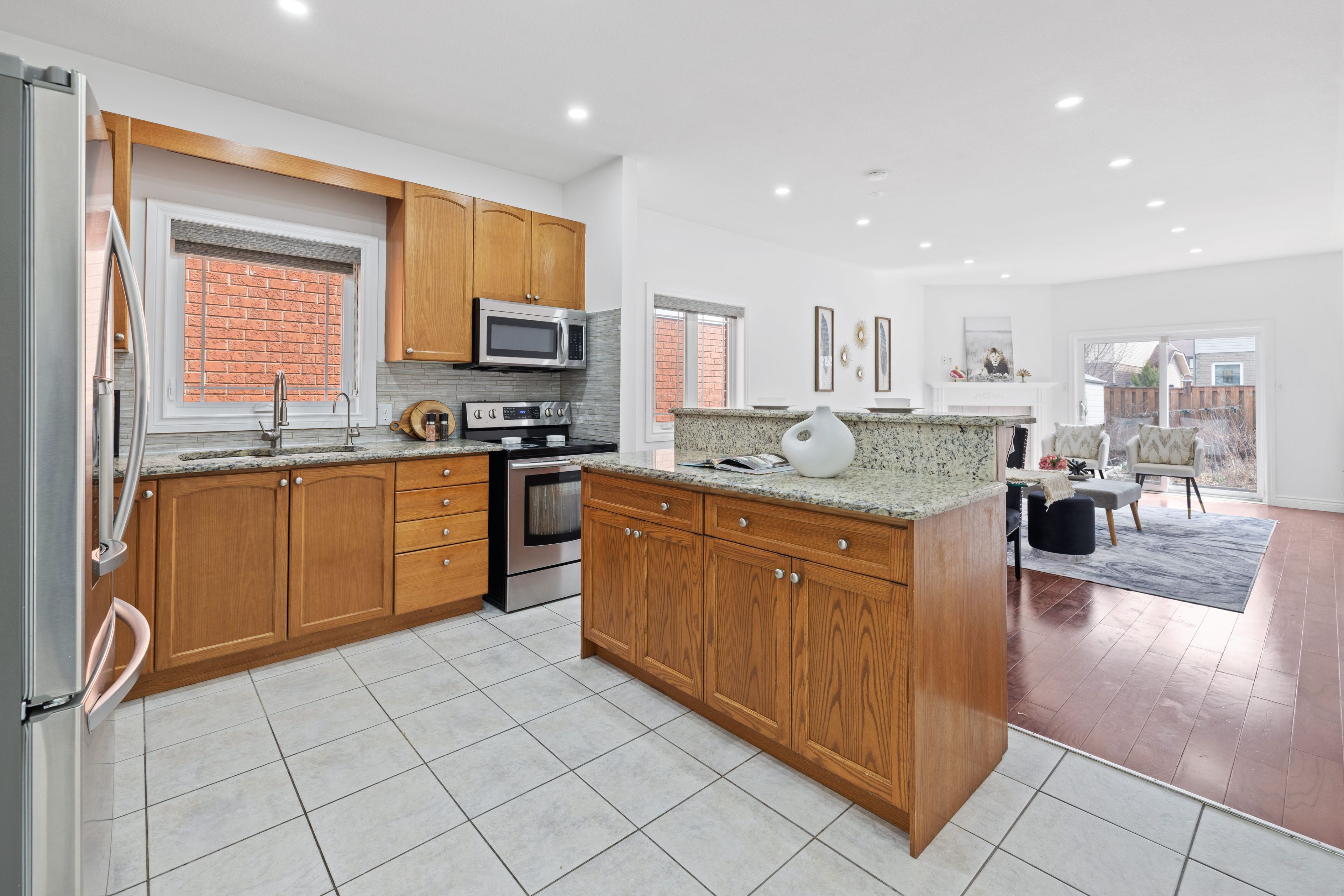 • Upgraded kitchen features quartz countertops and spacious island seating.