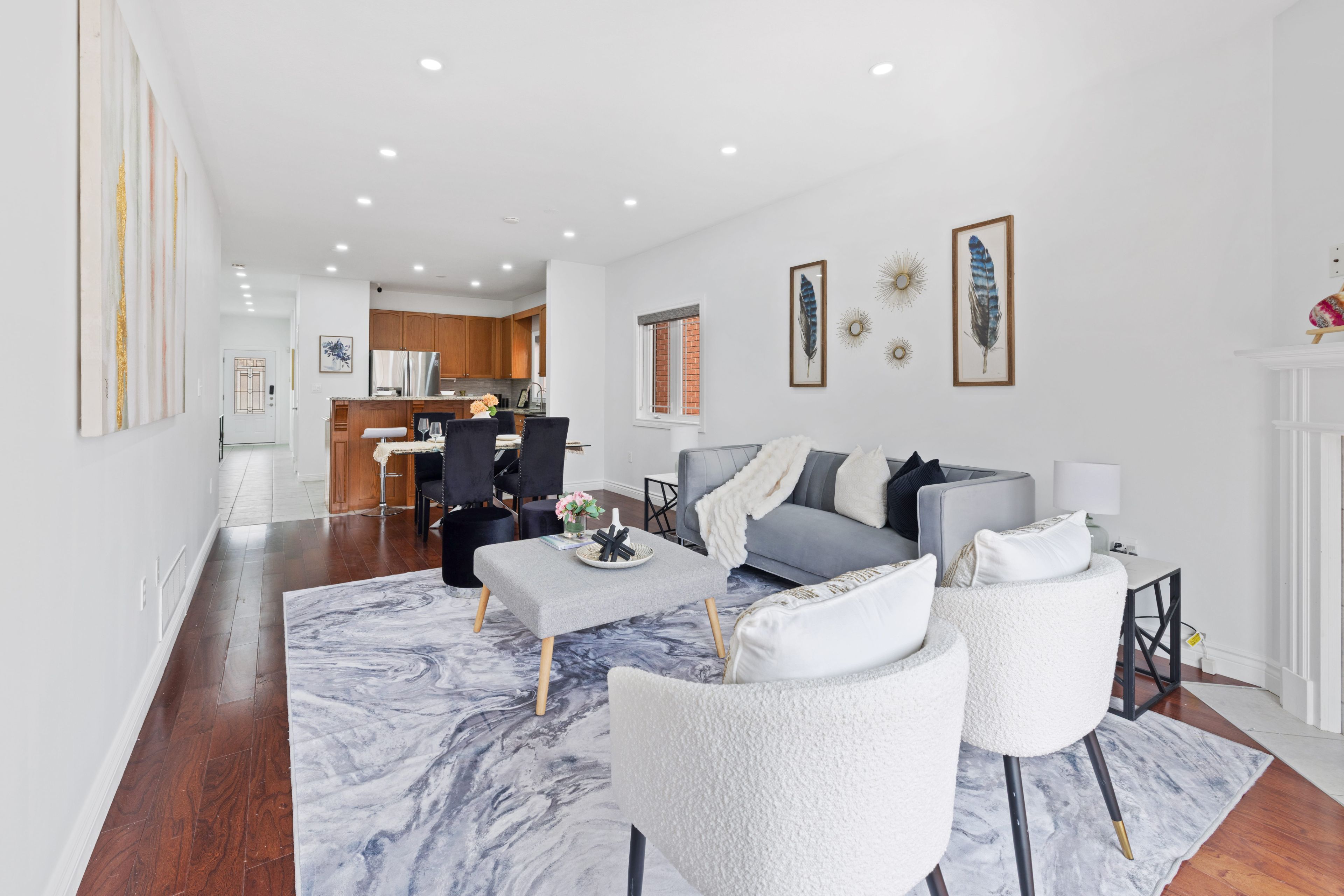 • Bright and spacious open-concept layout with high ceilings and hardwood flooring.