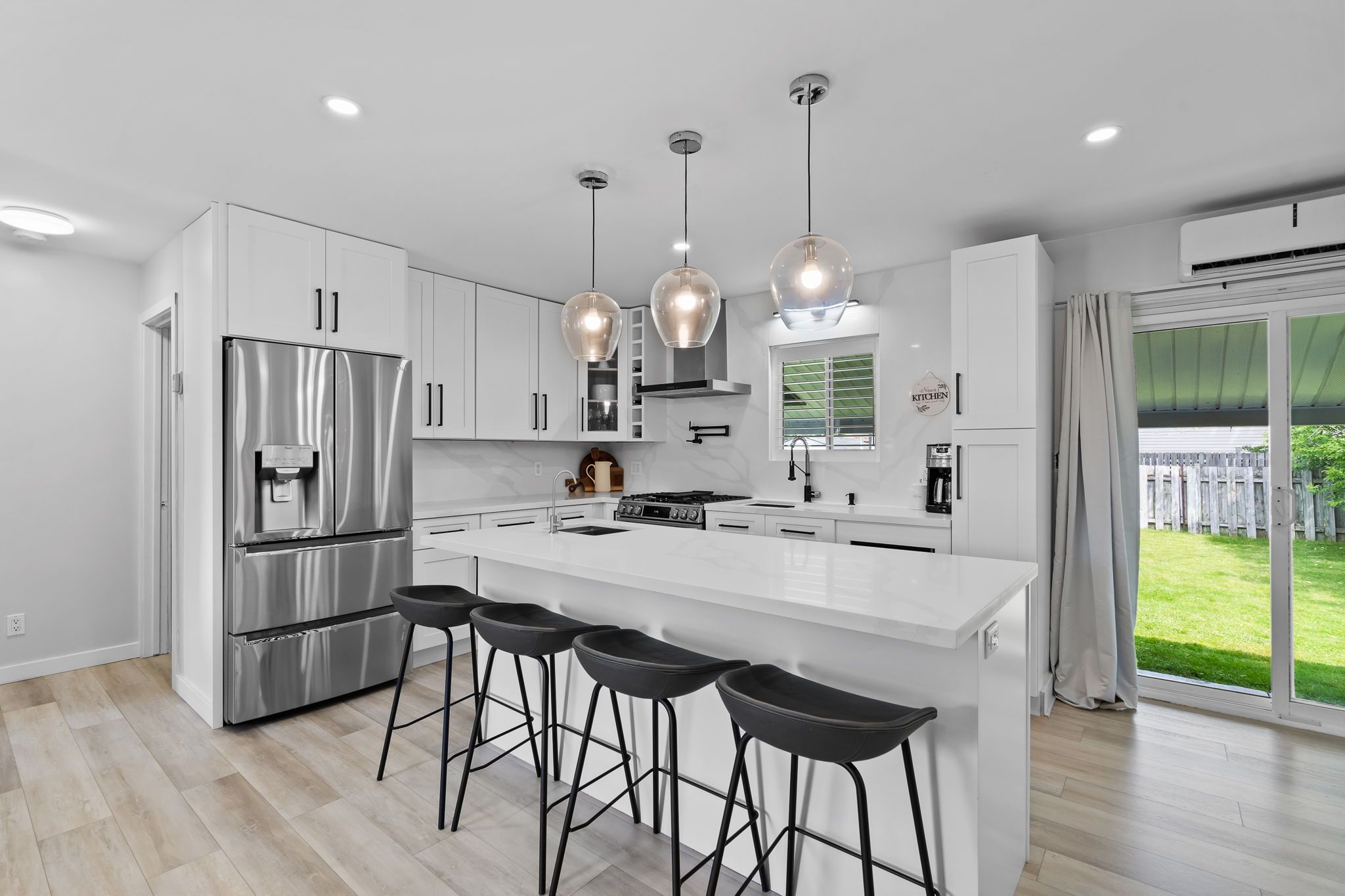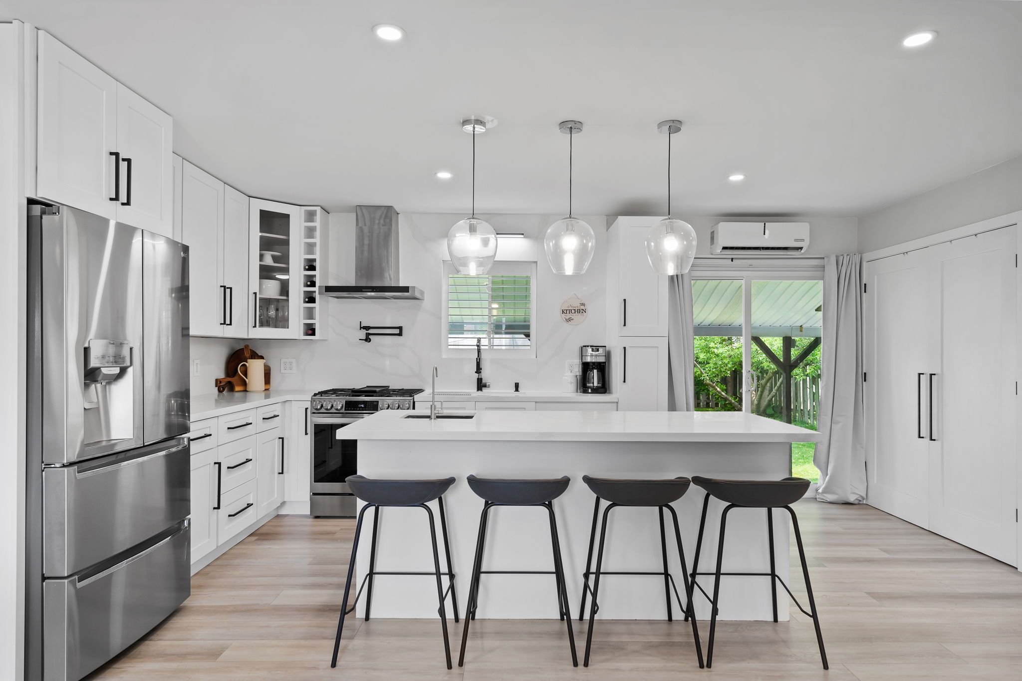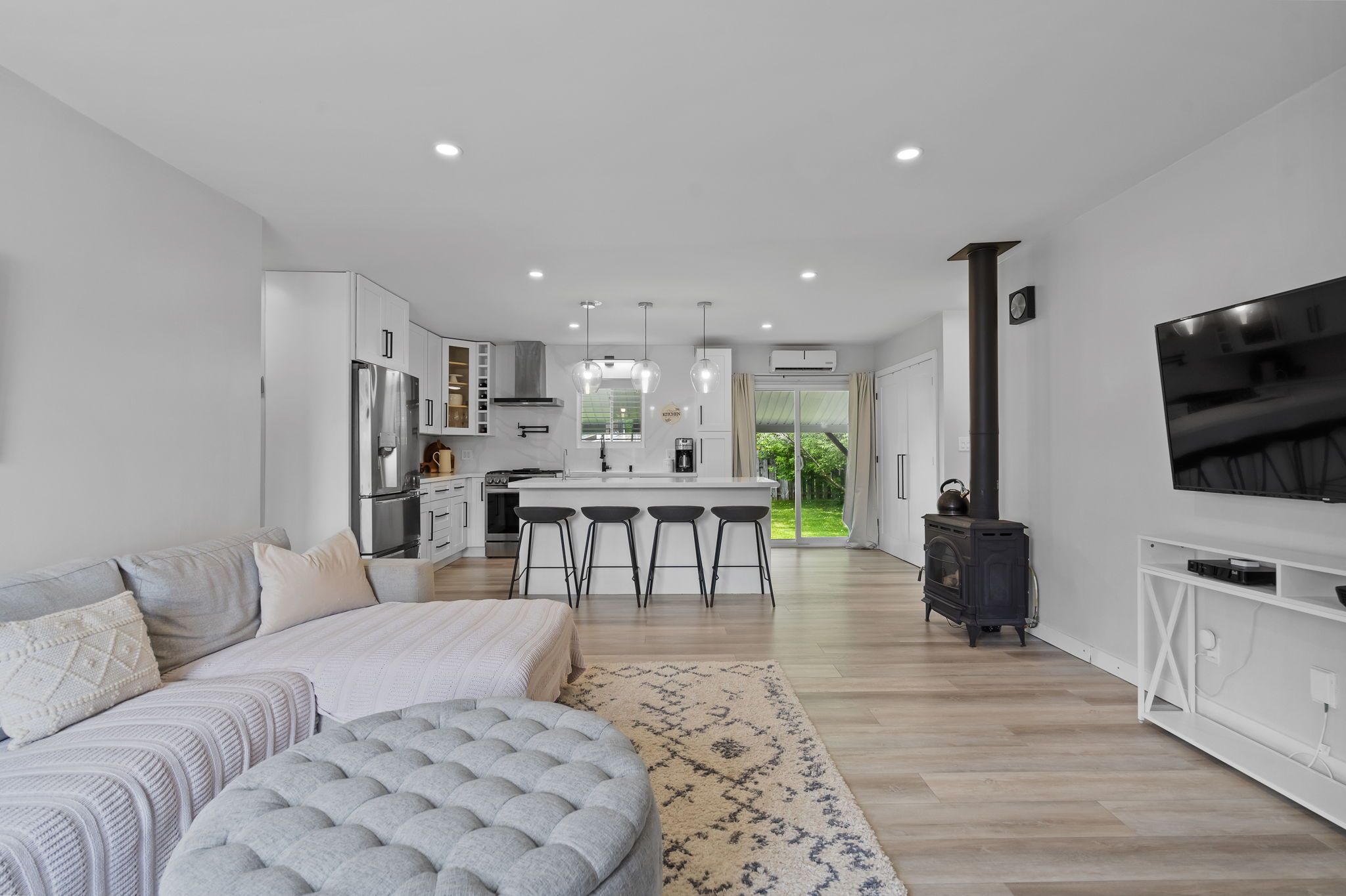 • Open living area features a cozy gas fireplace and large quartz island.