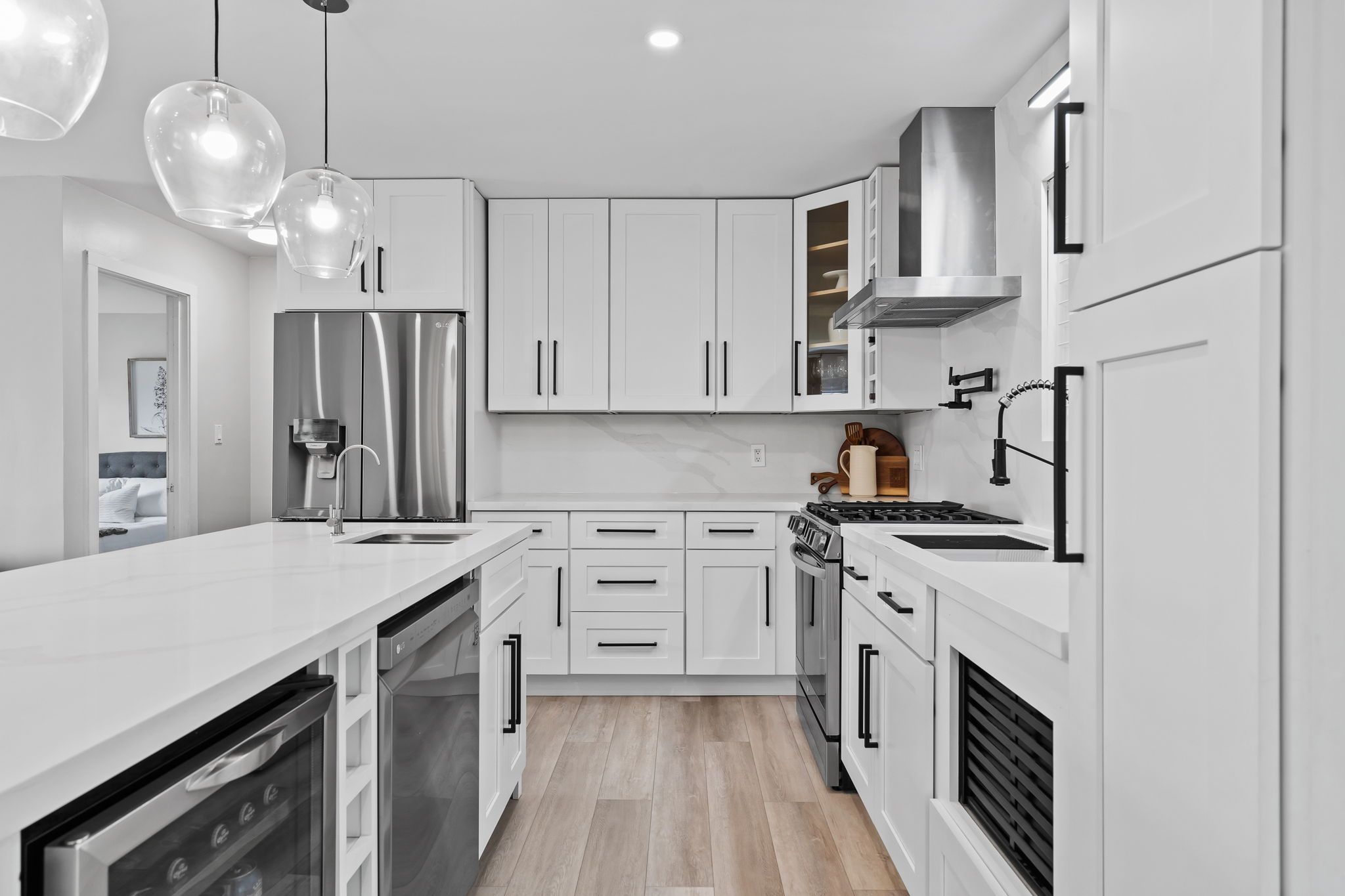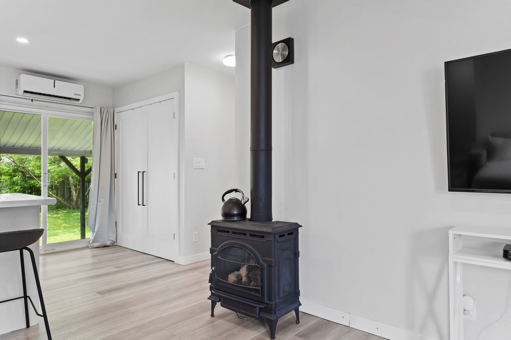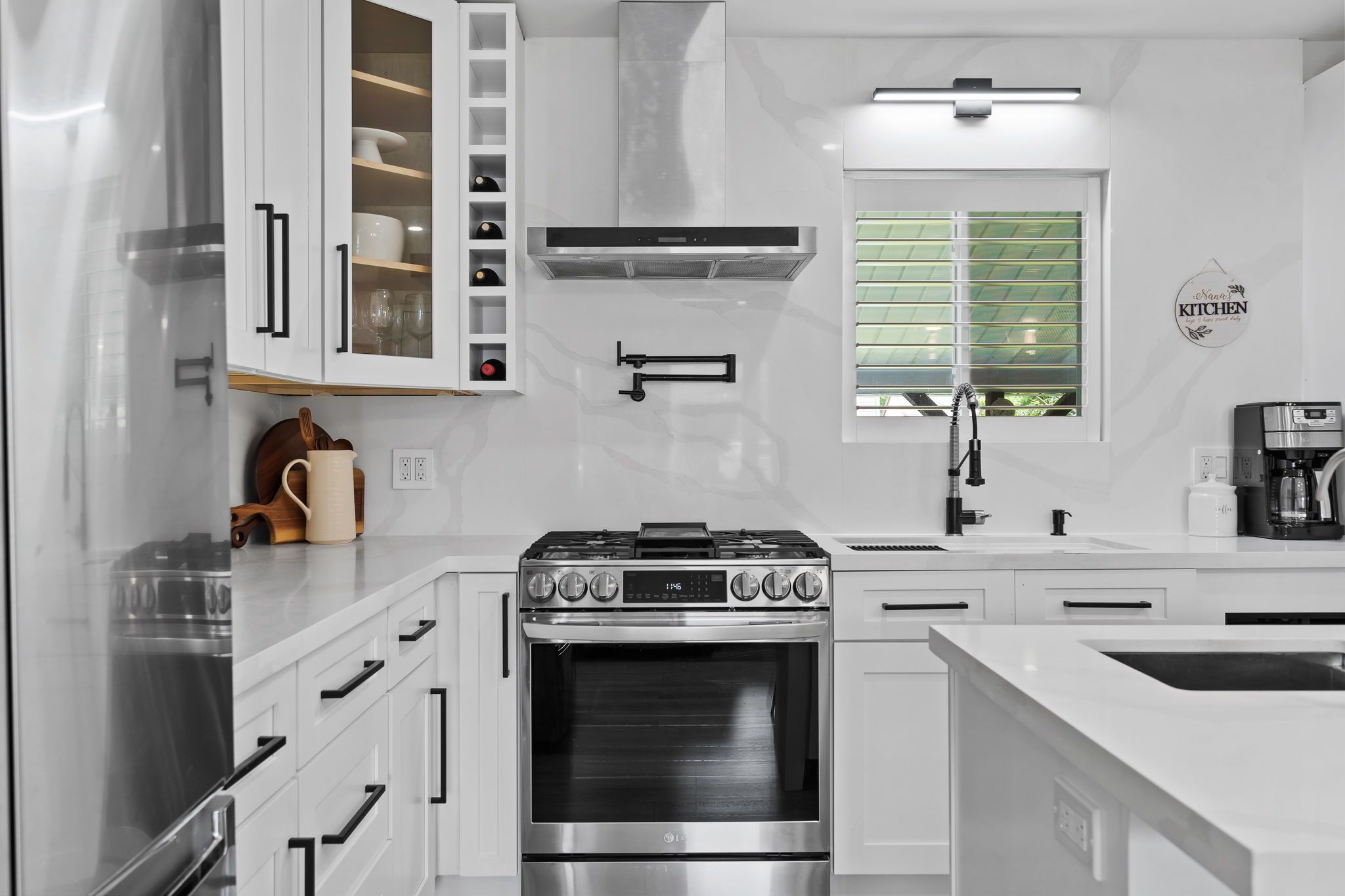 • Open living area features a cozy gas fireplace and large quartz island.