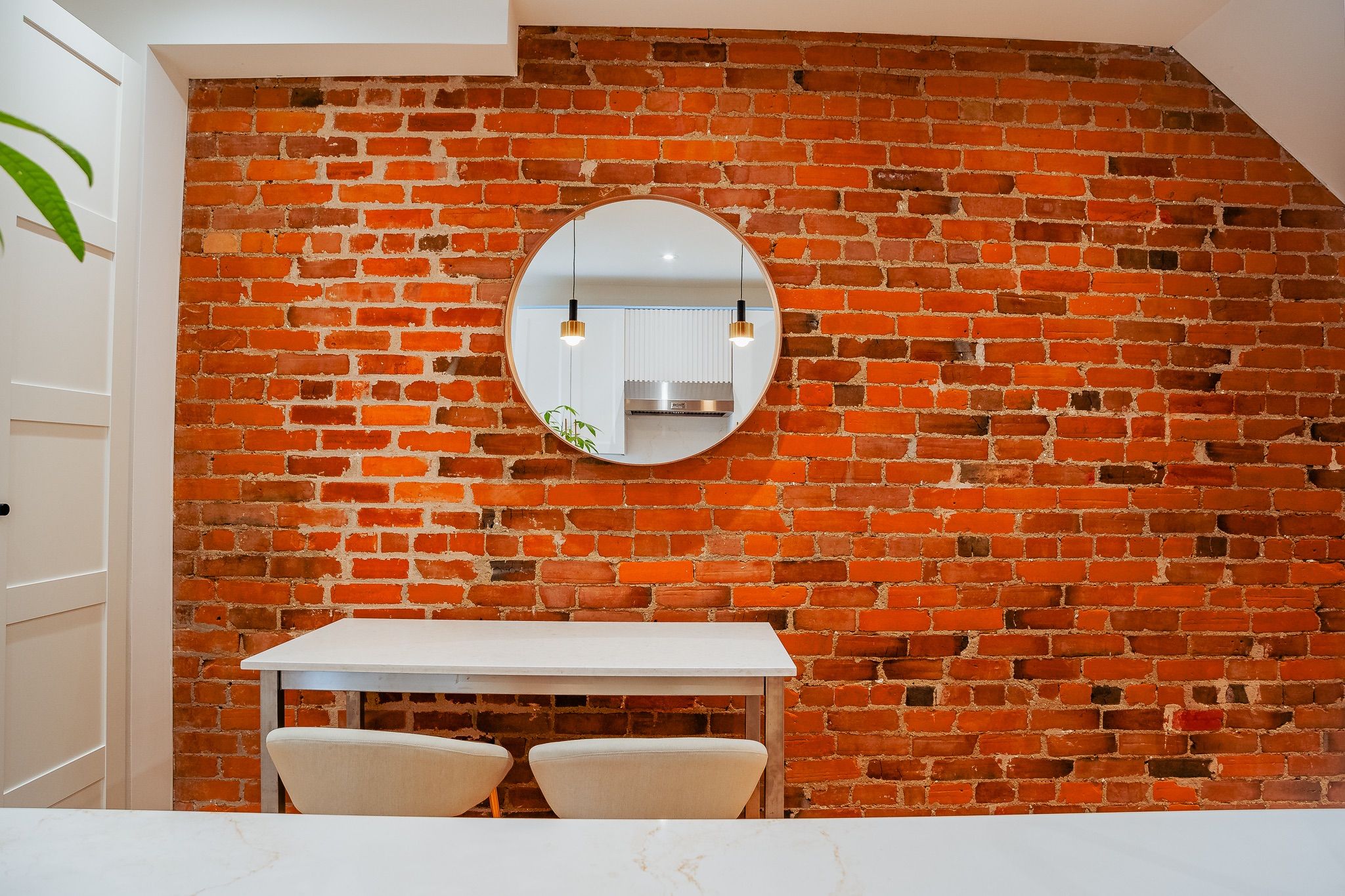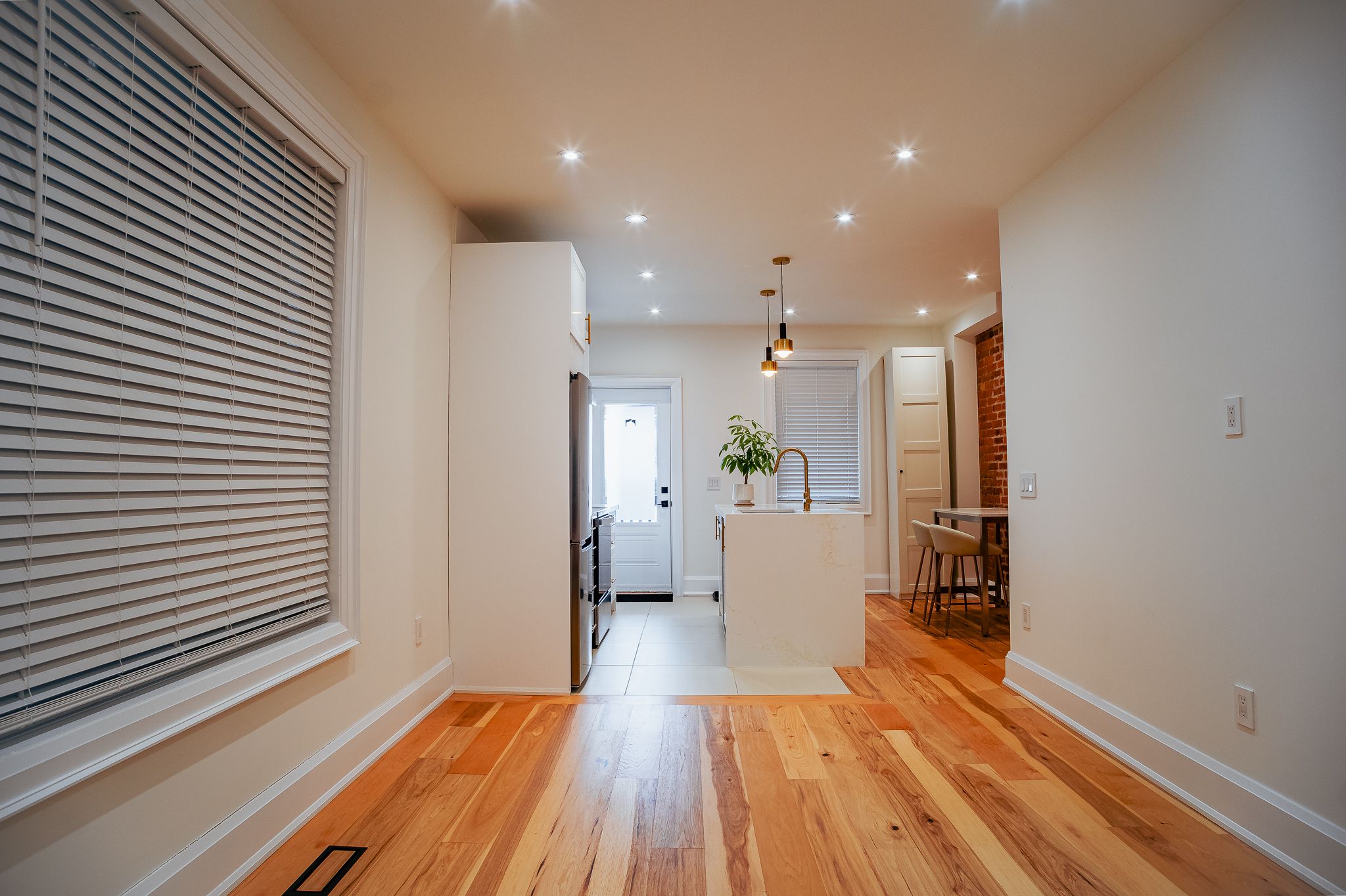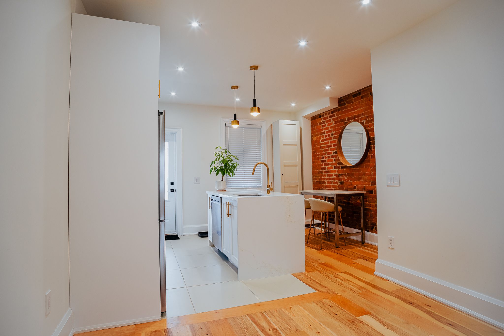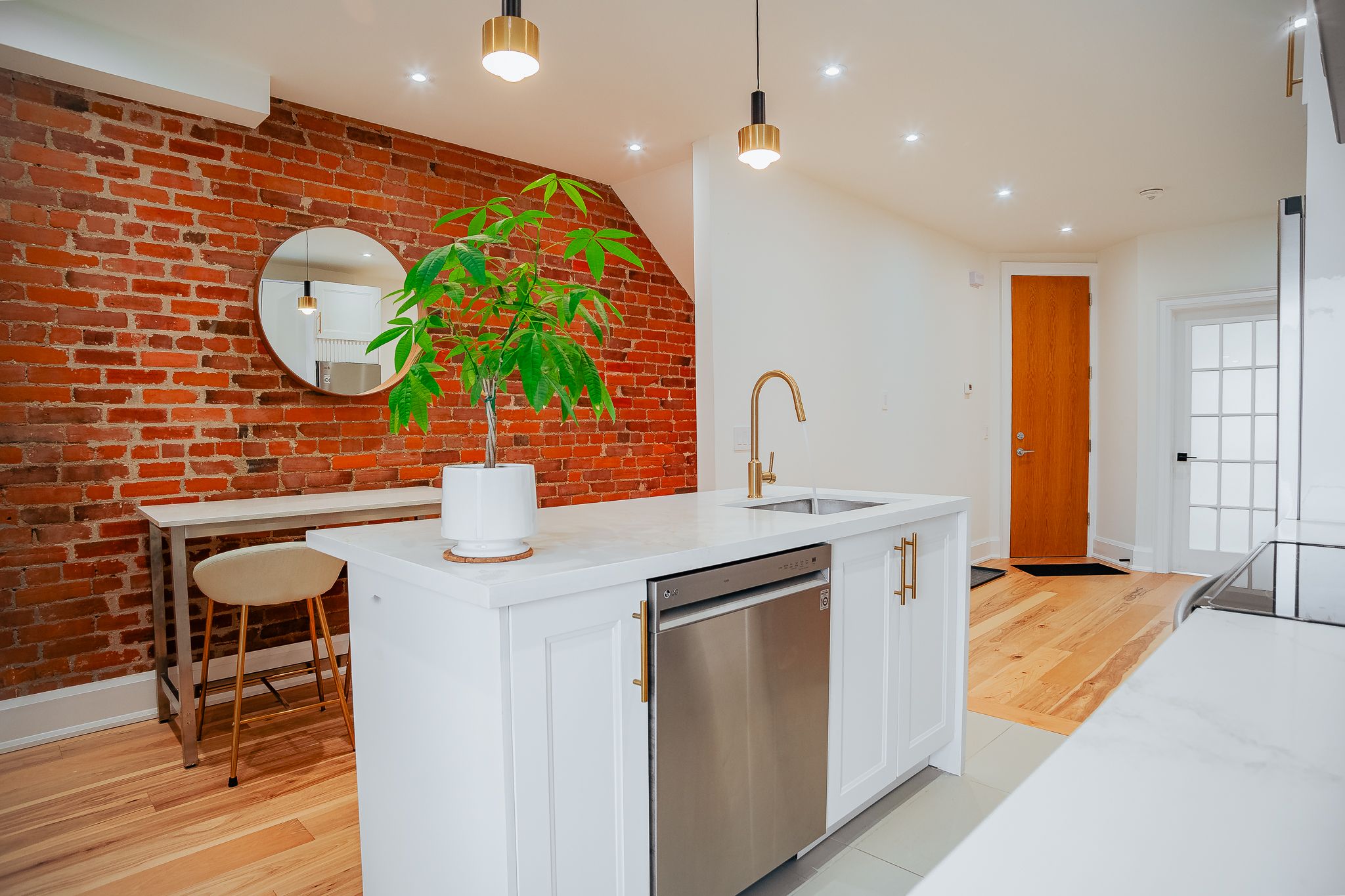 • Contemporary hardwood flooring and exposed brick accents showcase exceptional craftsmanship.