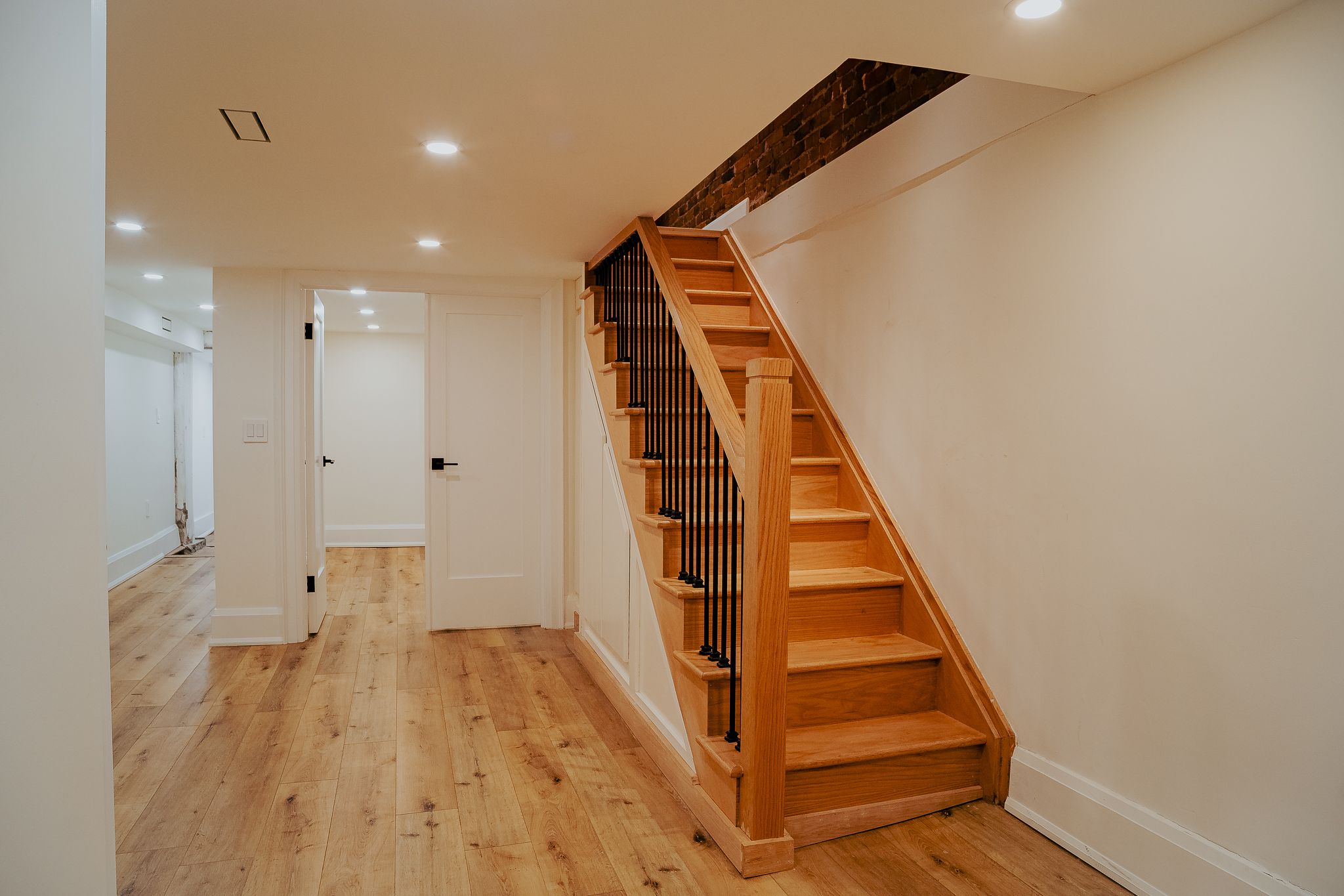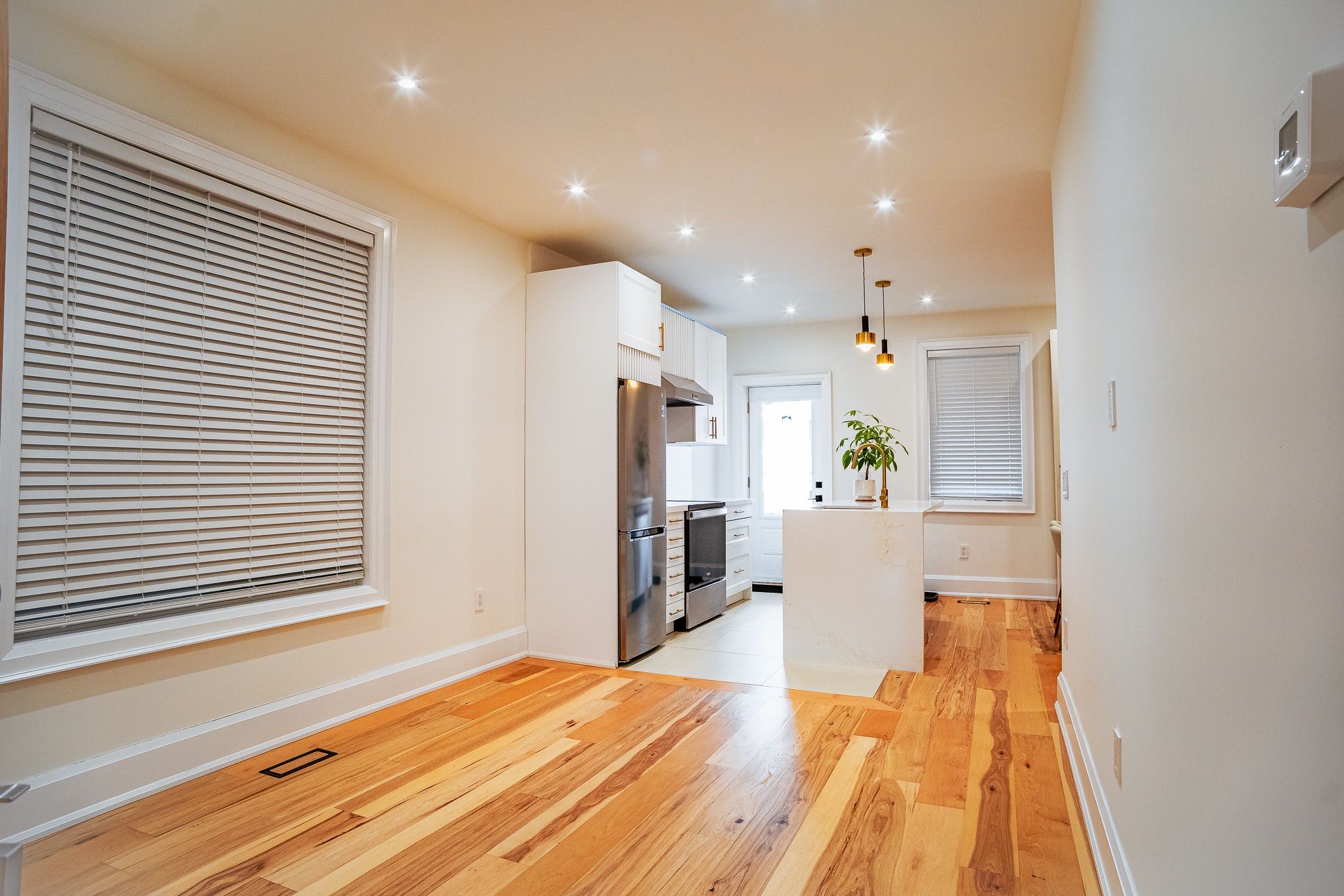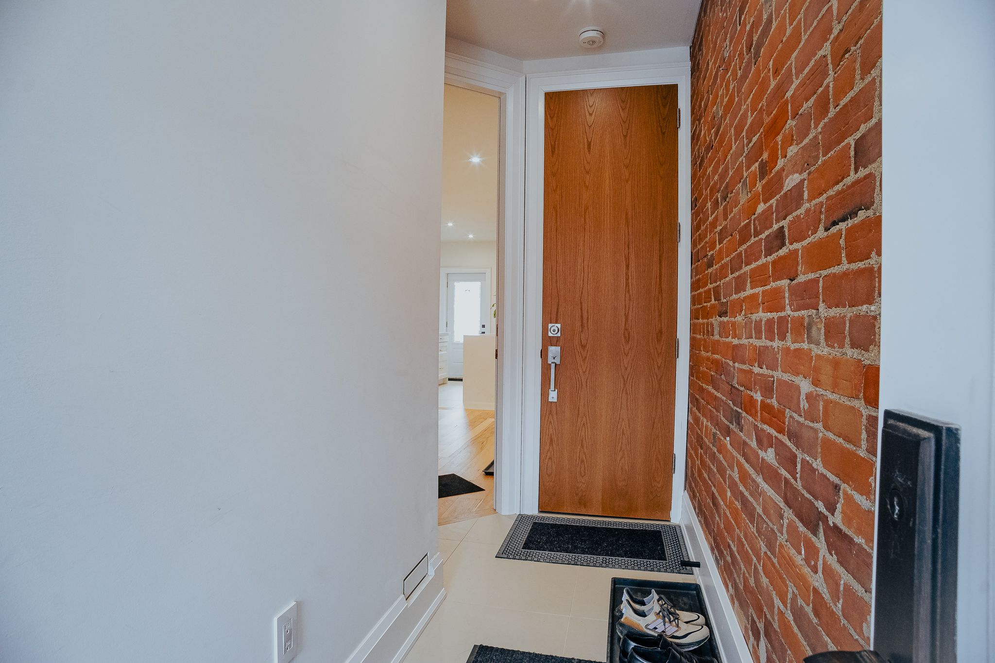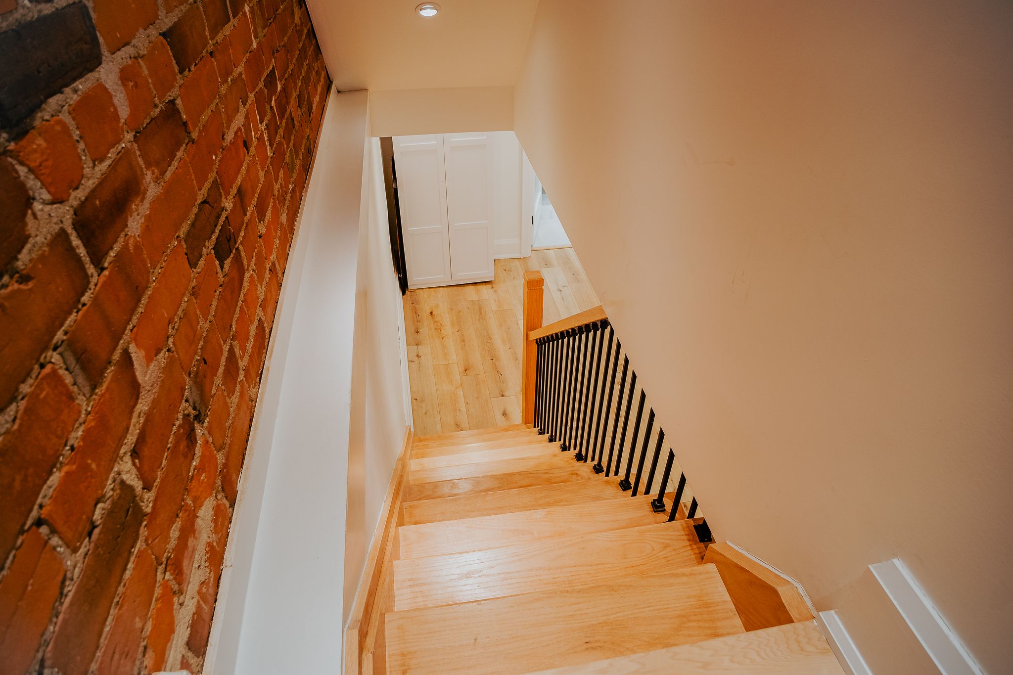 • Contemporary hardwood flooring and exposed brick accents showcase exceptional craftsmanship.