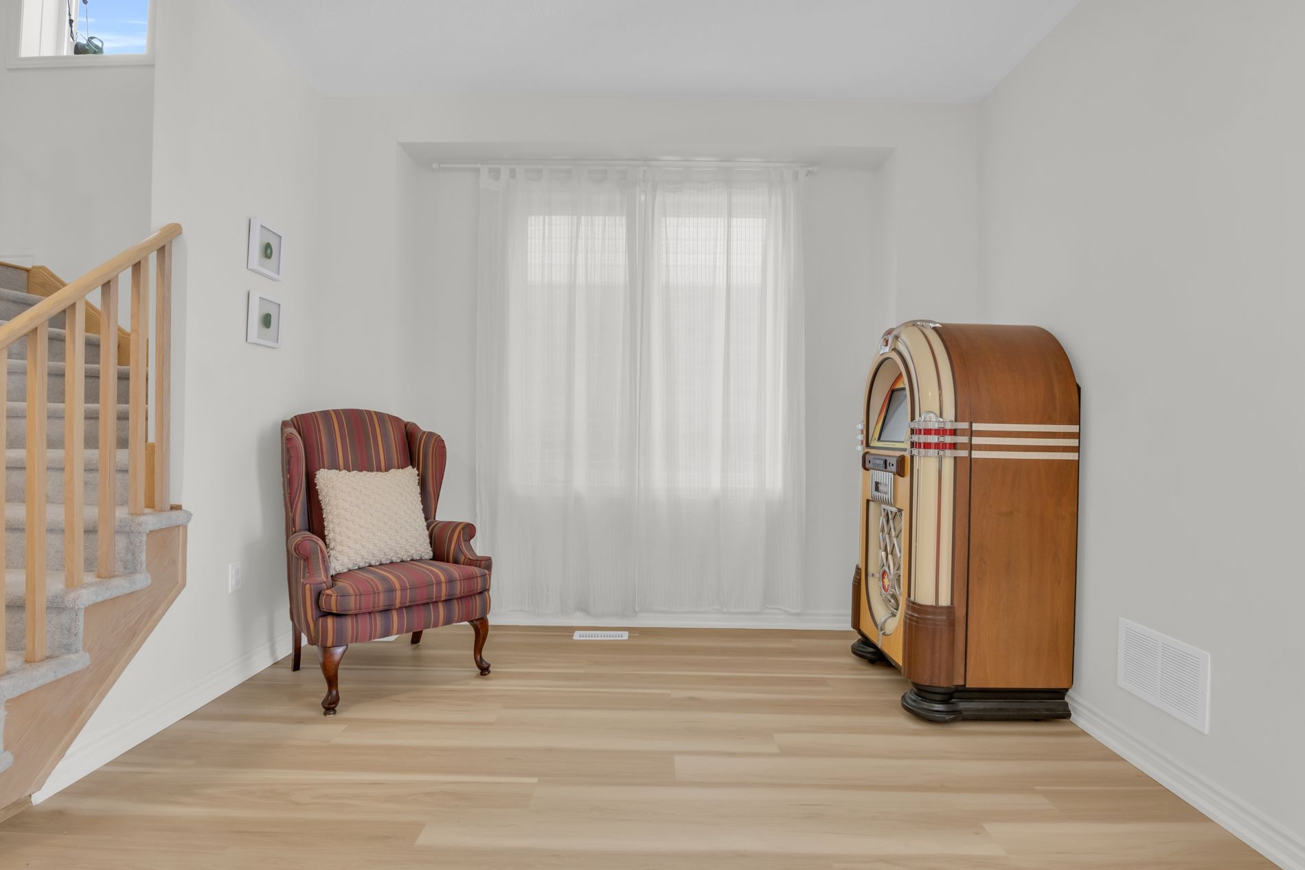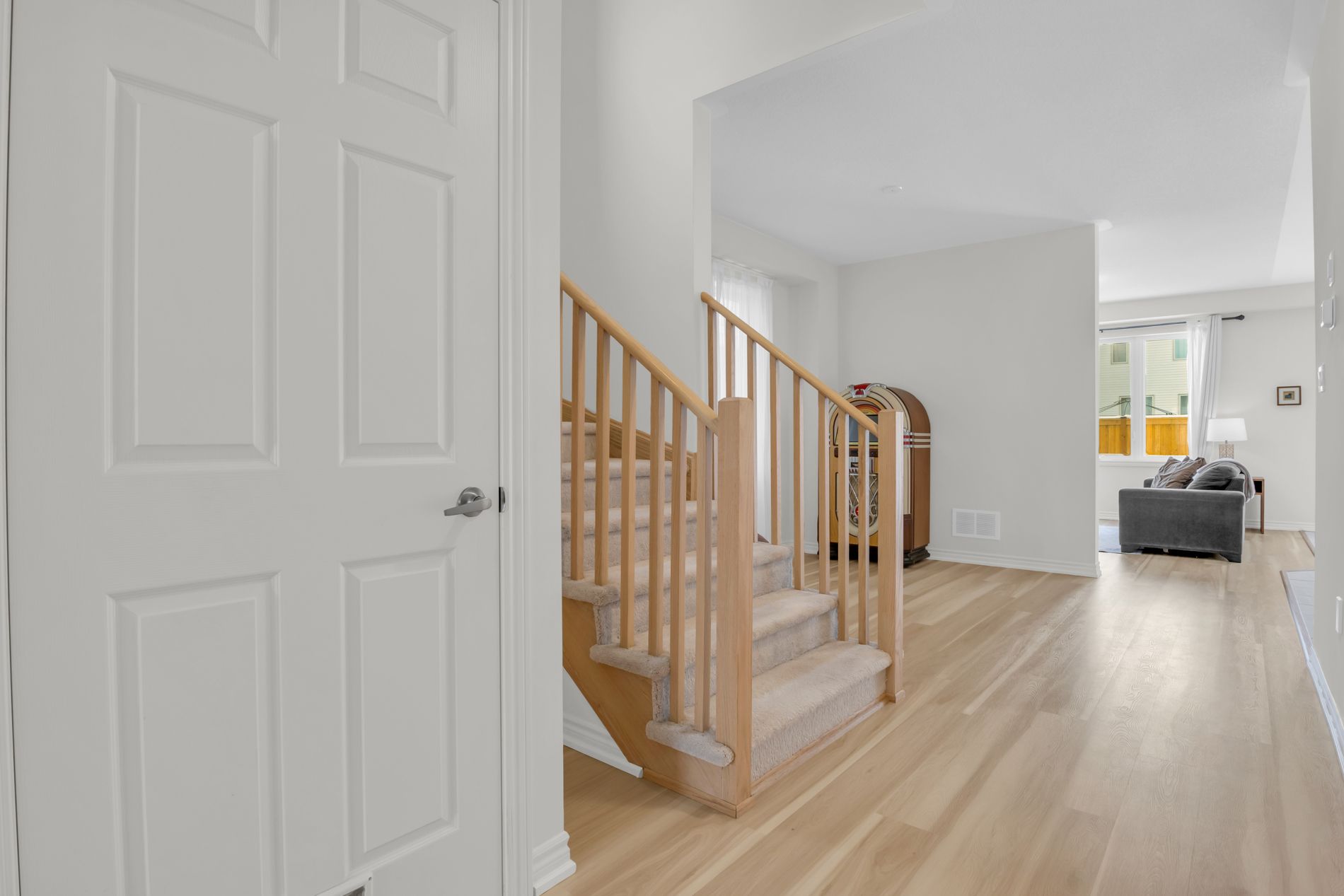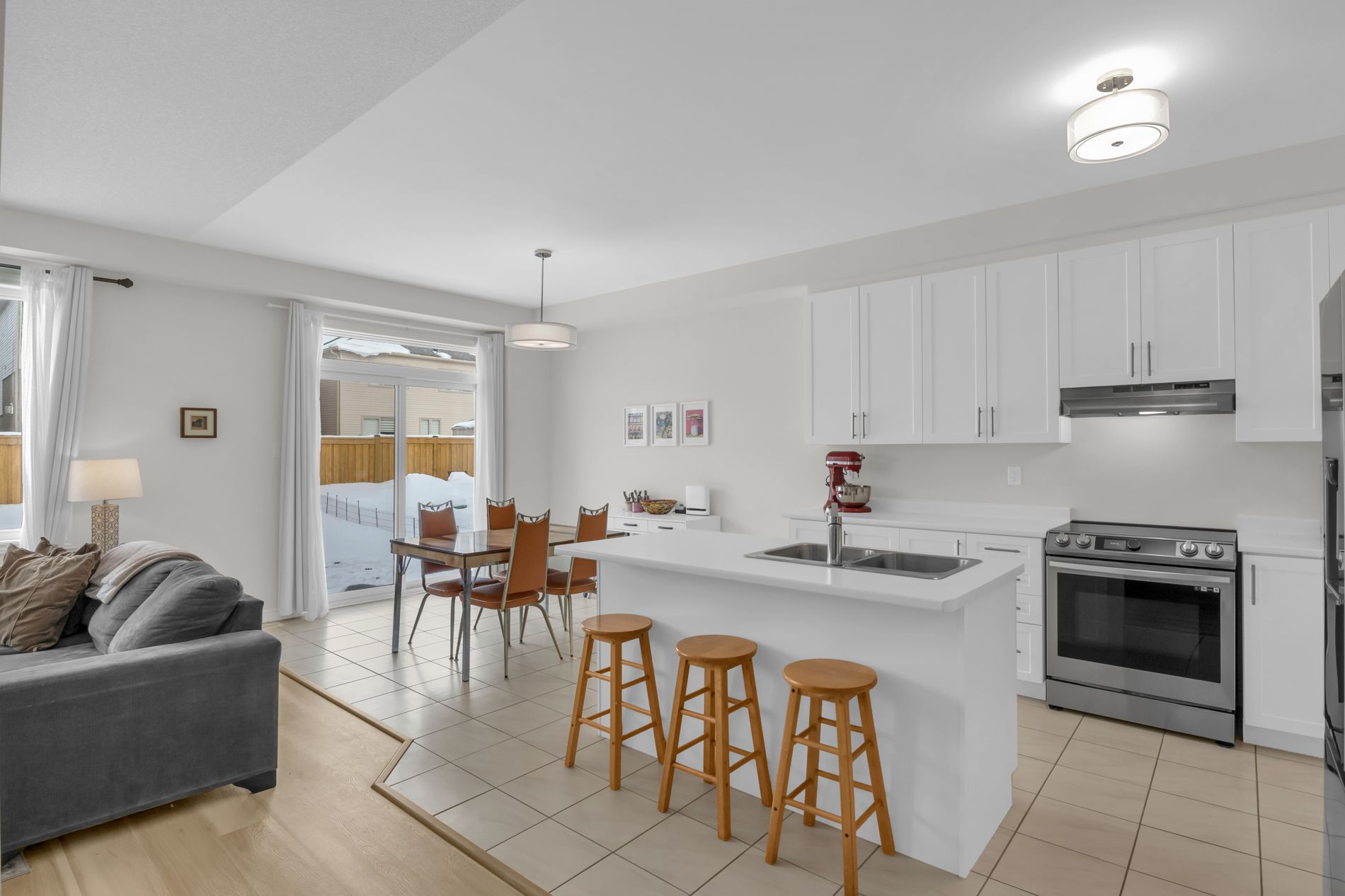 • Bright, open living space with large windows and new flooring.