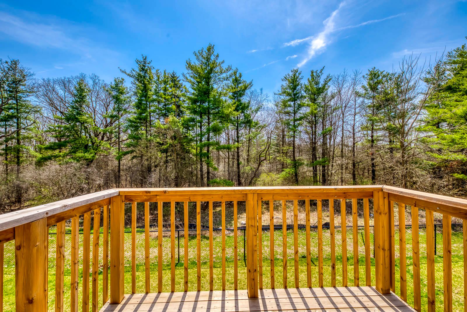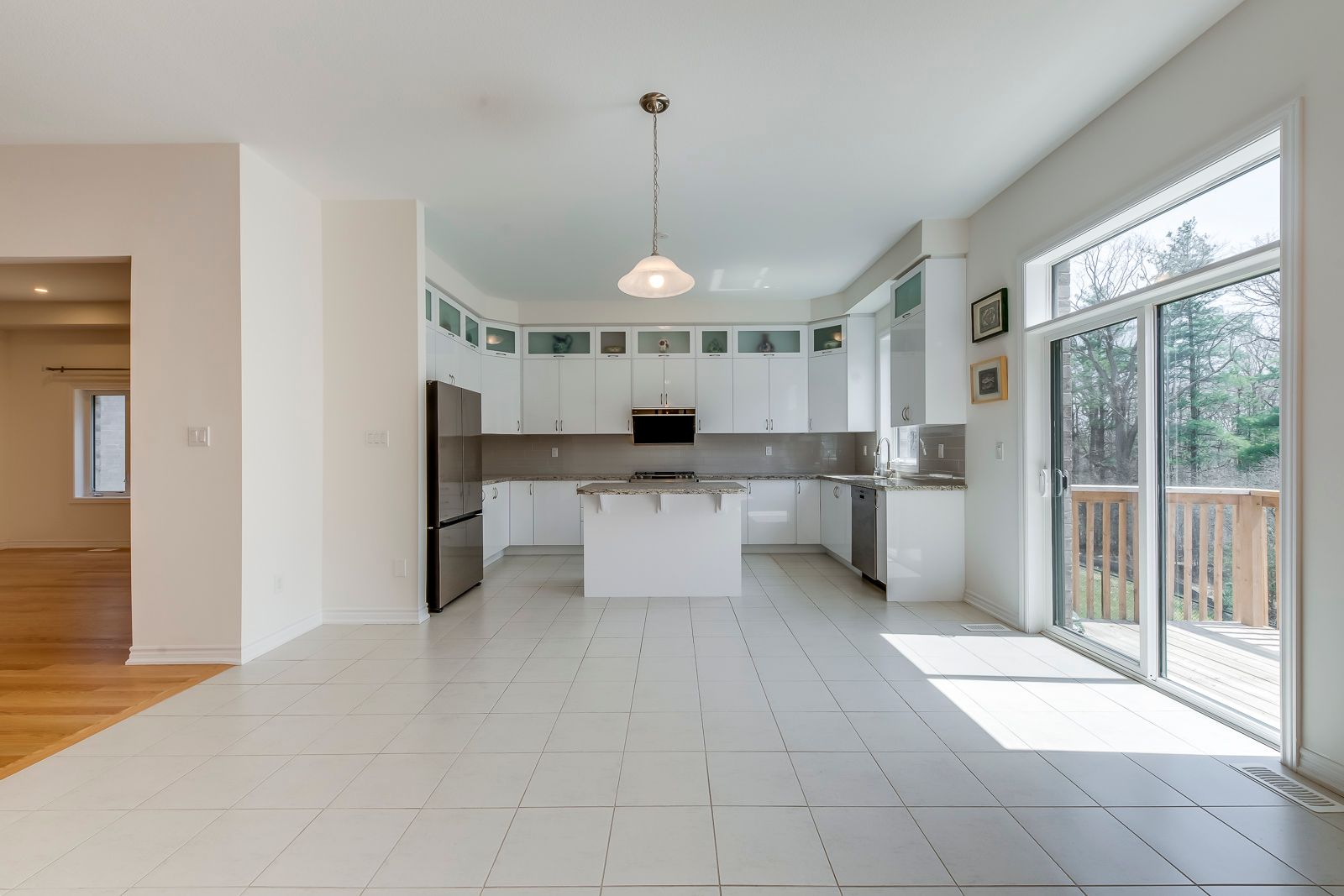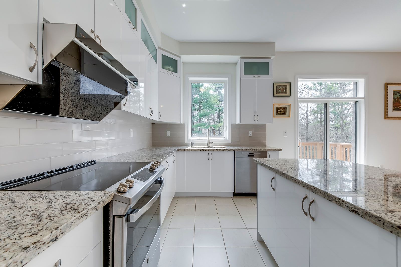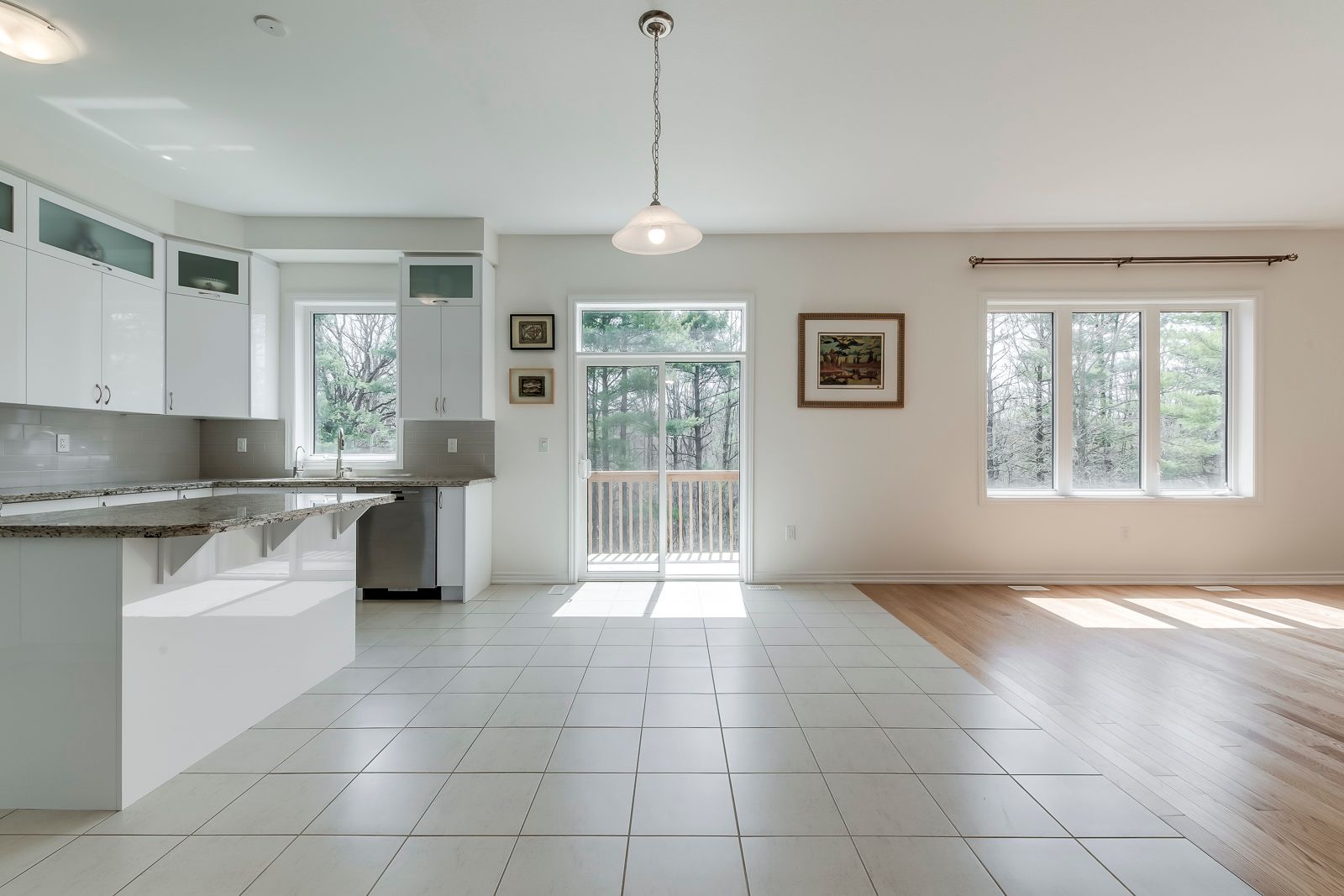 • Modern kitchen with upgraded cabinets and balcony overlooking forest views.