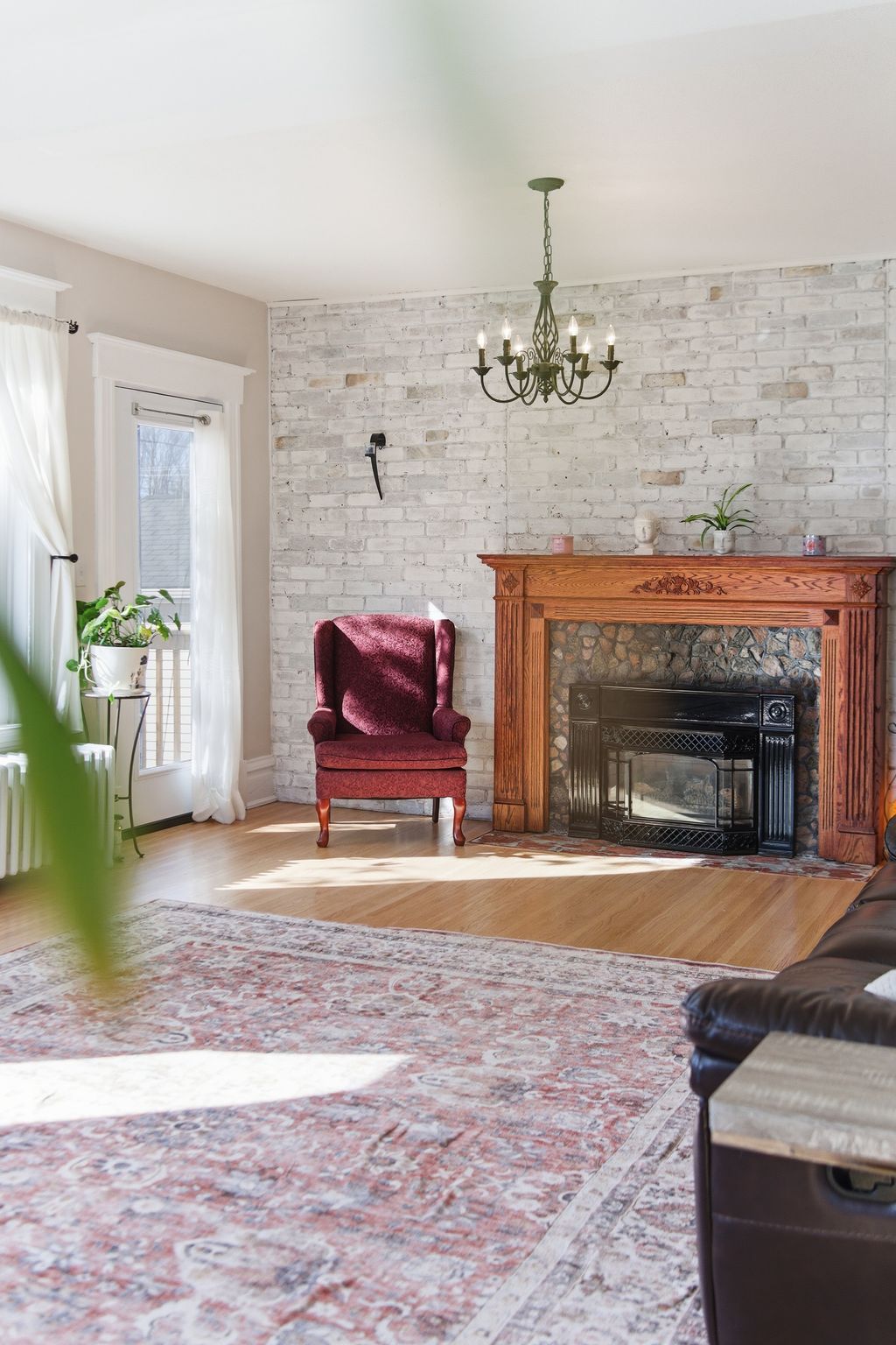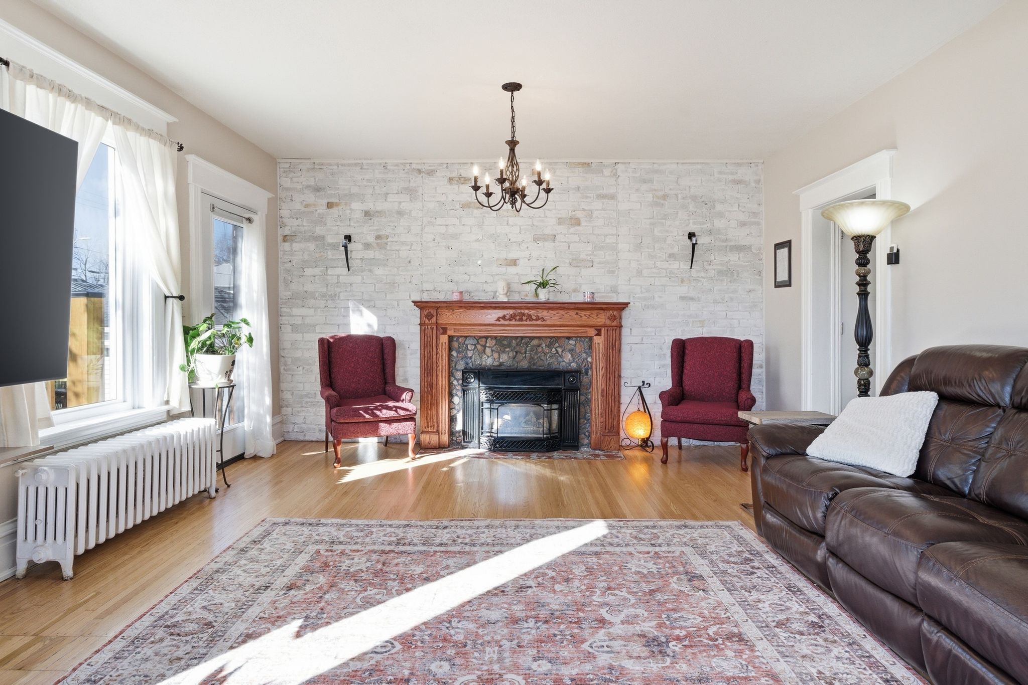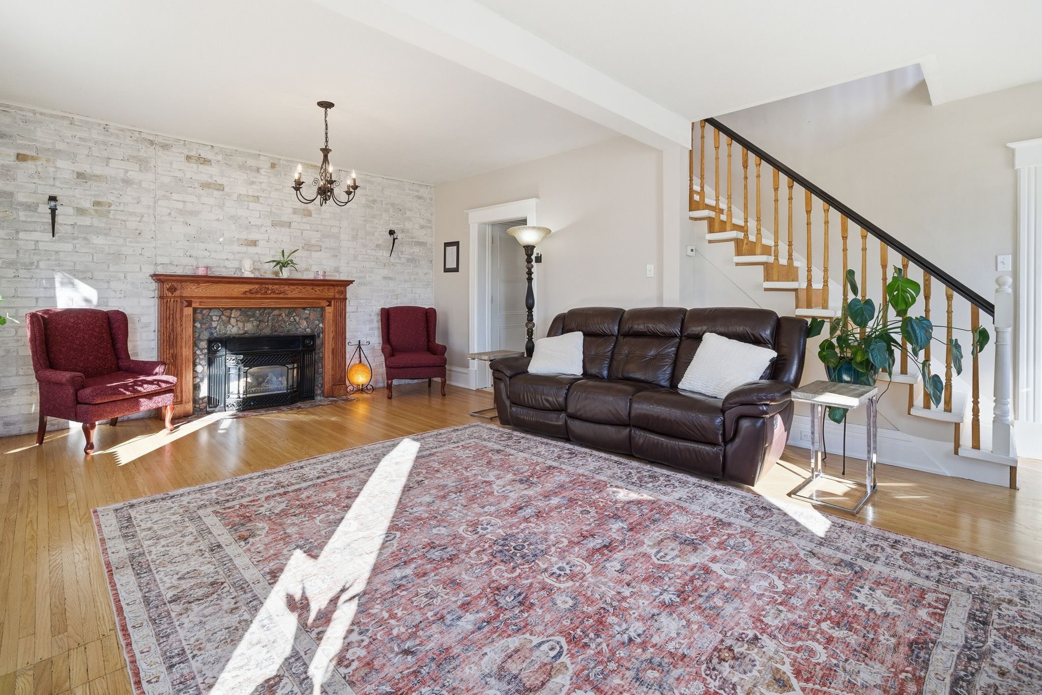 • Bright interior featuring refinished hardwood floors and a gas fireplace.