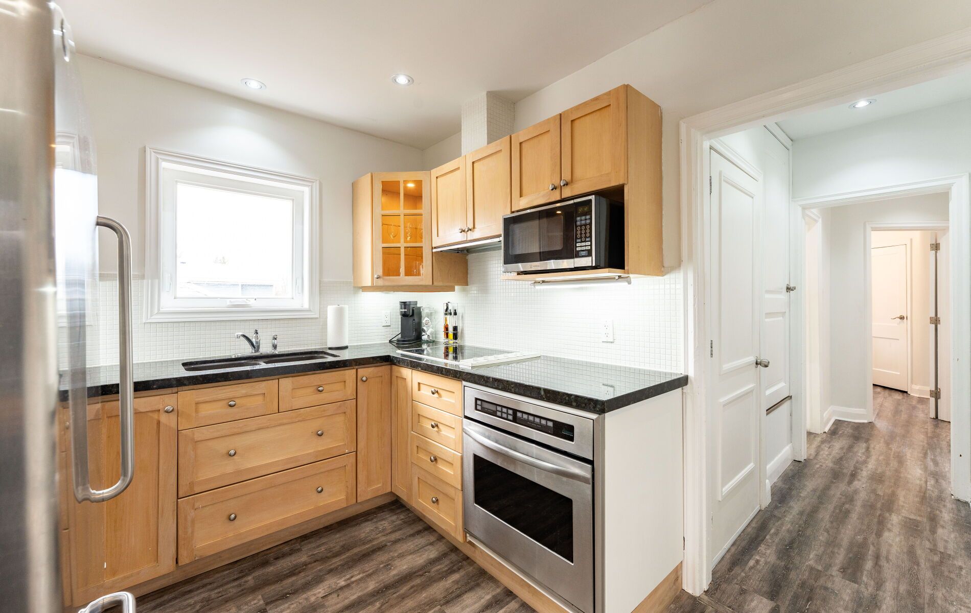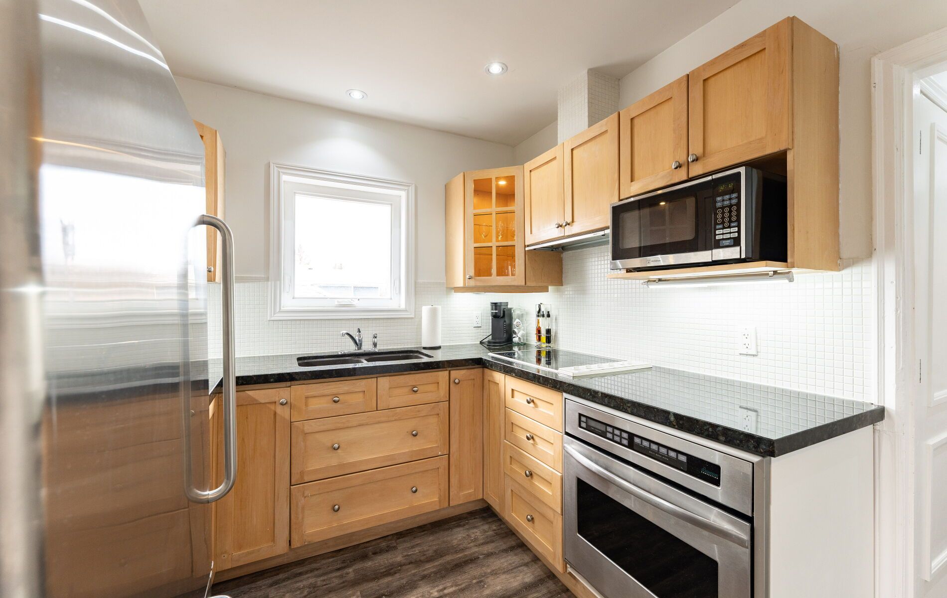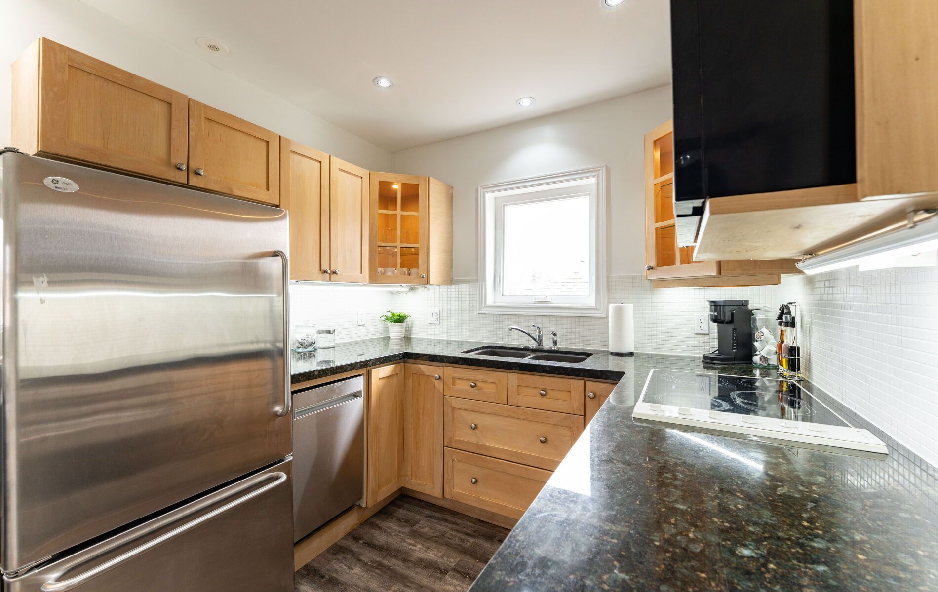 • Modern gourmet kitchen with granite counters and stainless steel appliances.
