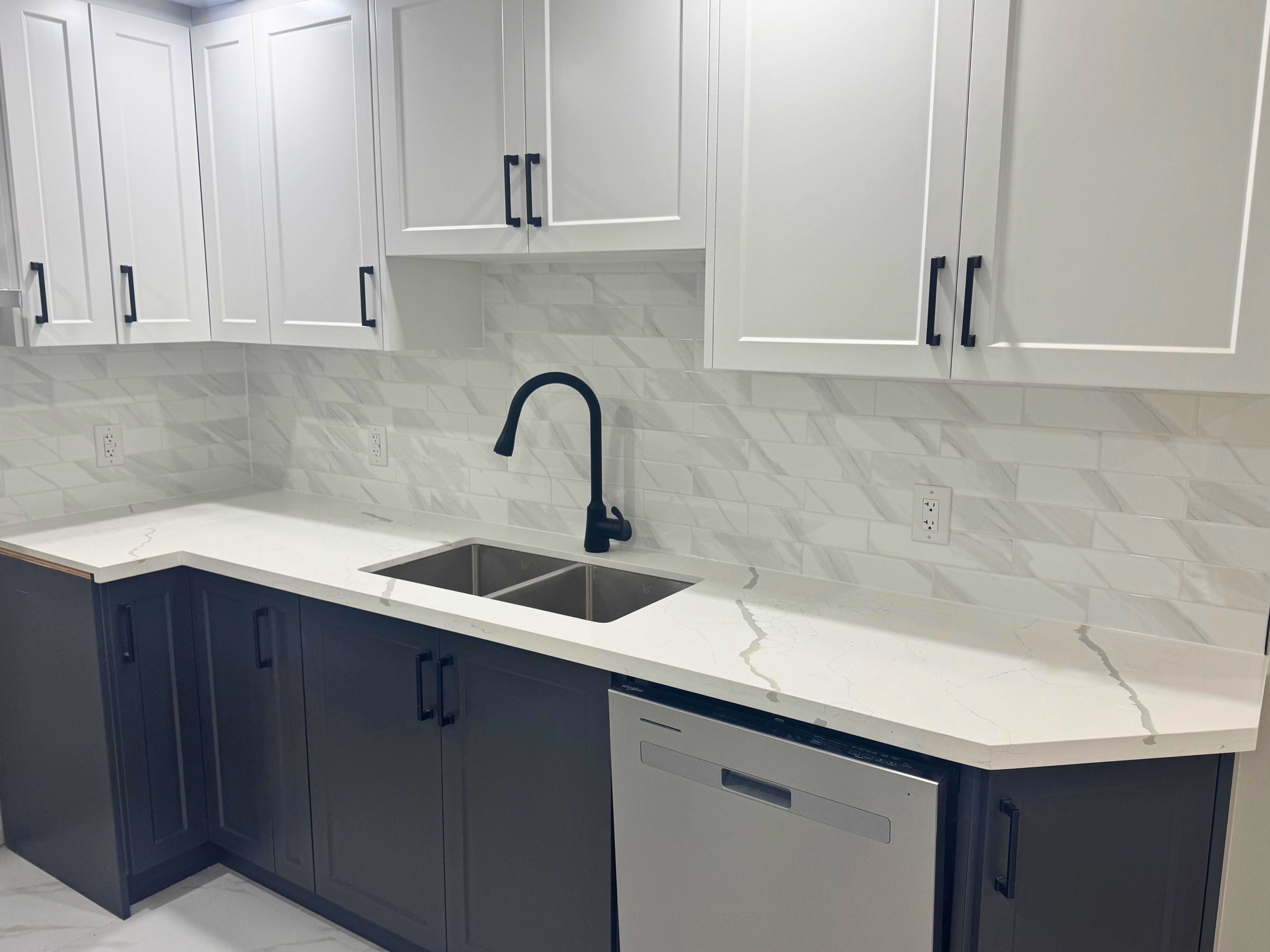 • Stylish kitchen with quartz countertops and space for stainless steel appliances.