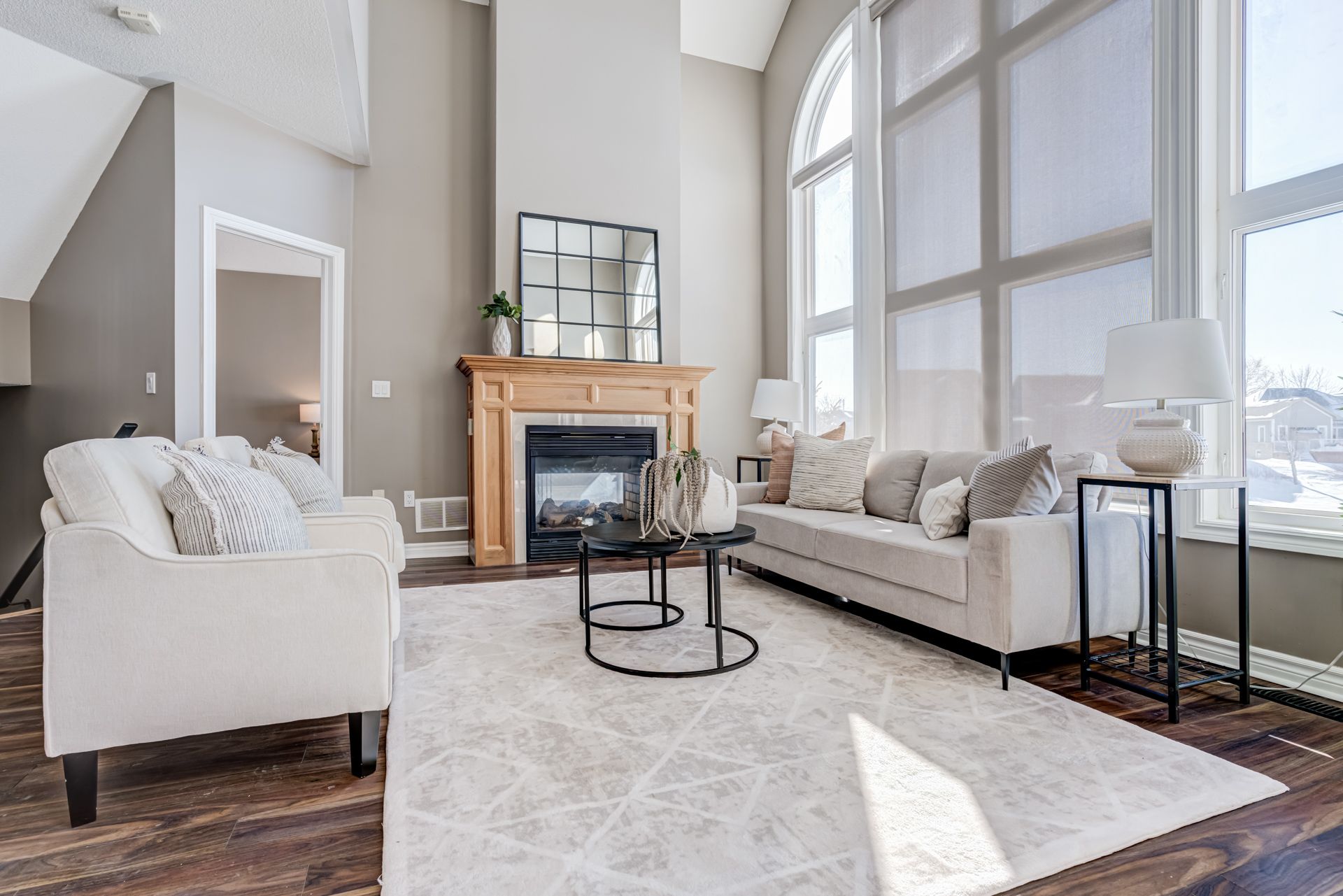 • Open-concept living area with a double-sided gas fireplace and cathedral ceilings.