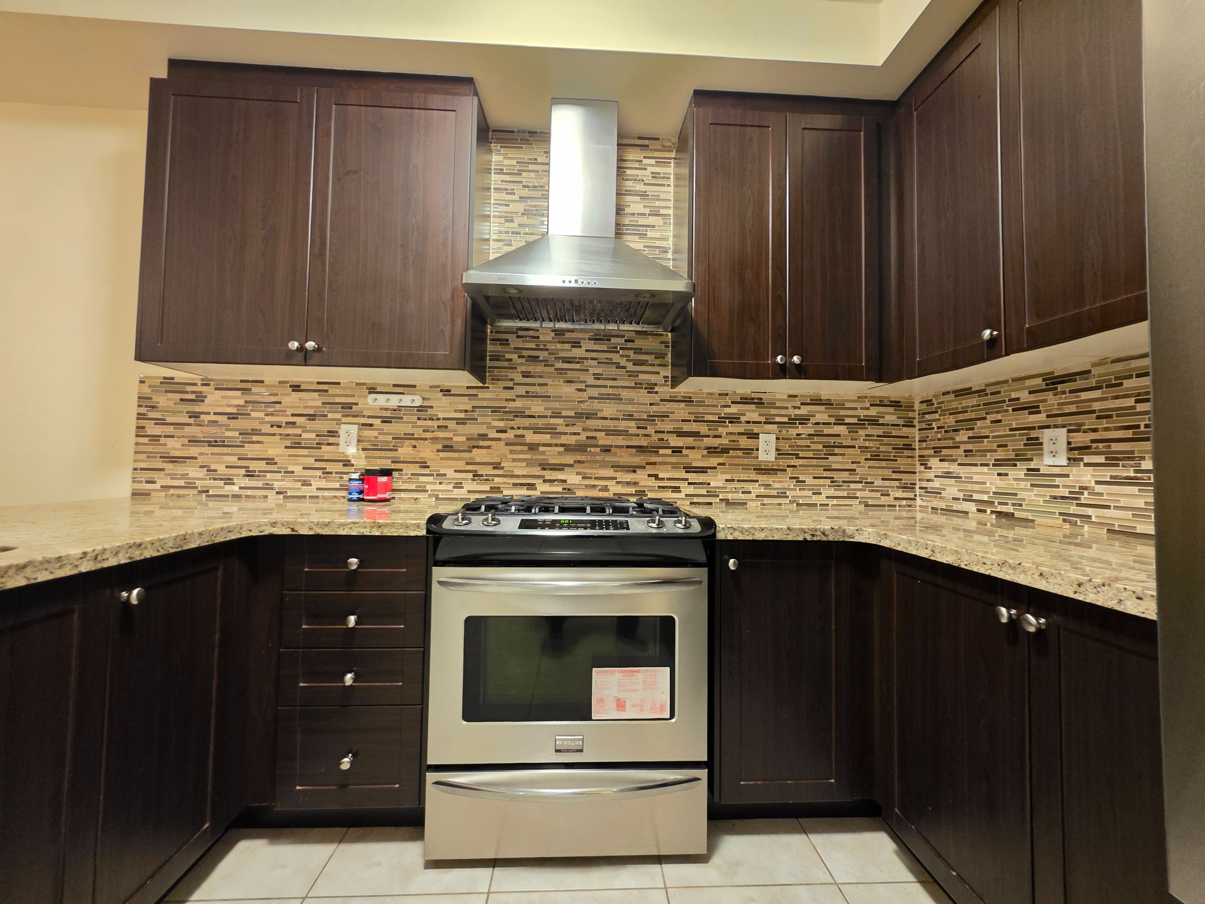• Modern kitchen featuring granite countertops and stainless steel appliances.