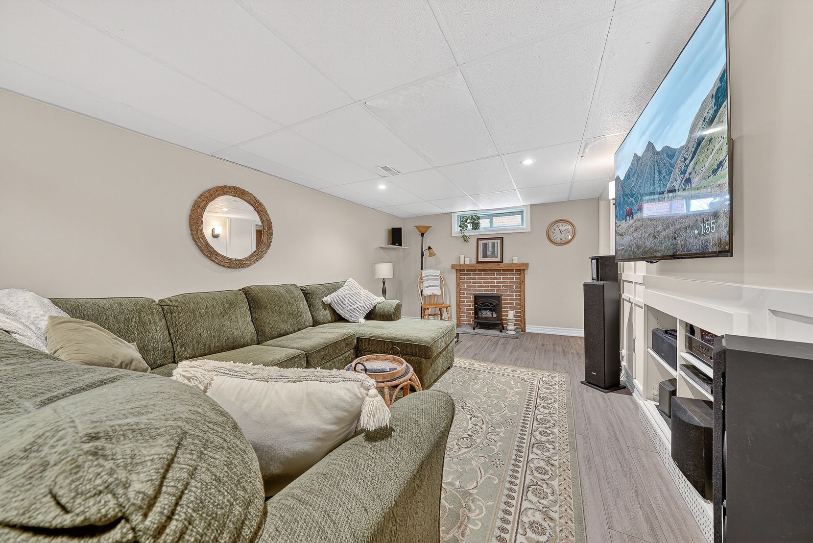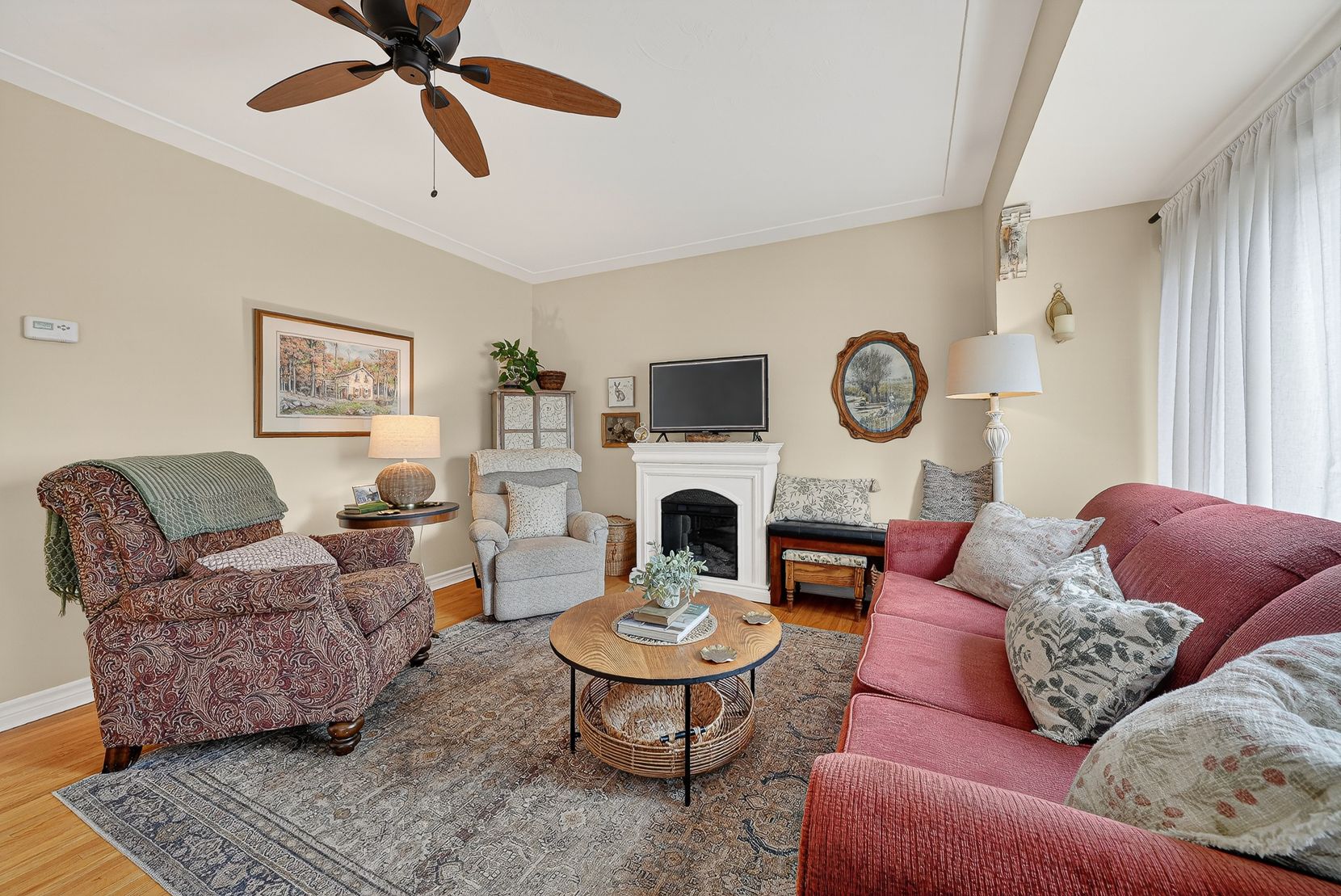 • Bright living room featuring large windows and a cozy fireplace.