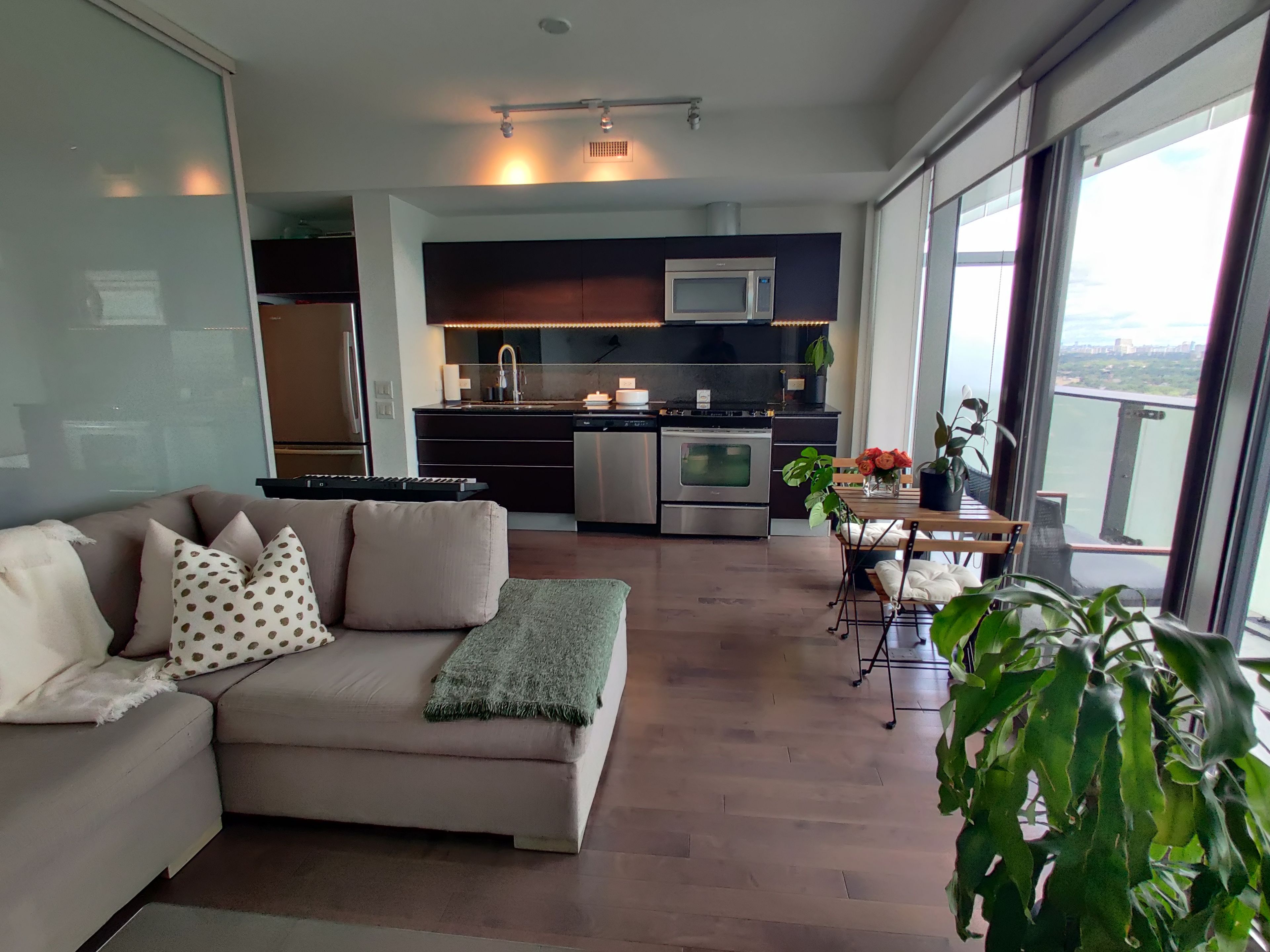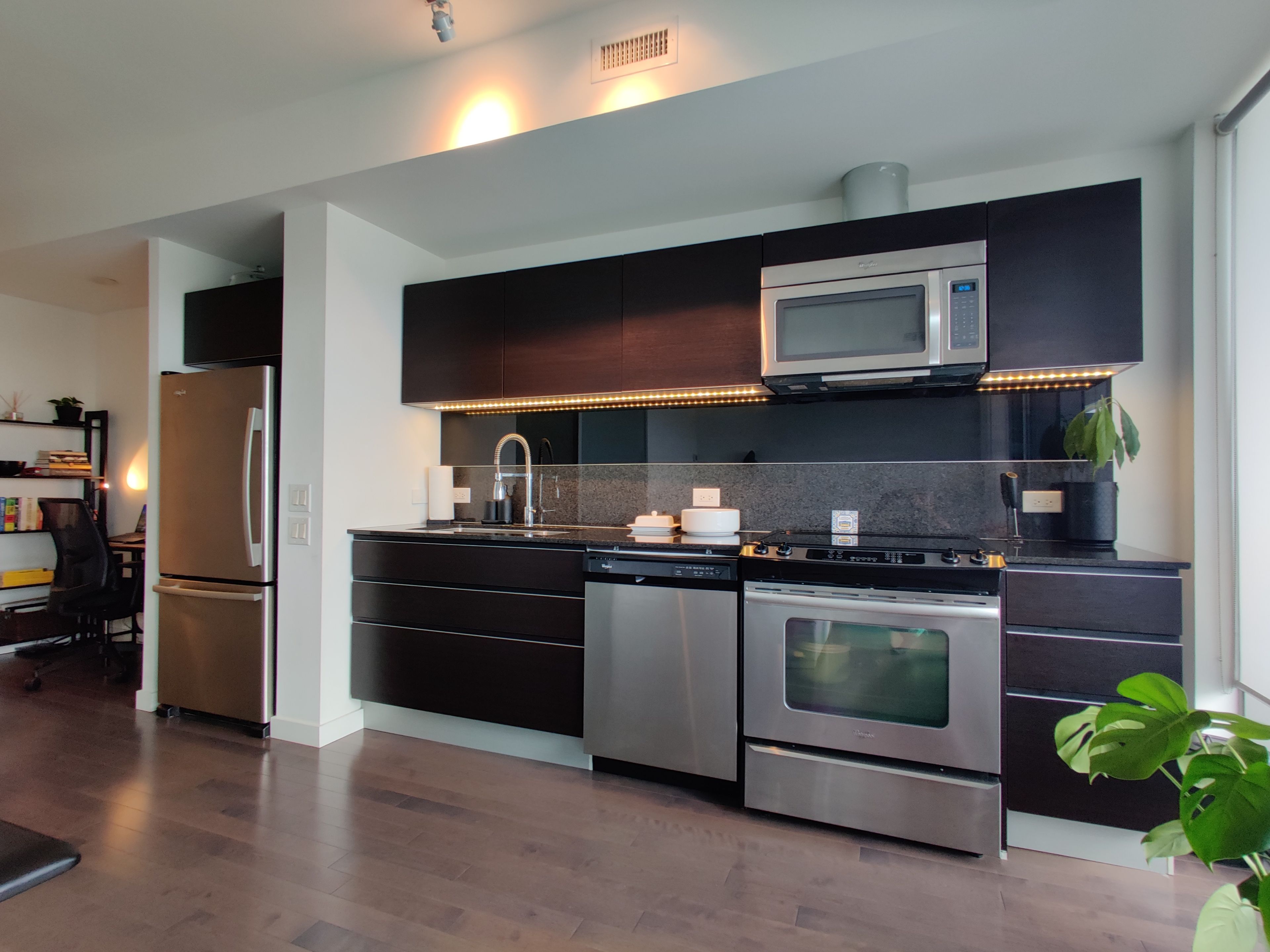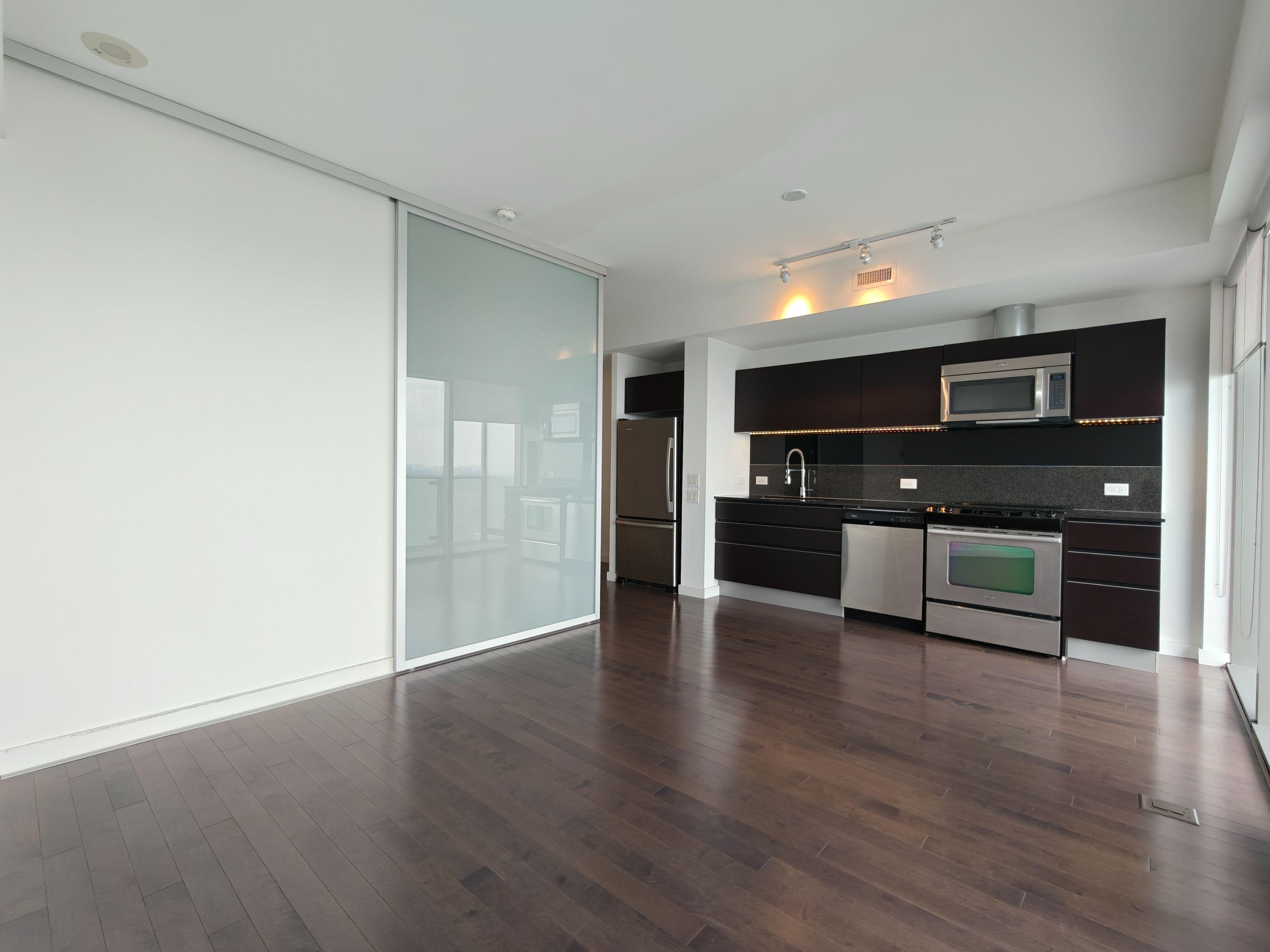 • One-bedroom plus study with modern kitchen and granite countertops.