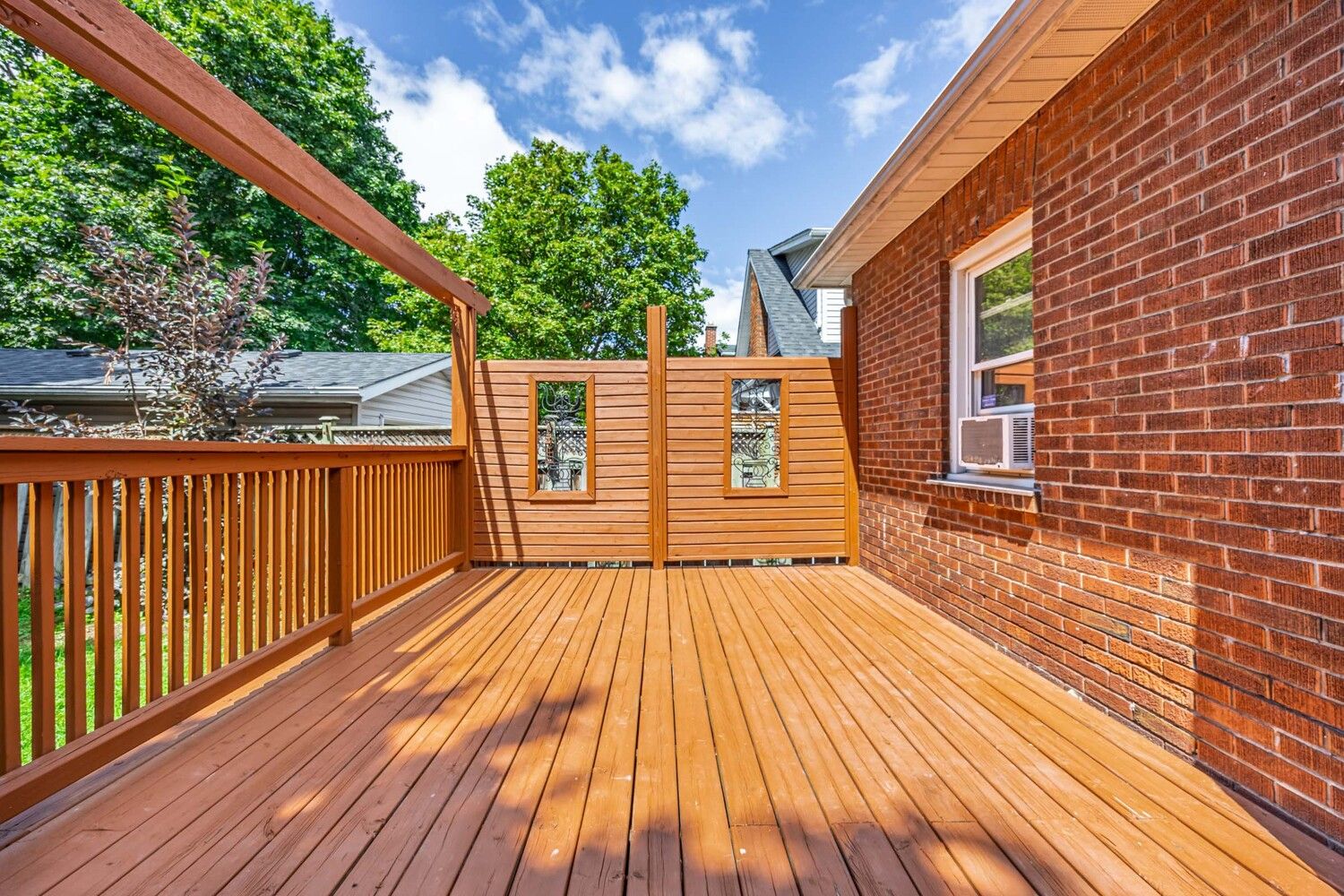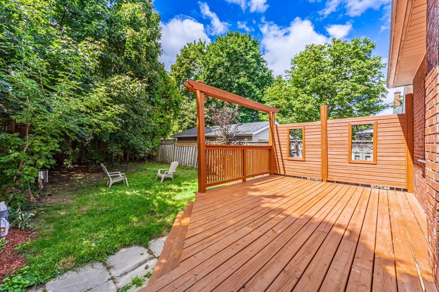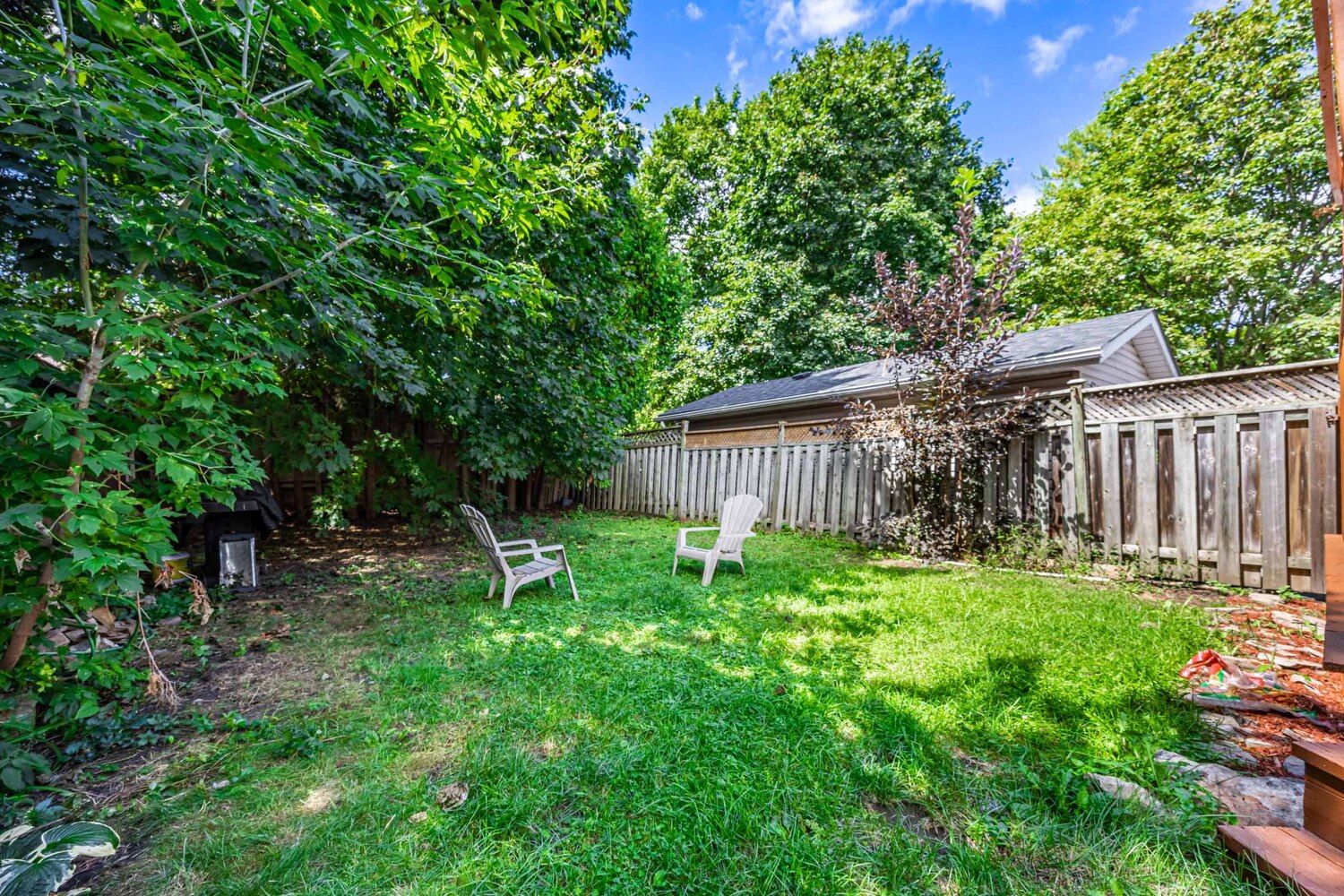 • Spacious tree-lined backyard with a walk-out deck for gatherings.