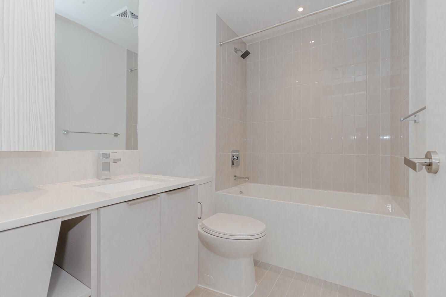 • Modern kitchen equipped with stainless steel appliances and quartz countertops.