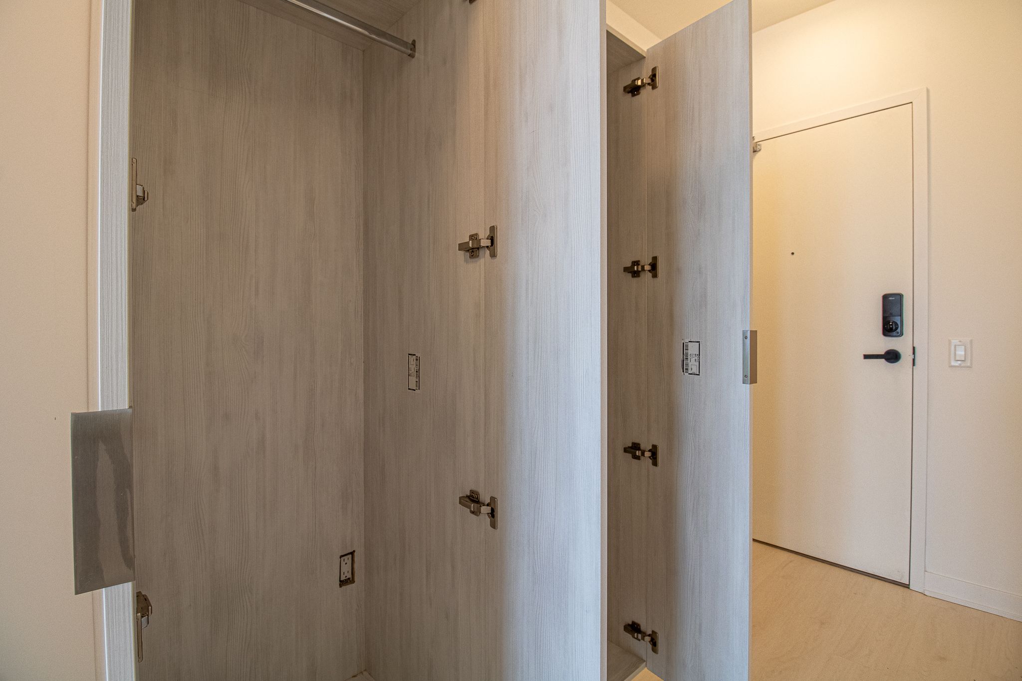 • Modern kitchen features quartz countertops and built-in appliances.