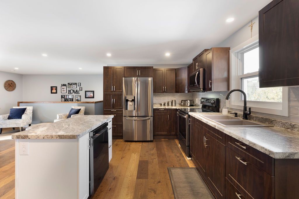 • Bright, updated kitchen with black stainless steel appliances and granite sink.