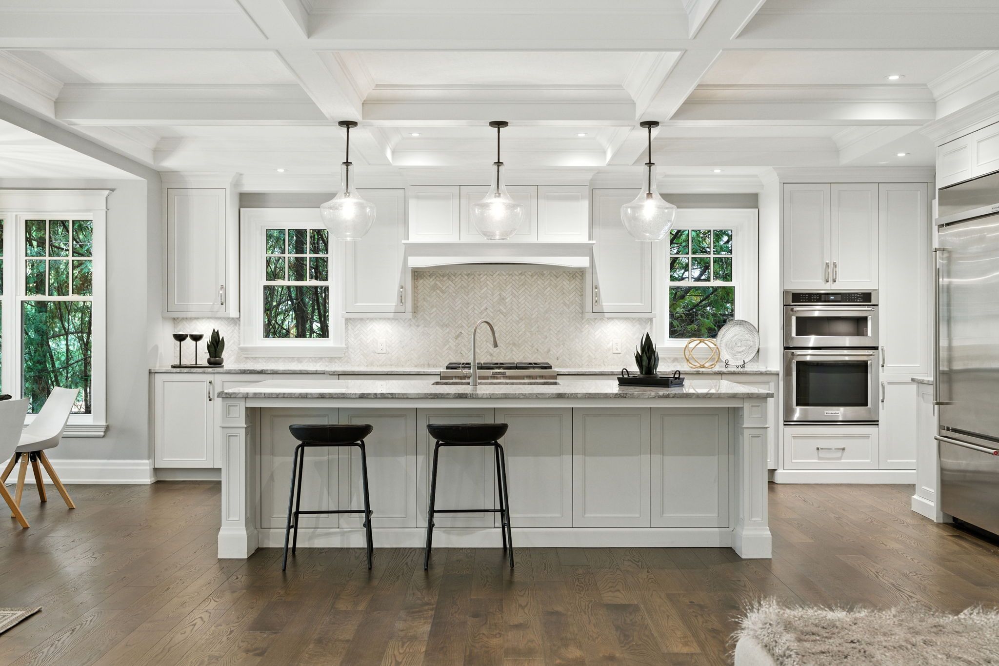 • Gourmet kitchen with large island and built-in stainless steel appliances.