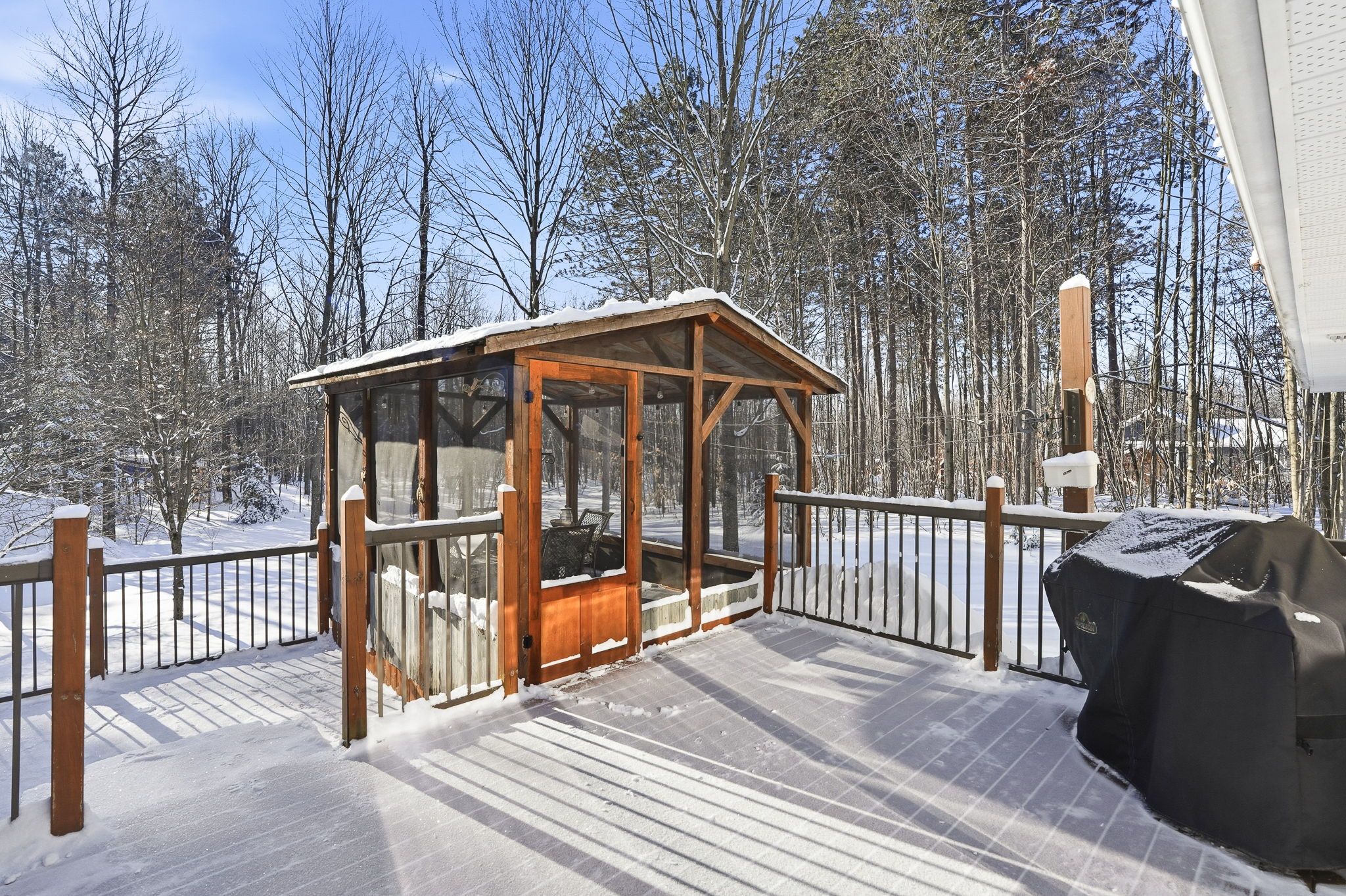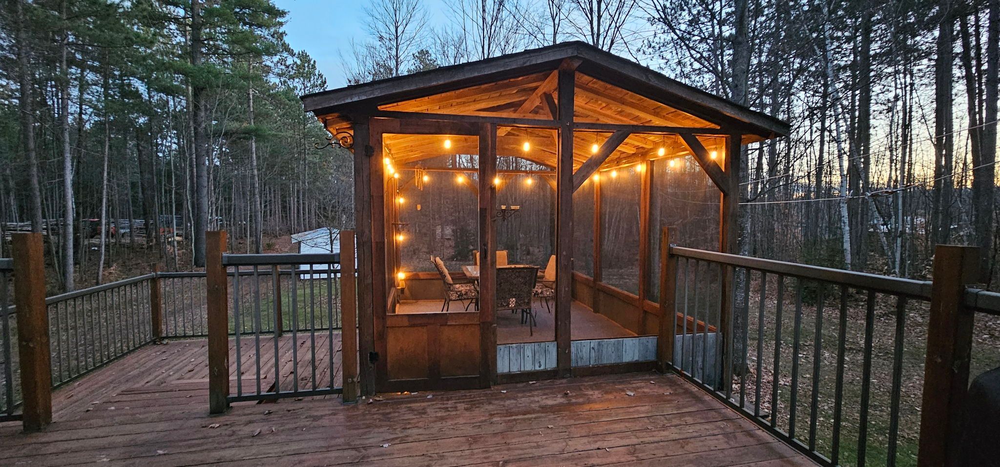 • Outdoor deck with gazebo surrounded by mature trees for relaxation.
