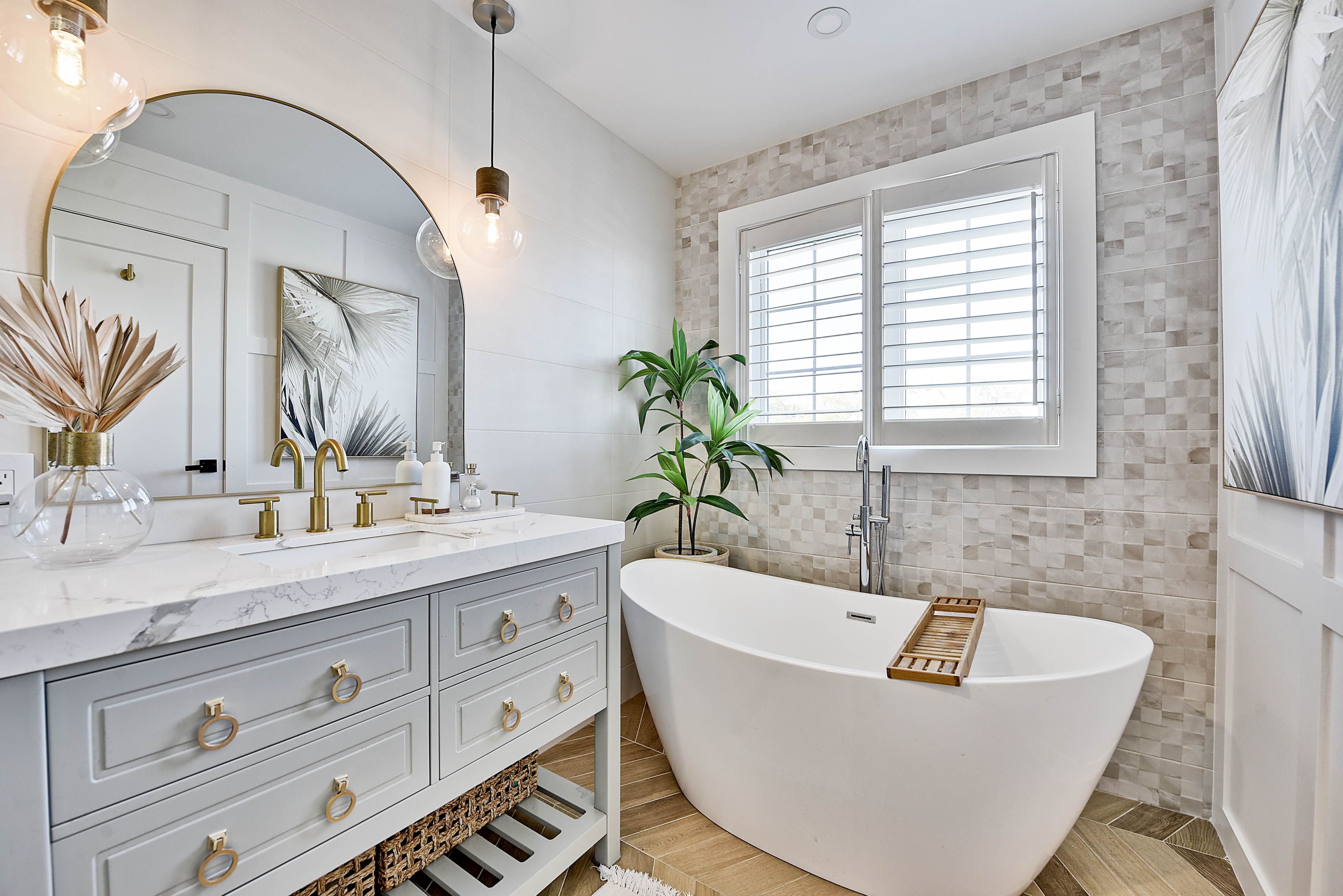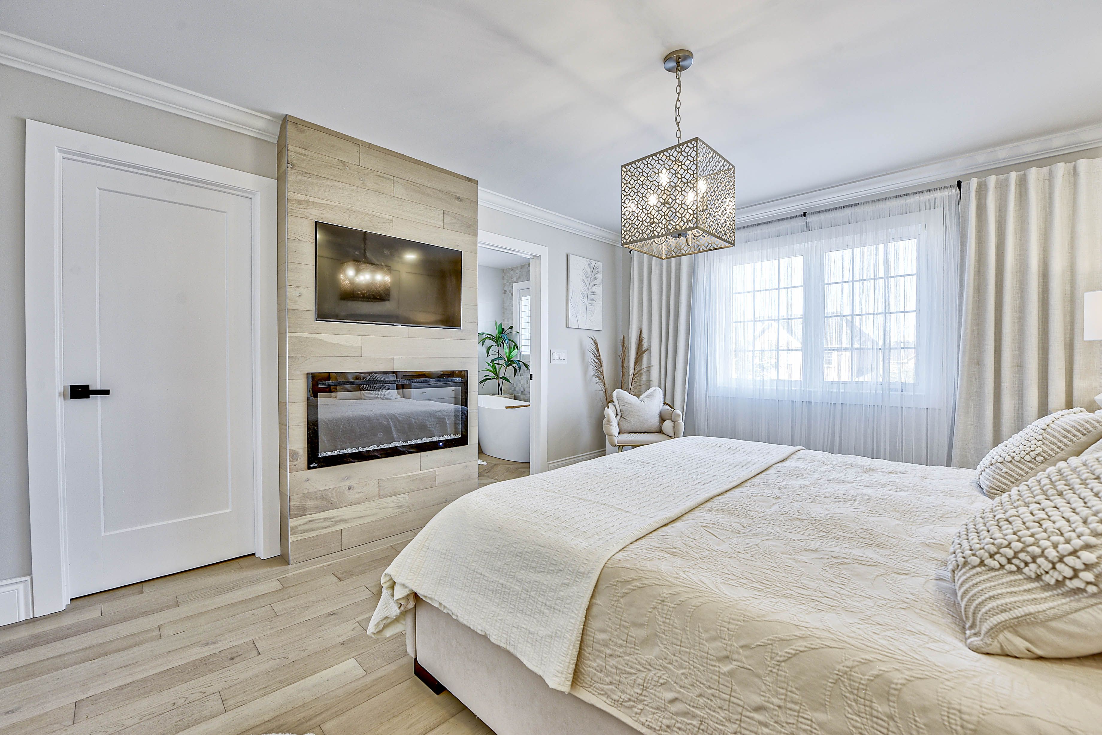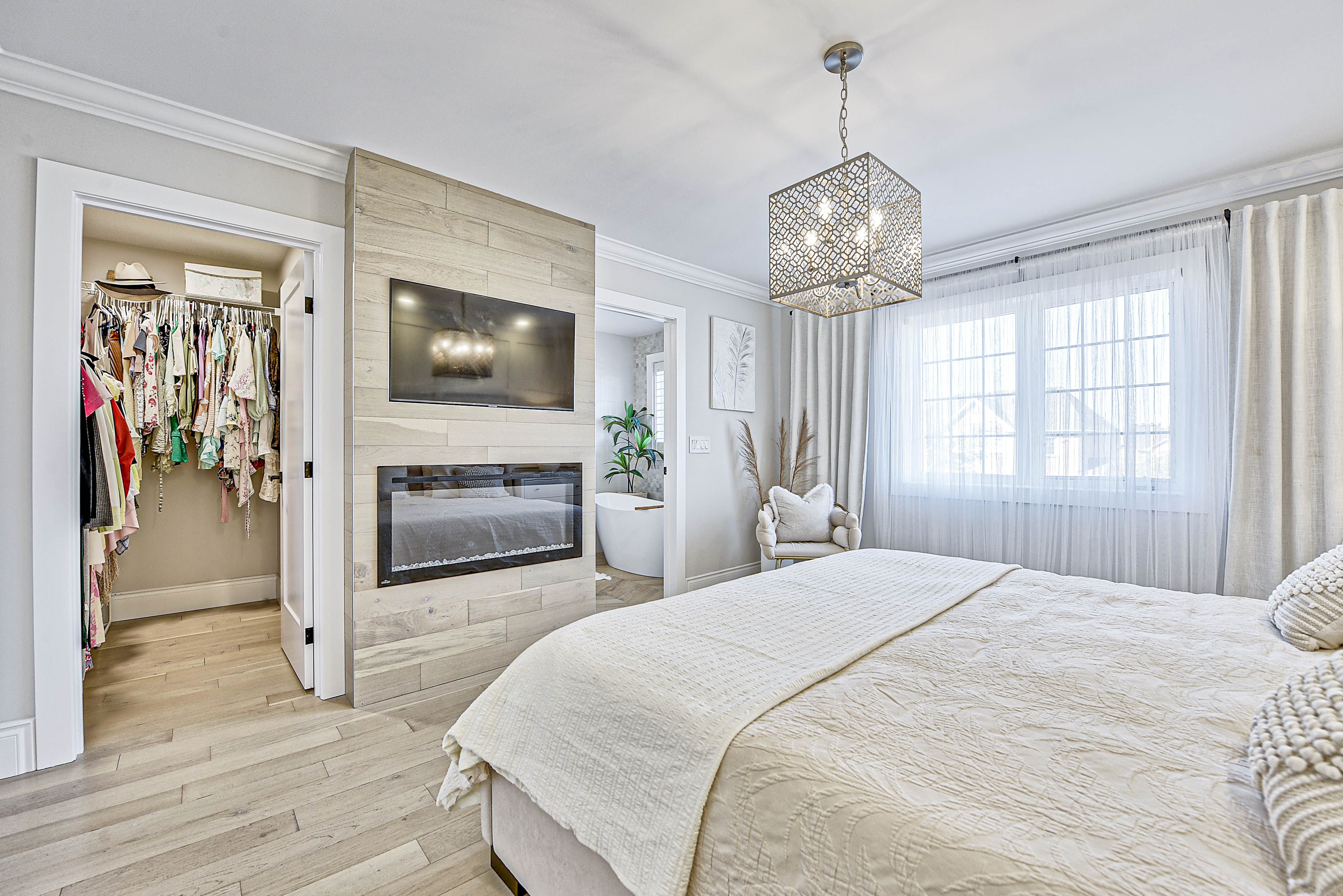 • Primary bedroom features a modern ensuite with heated floors and freestanding bath.