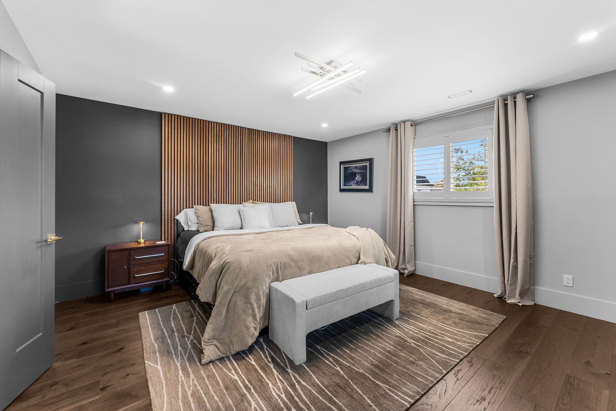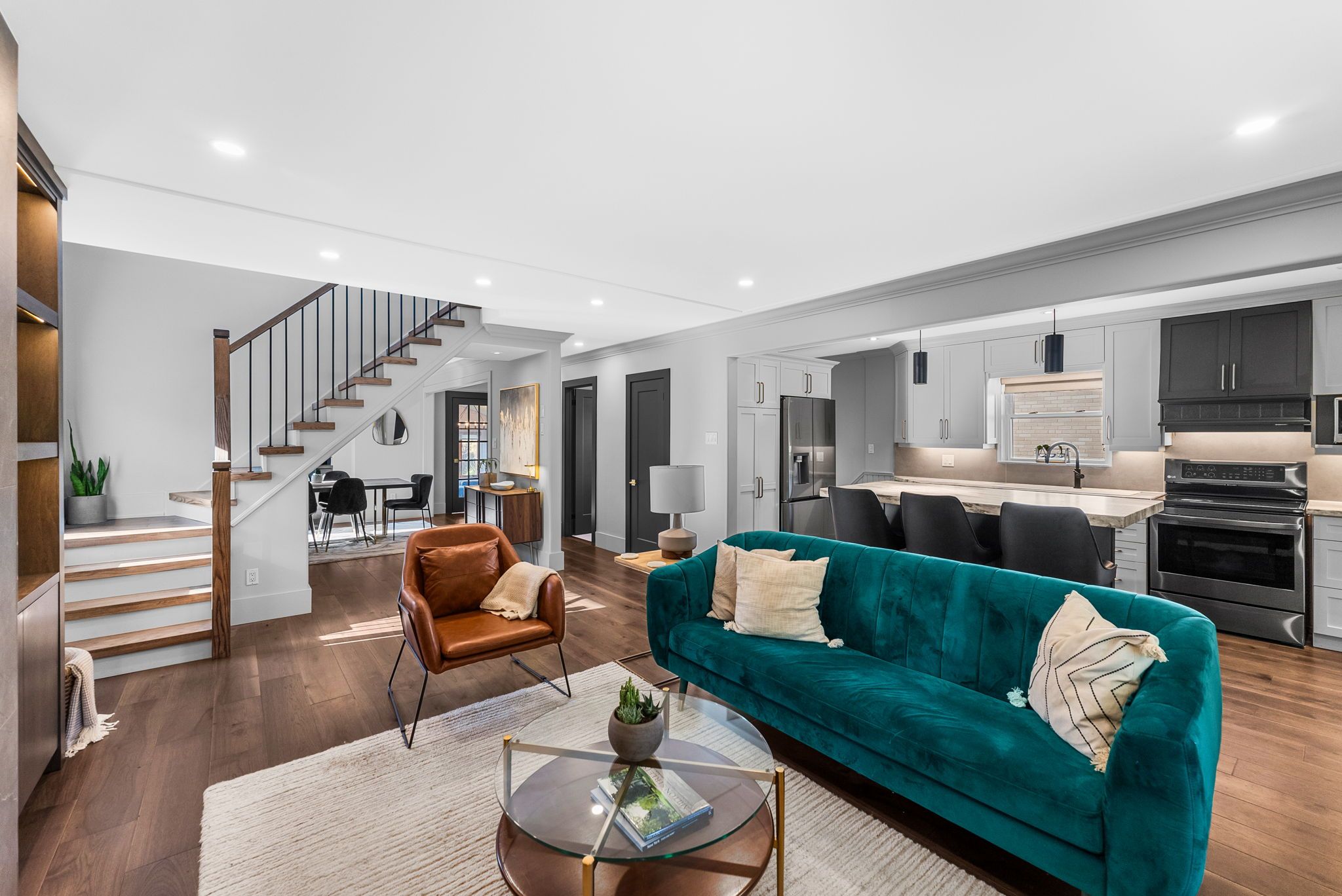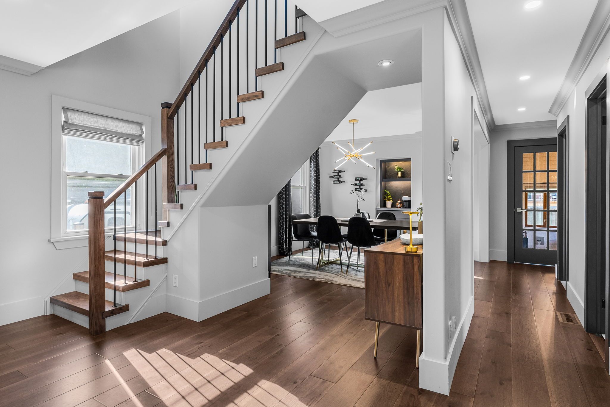 • Luxury engineered hardwood flooring and custom staircase enhance the stylish interior.