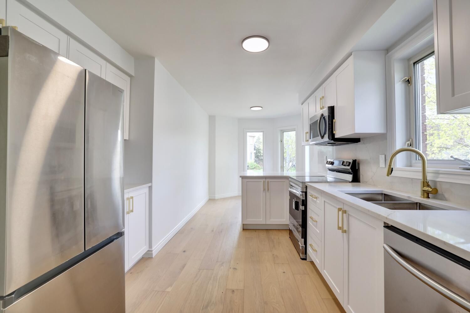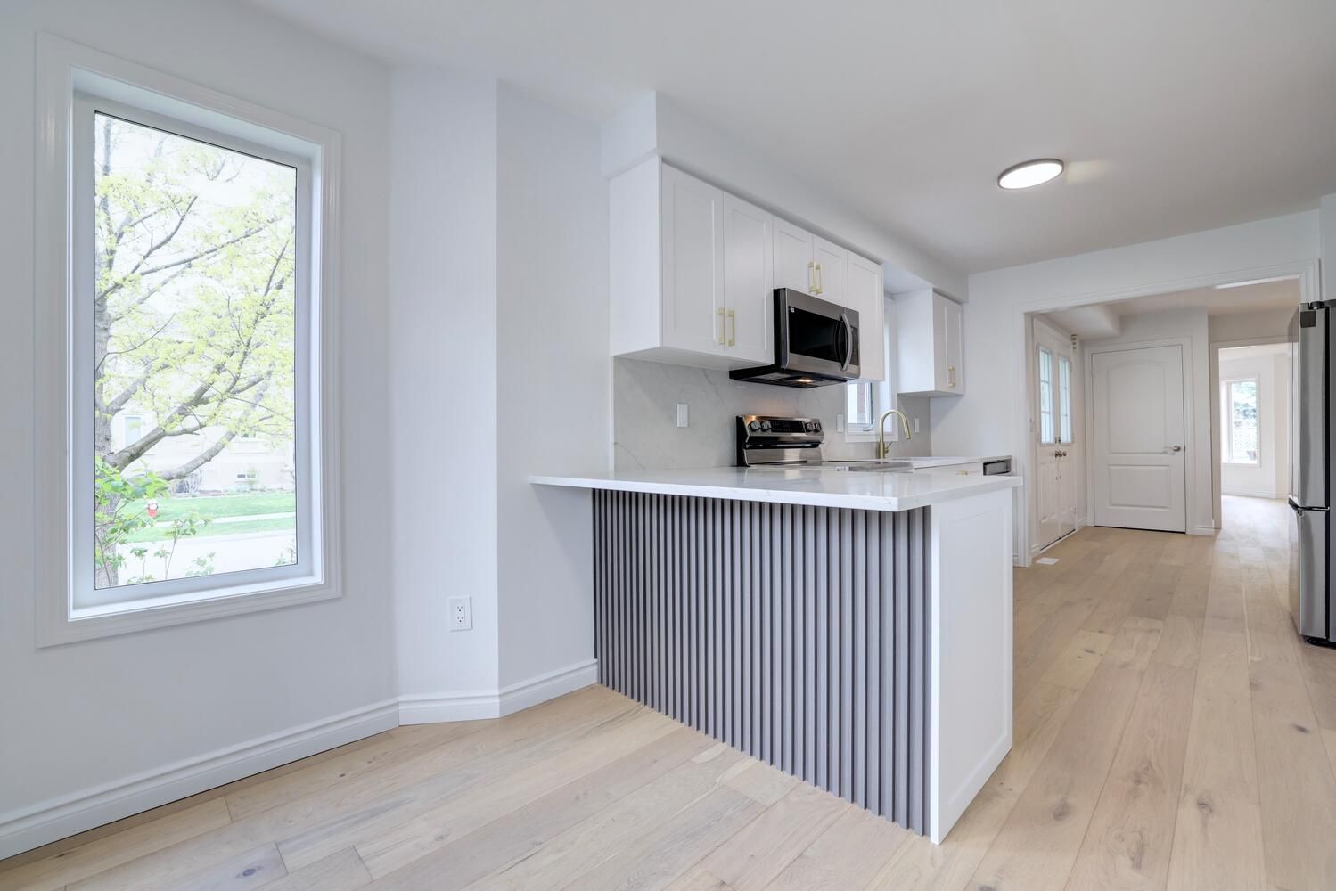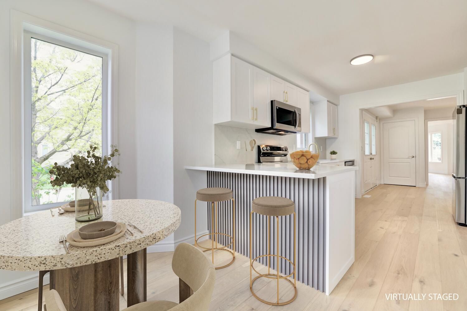 • Spacious eat-in kitchen with modern stainless steel appliances and quartz counters.
