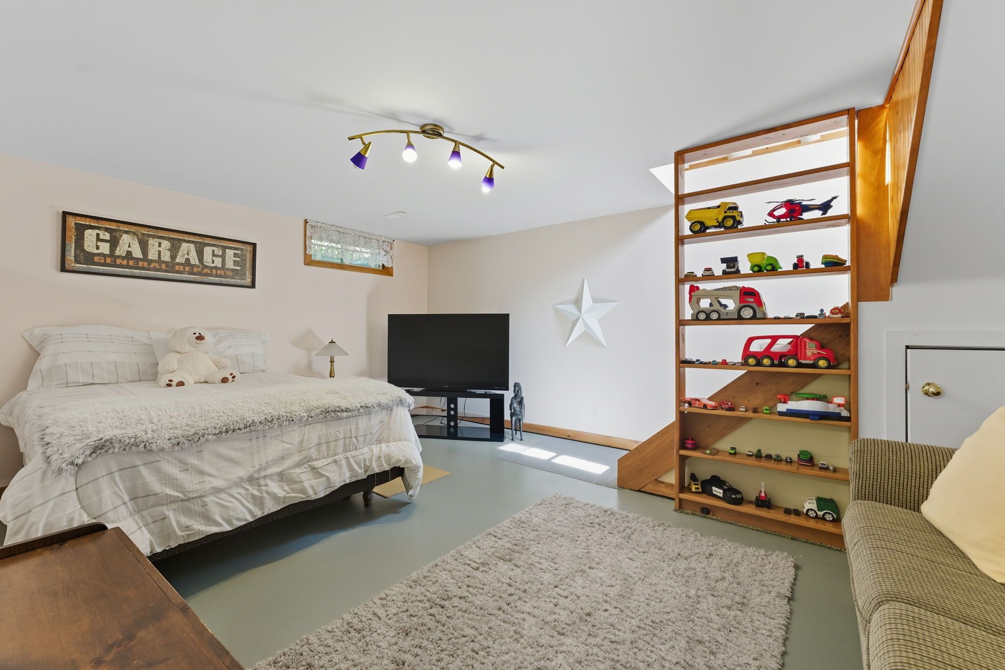 • Cozy fireplace efficiently heats bedrooms and basement.