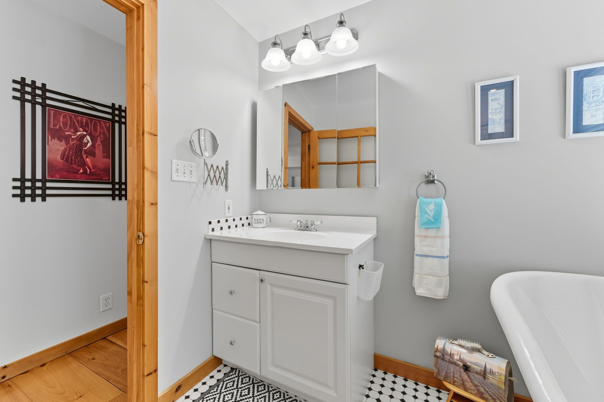 • Warm pine floors throughout add rustic charm and beauty.
