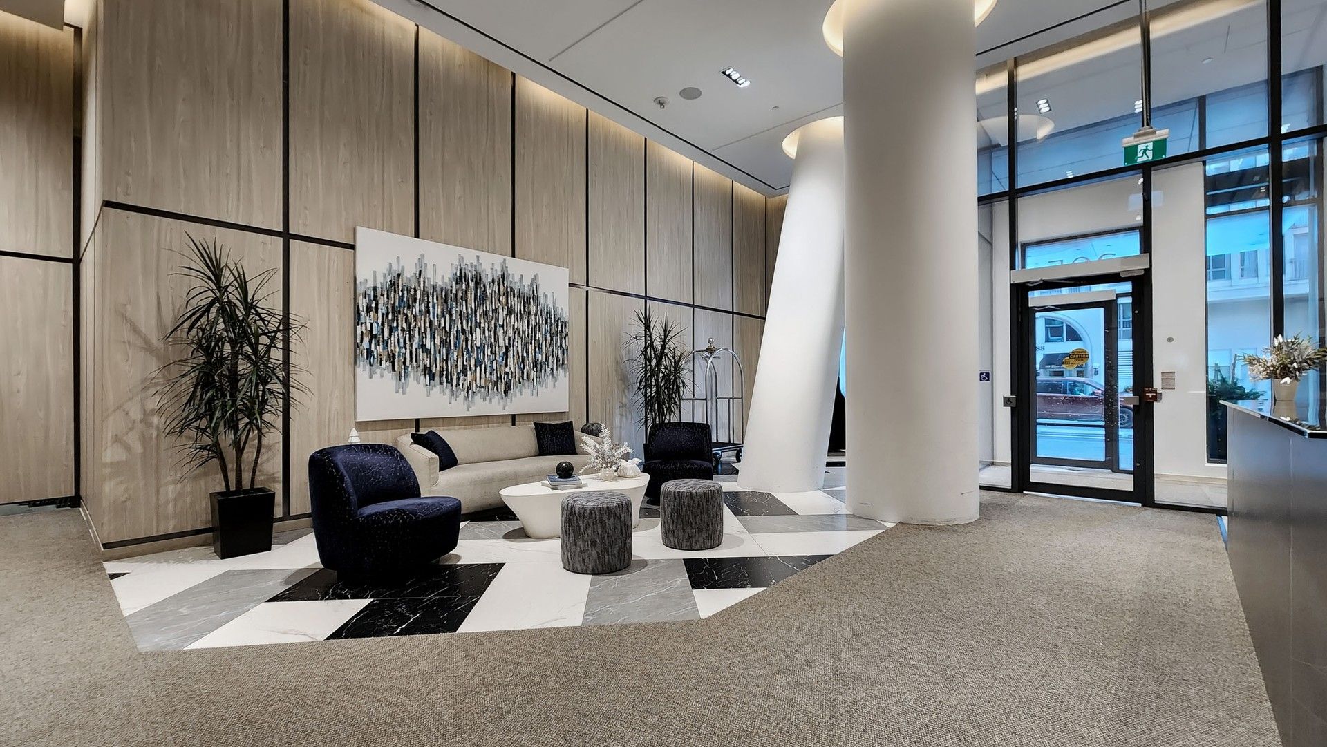• Building features include 24-hour concierge, fitness center, and rooftop terrace.