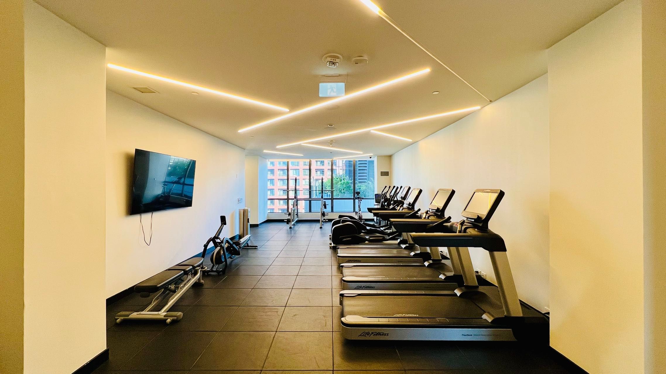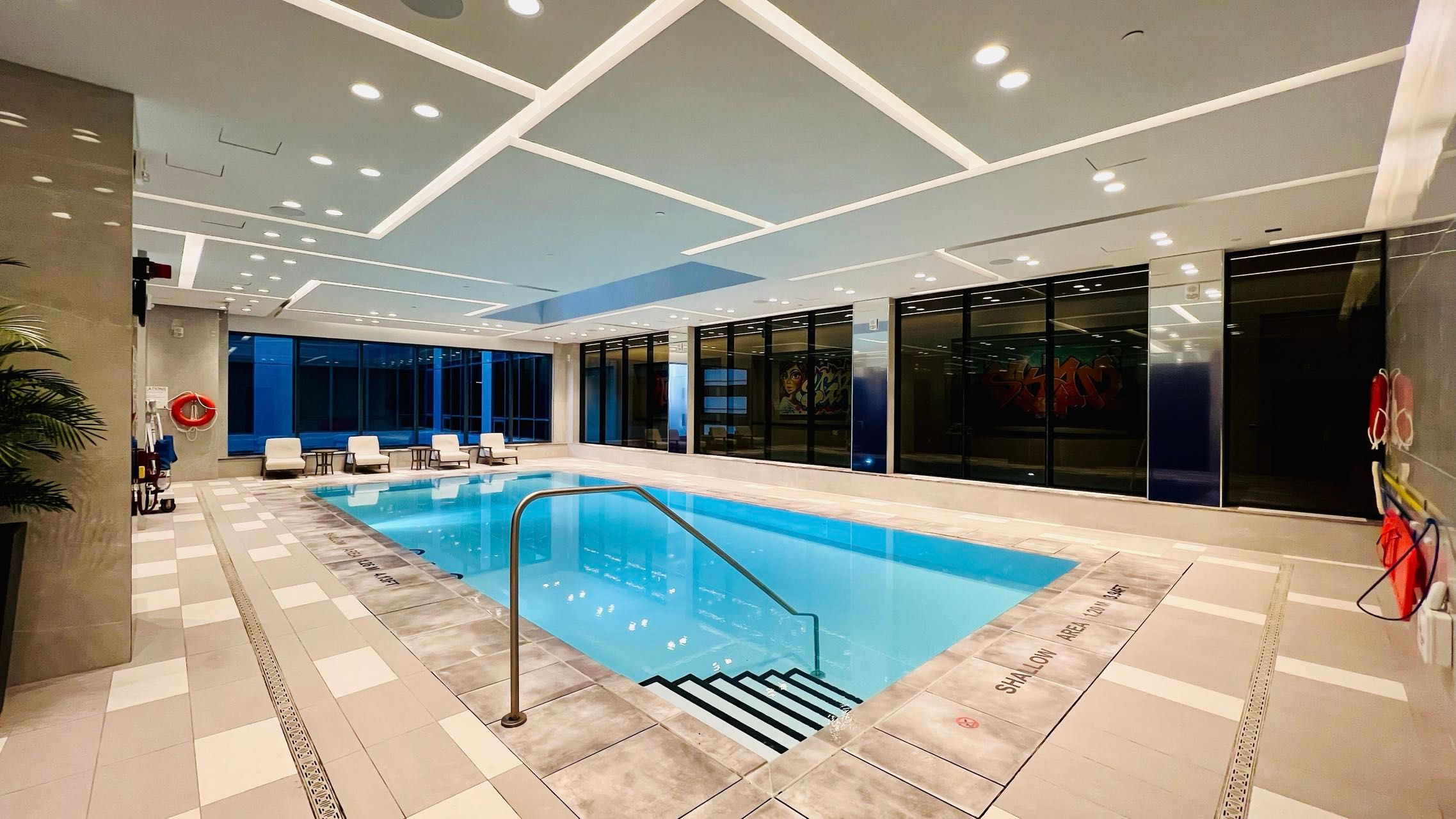 • Hotel-level amenities include a pool, gym, and rooftop BBQ patio.