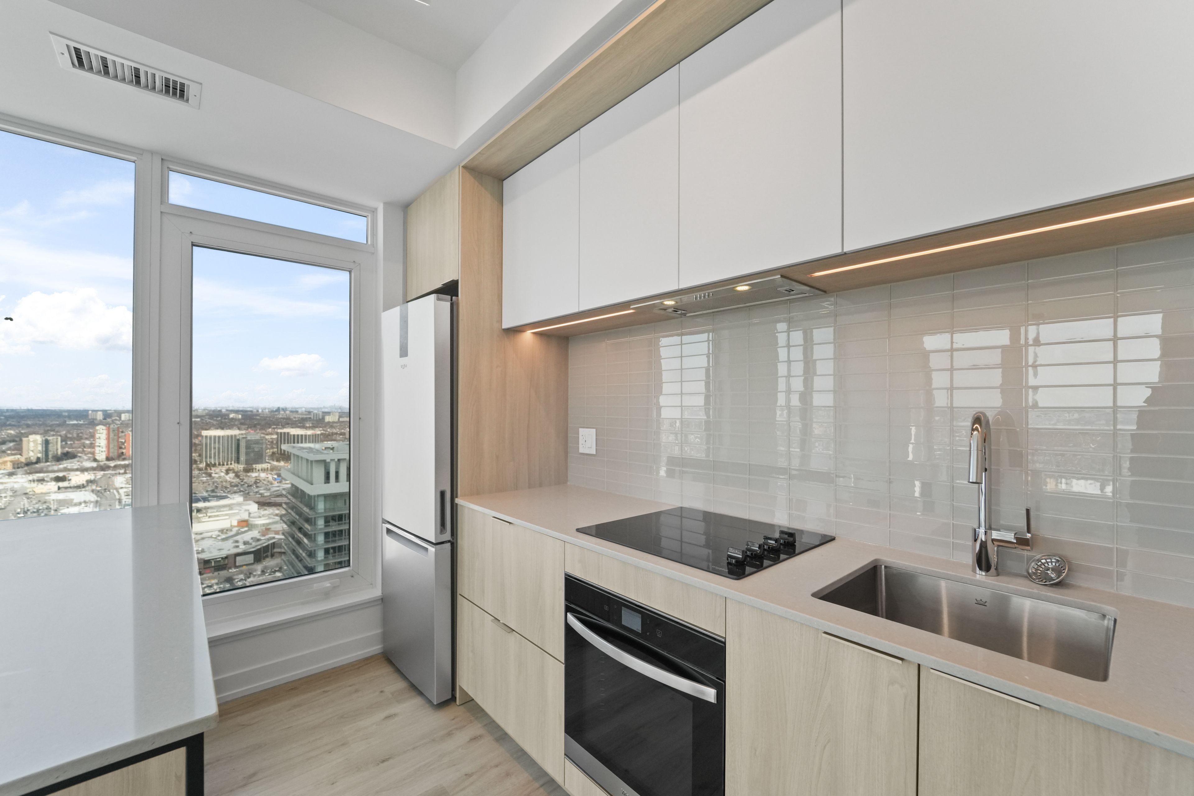 Welcome to this brand new, never-lived-in 2 bedroom, 2 full bathroom residence complete with parking featuring an ev charger and a locker, located in the heart of mississauga's vibrant square one district. Designed with both style and functionality in mind, this sun-filled suite offers an efficient open-concept layout with approximately 9-foot ceilings, smooth finished ceilings, and large windows that flood the space with natural light. The contemporary kitchen is thoughtfully appointed with custom european-inspired cabinetry, quartz countertops, integrated under-cabinet lighting, a tile backsplash, and stainless steel appliances, making it ideal for everyday living and entertaining alike. The living and dining areas flow seamlessly to create a welcoming atmosphere, while the bedrooms provide comfortable retreats. Modern bathrooms feature sleek vanities with integrated sinks, frameless mirrors, chrome fixtures, deep soaker tubs or glass-enclosed showers, and full-height tile surrounds. Laminate flooring runs throughout the main living areas, complemented by porcelain and ceramic tile in wet areas. Residents enjoy an exceptional collection of amenities, including a fully equipped fitness centre, rooftop terrace with panoramic views, basketball court, bbq area, kids' playroom, climbing wall, meditation room, sauna, and 24-hour concierge and security. Steps to square one shopping centre, sheridan college, celebration square, transit hub, go transit, and the future lrt, with quick access to highways 403, 401, and qew. Move-in ready and impeccably located-an outstanding opportunity for end-users and investors alike.