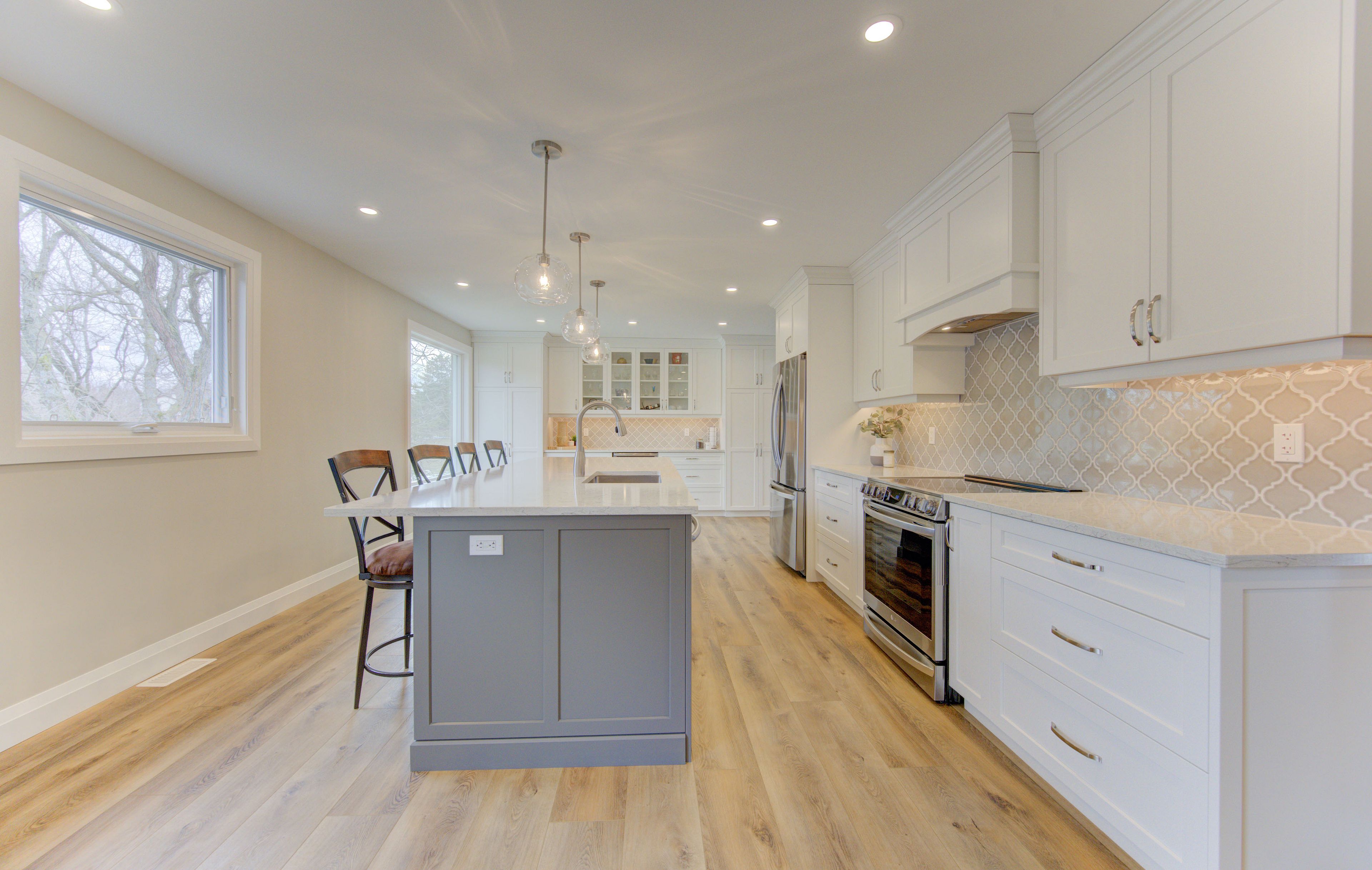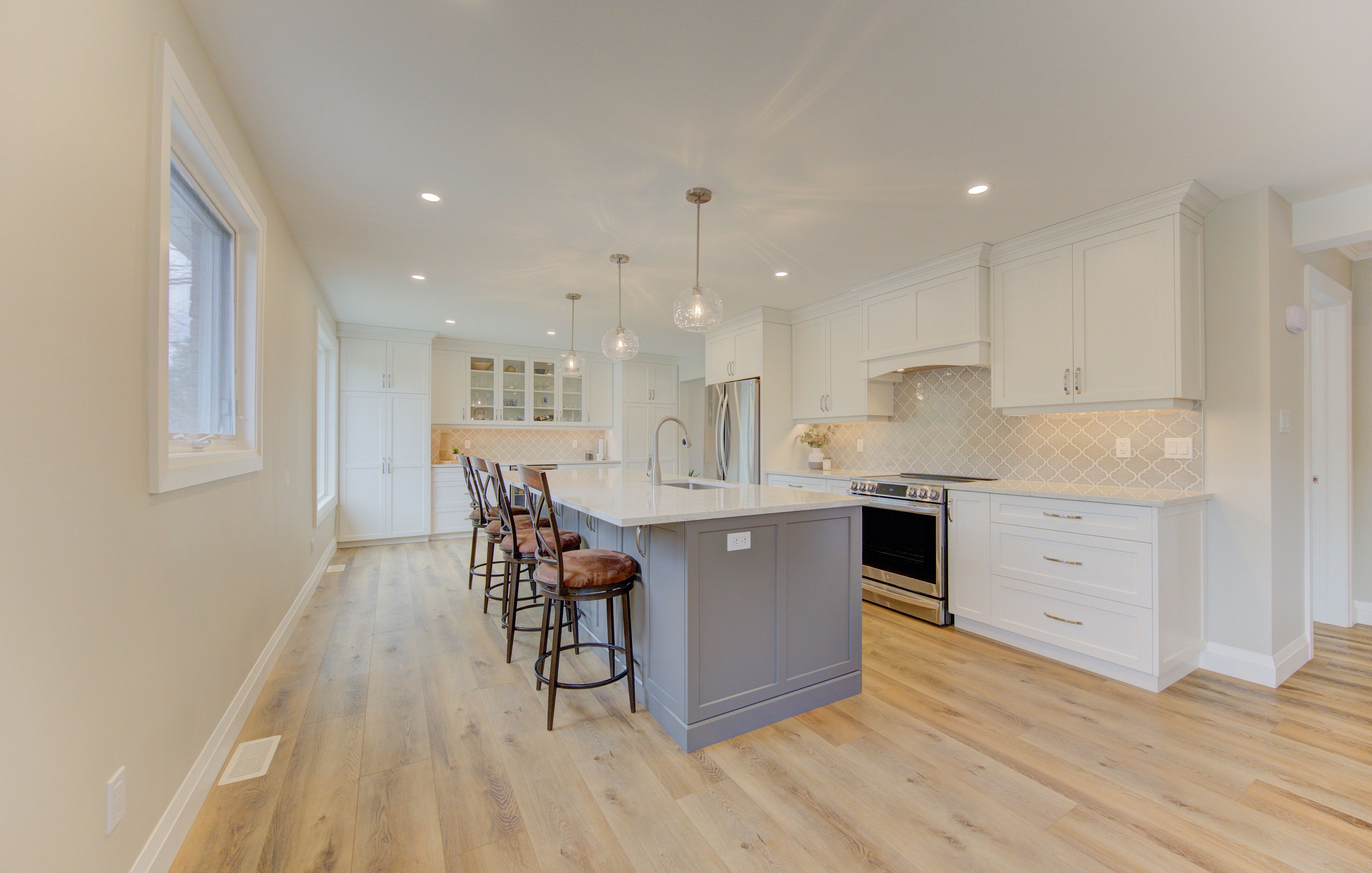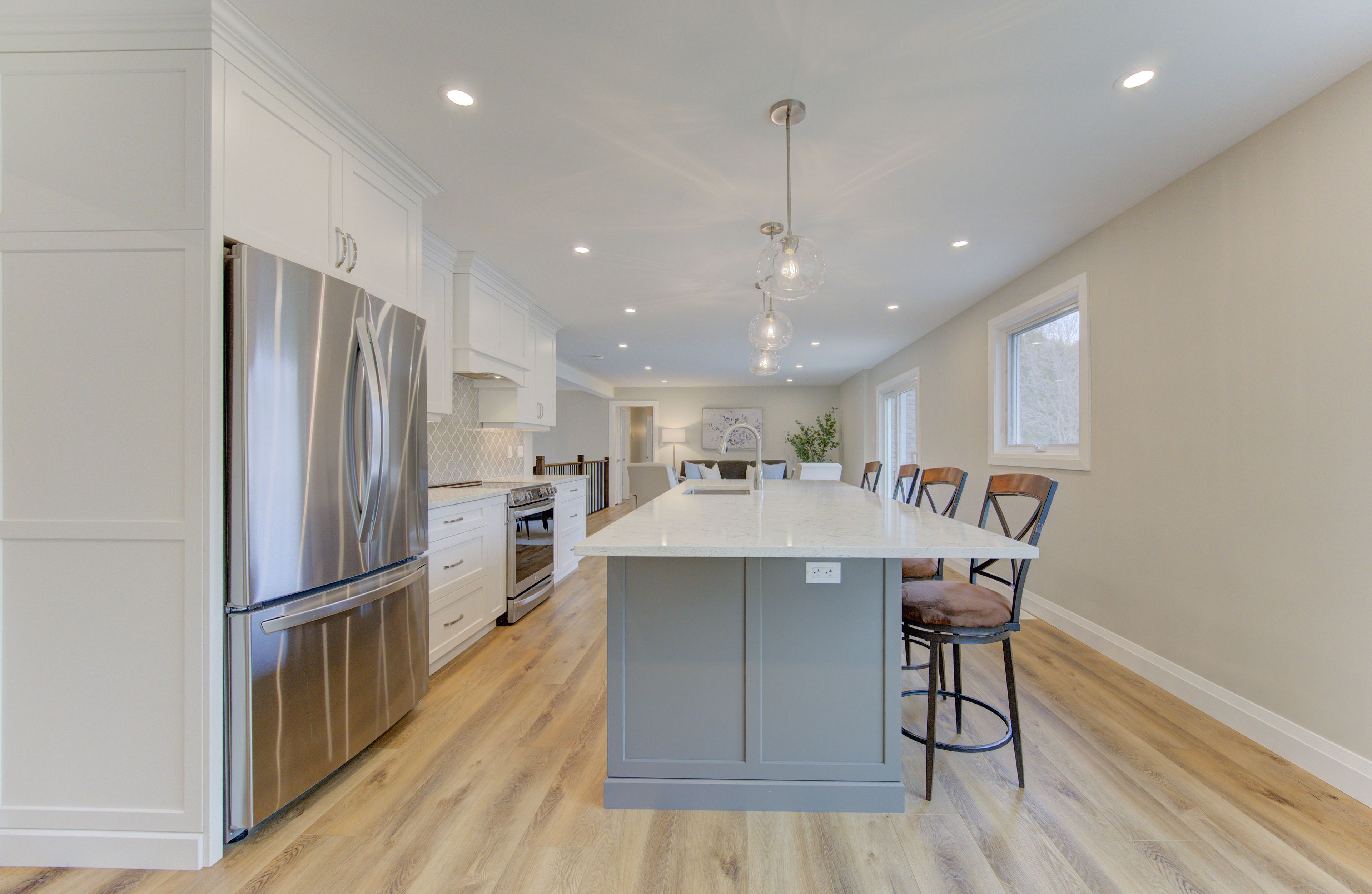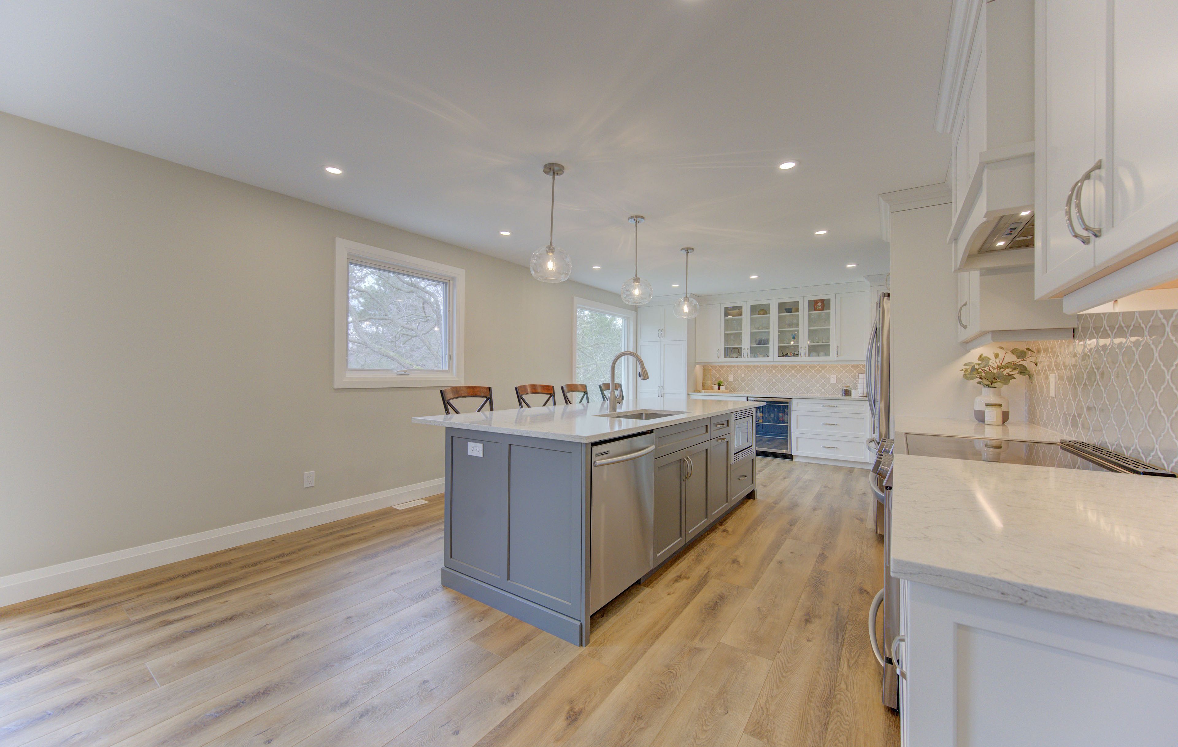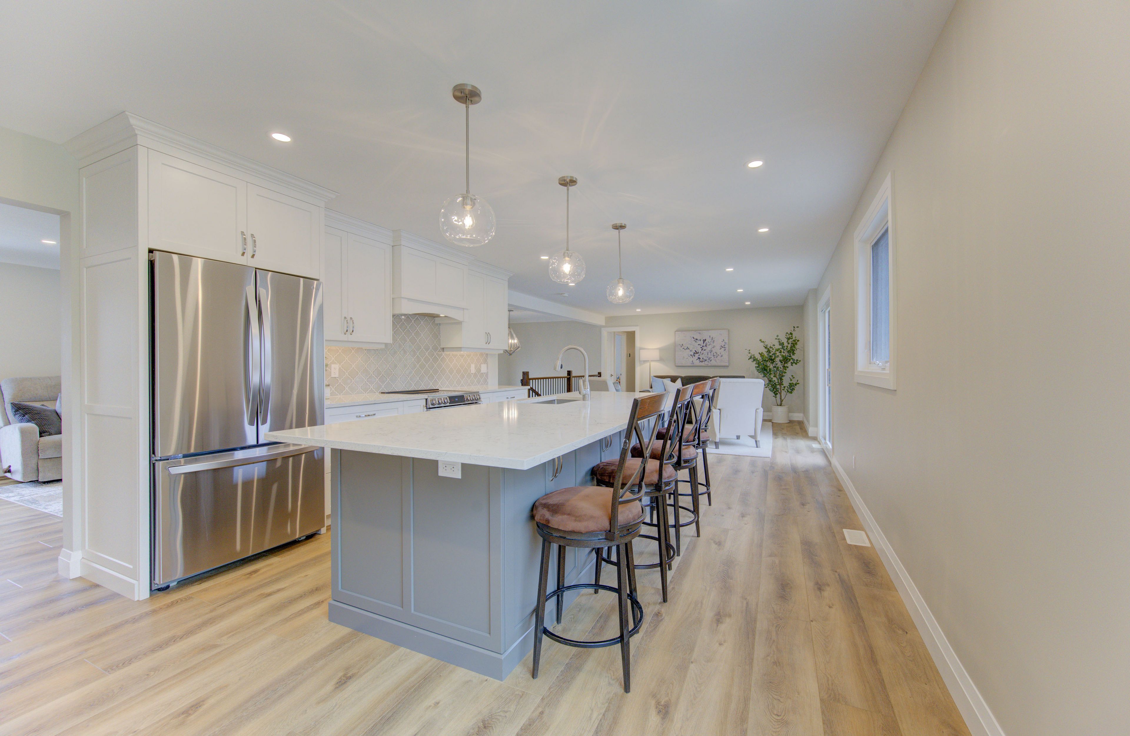 • Stunning kitchen with large island, stainless steel appliances, and ample storage.